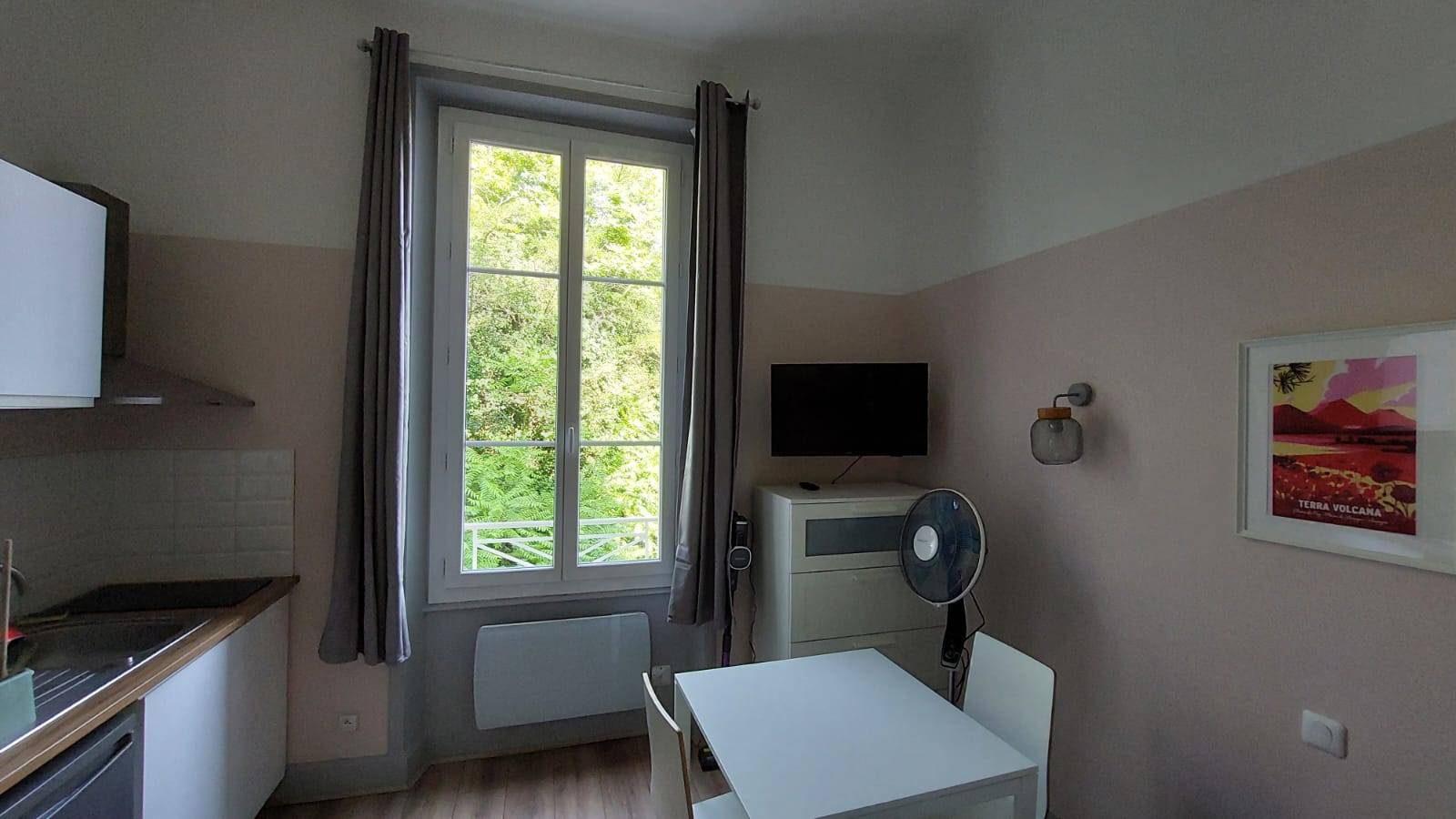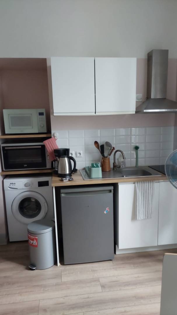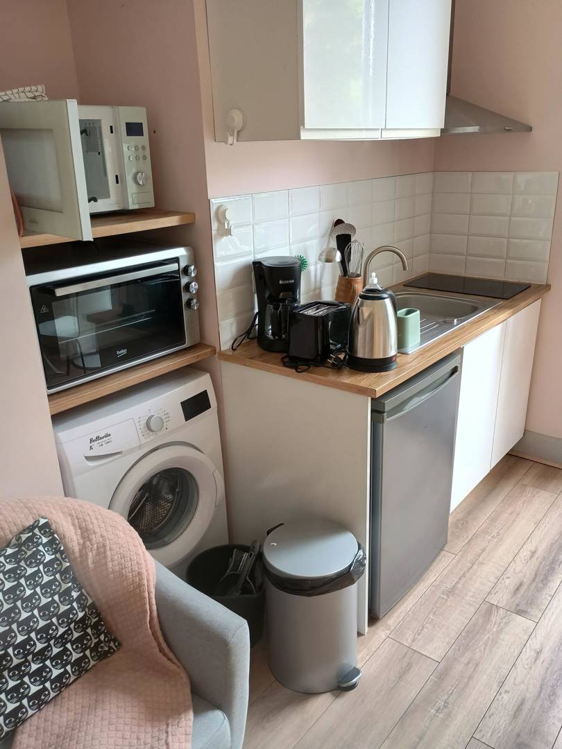 Logement composé d’une pièce principale avec lit de 140cm, TV, fauteuil, table et 2 chaises, kitchenette toute équipée (réfrigérateur, plaques de cuisson induction, four, micro onde, cafetière filtre, grille pain, bouilloire), machine à laver, ventilateur, aspirateur balai.