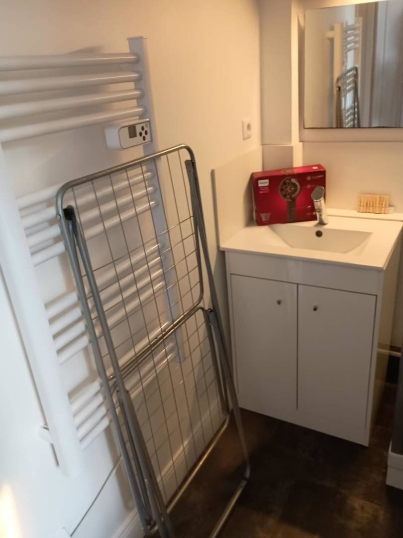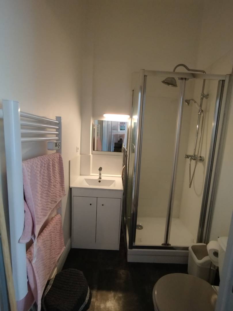 Salle de bain avec douche et WC, sèche serviette, sèche cheveux.