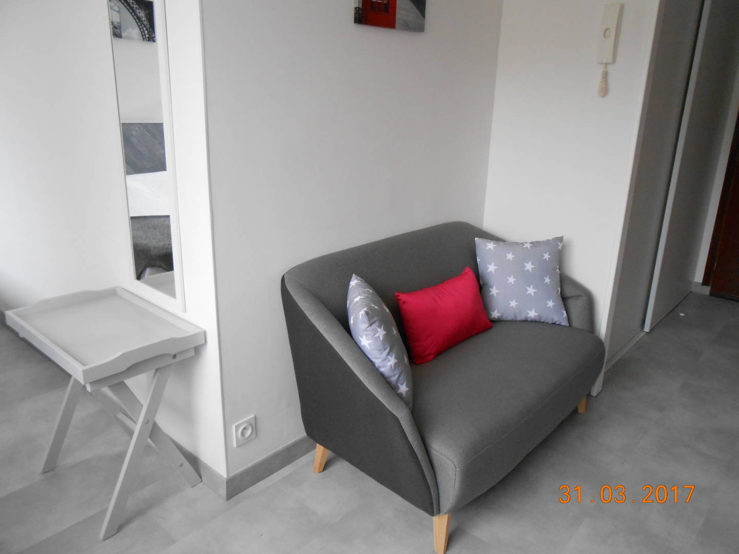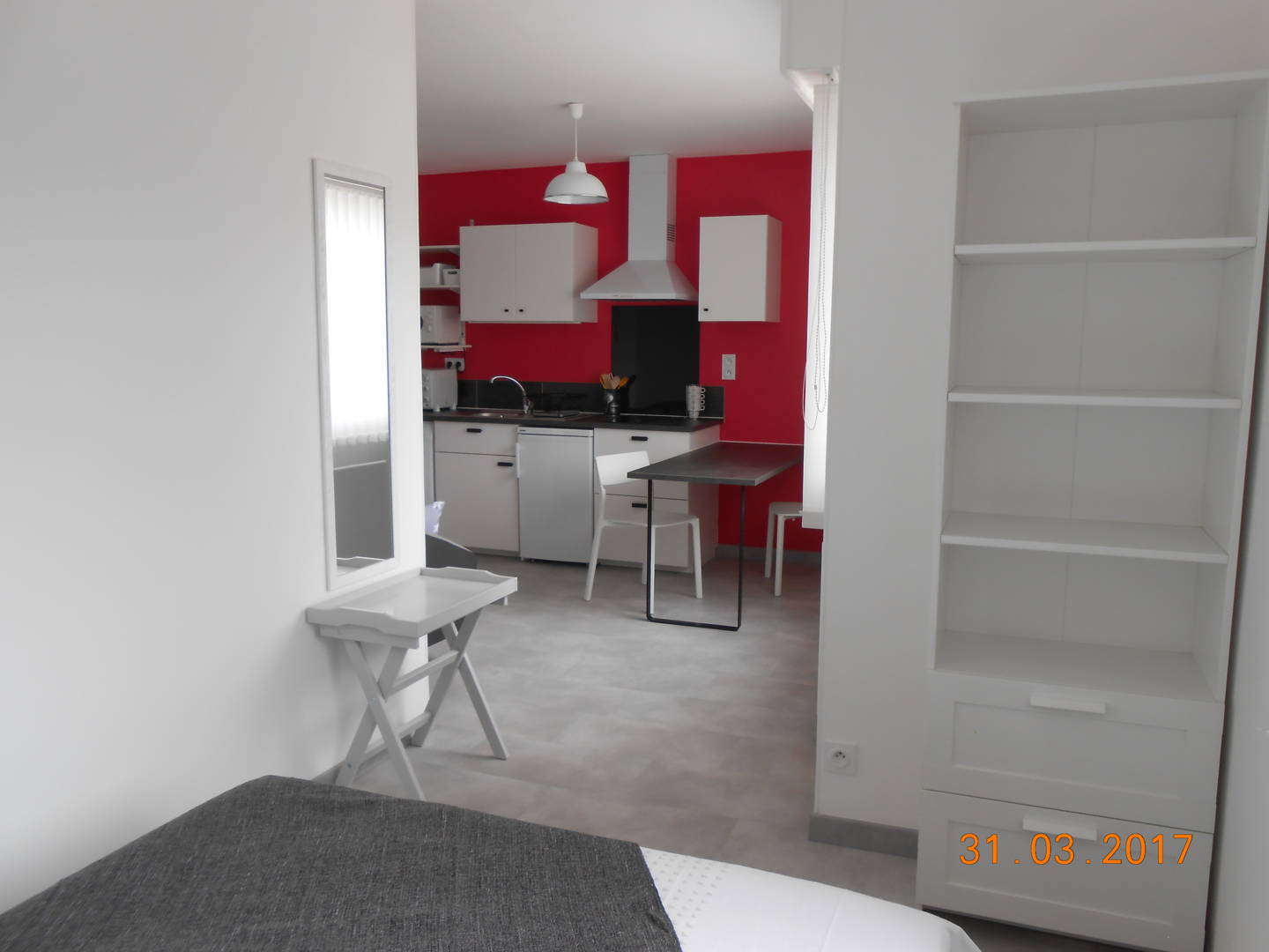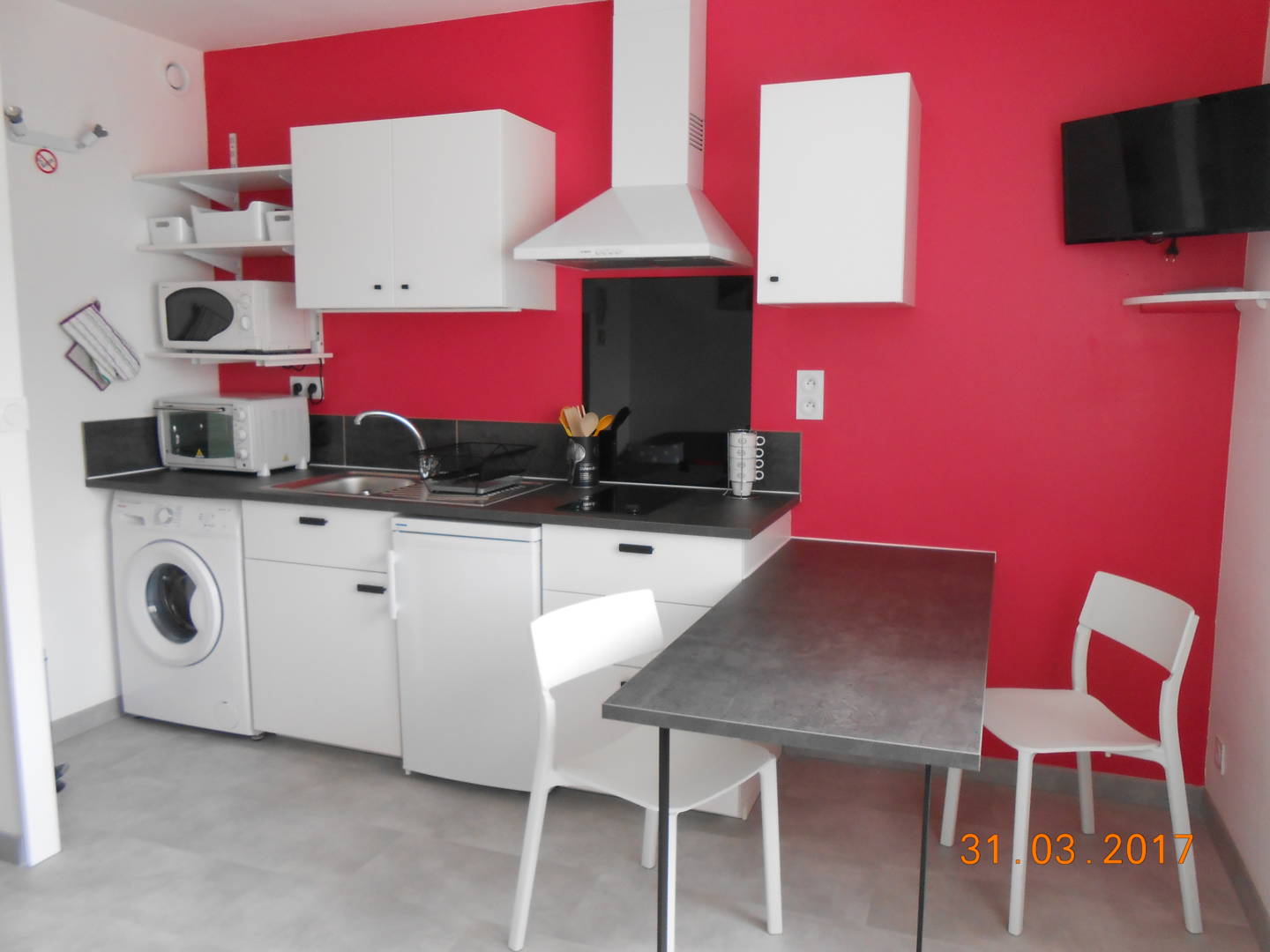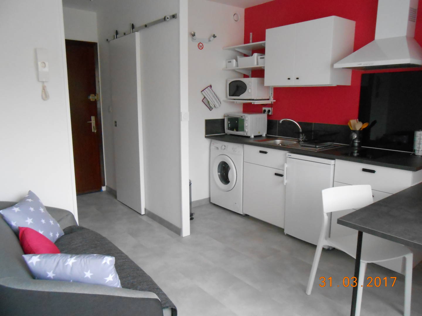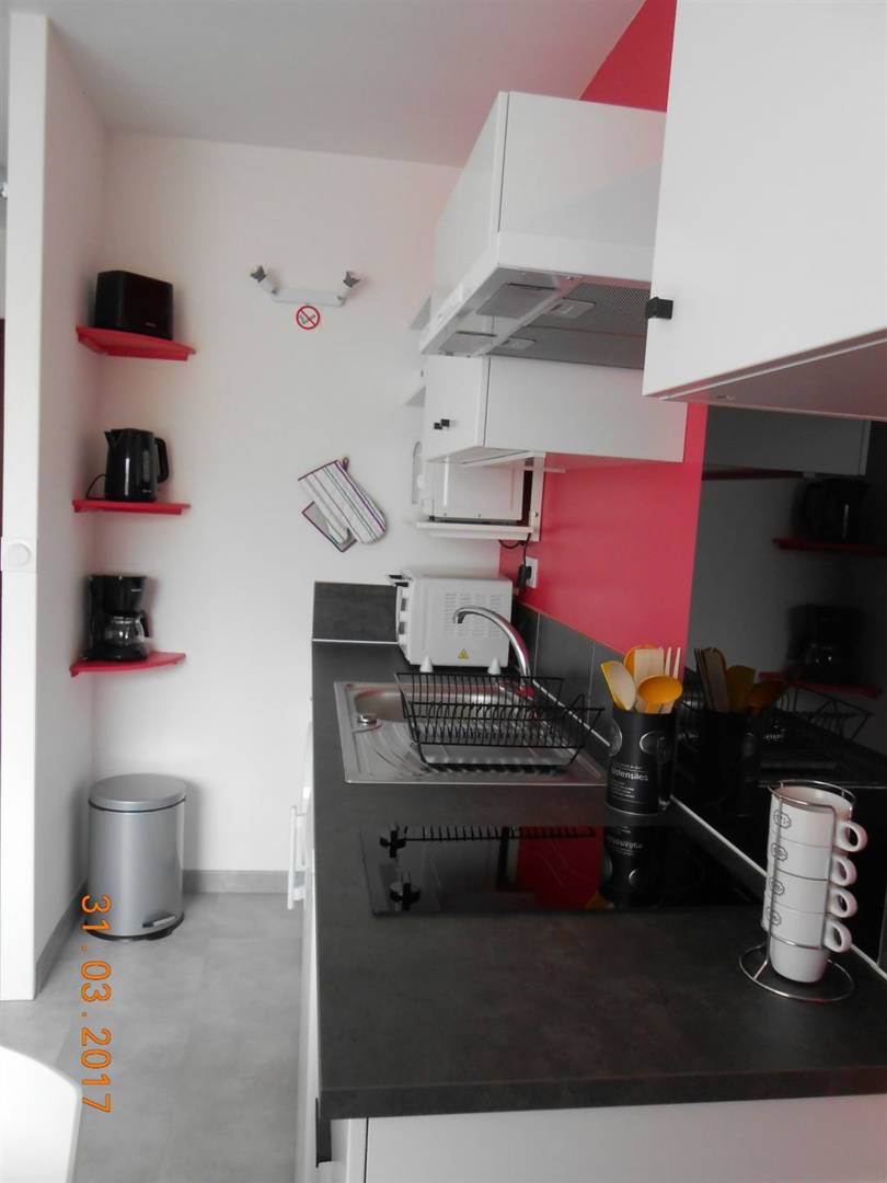 Il se compose d’une pièce principale avec un coin cuisine (mini-four, micro-onde), d’un coin nuit avec un lit 2 personnes (lit fait à l’arrivée si location draps) et d’une salle d’eau. Télévision écran plat et Wifi. Lave linge. Parking privé. Cave fermée (pour vélos).