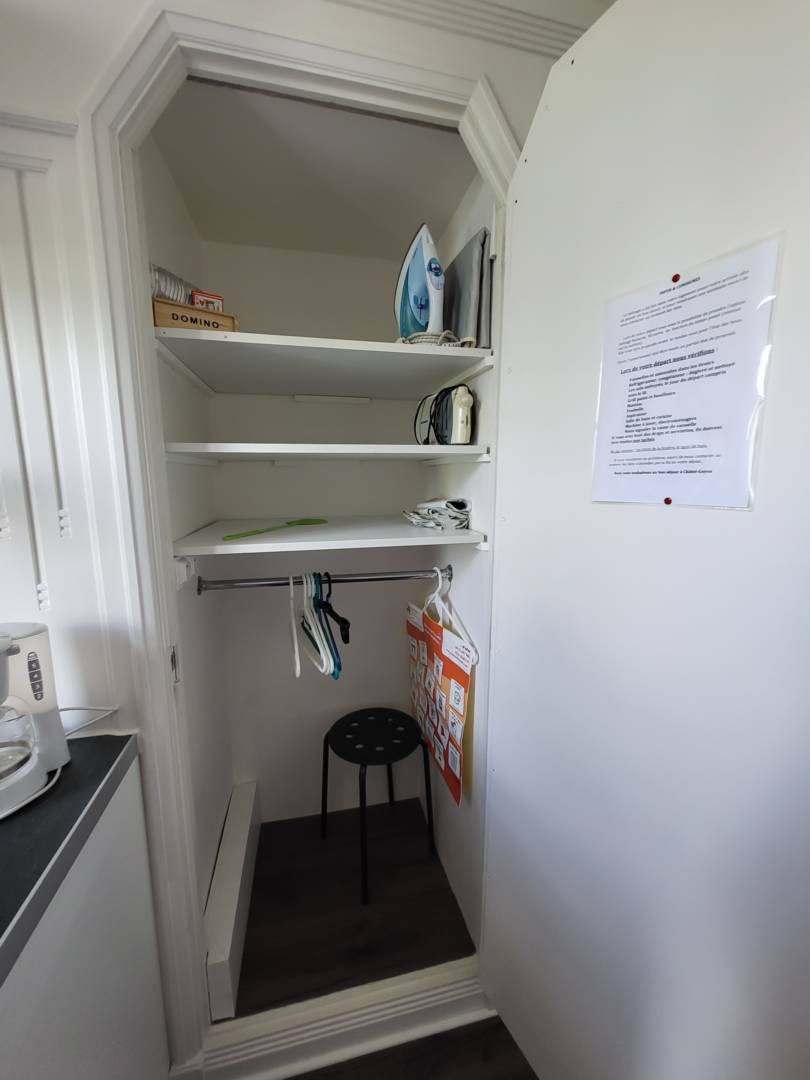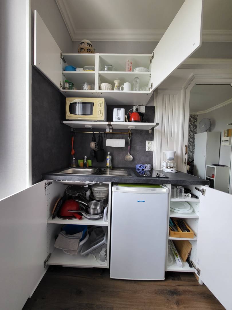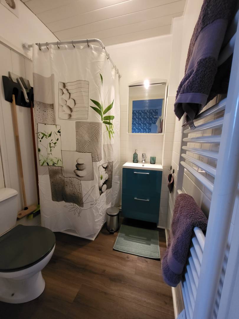Pièce principale composée d’un coin cuisine. Réfrigérateur congélateur, micro-onde, deux plaques électriques, ustensiles de cuisine complet, d’un lit 1 personne (120×190), un fauteuil, une TV, une box pour la Wifi et d’une salle d’eau.