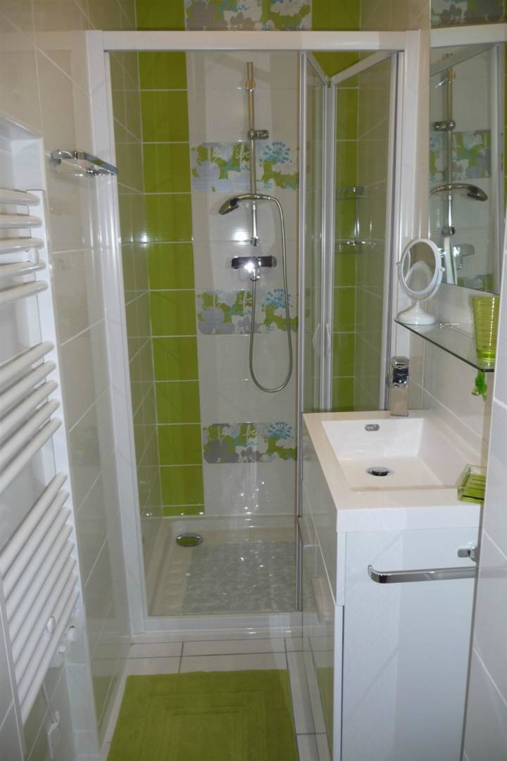 Salle d’eau avec cabine de douche en dur et sèche serviettes électrique et VMC.