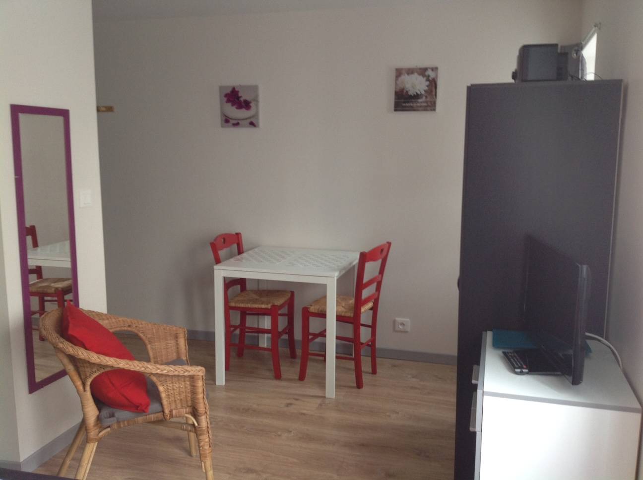 Studio 21 m² pour 1 à 2 personnes situé au rez de chaussée surélevé de la résidence. Pièce principale (lit 2 personnes, table et chaises, télévision…) avec coin cuisine (réfrigérateur-congélateur, four et micro-onde) et salle d’eau séparée, Wifi gratuit. Lave-linge et sèche-linge collectifs. Grande terrasse commune aménagée et Parking. Les animaux sont acceptés après accord préalable du propriétaire sans supplément tarifaire.