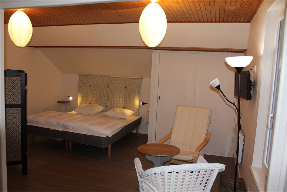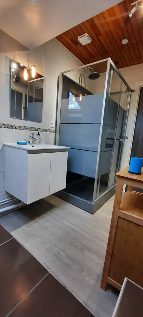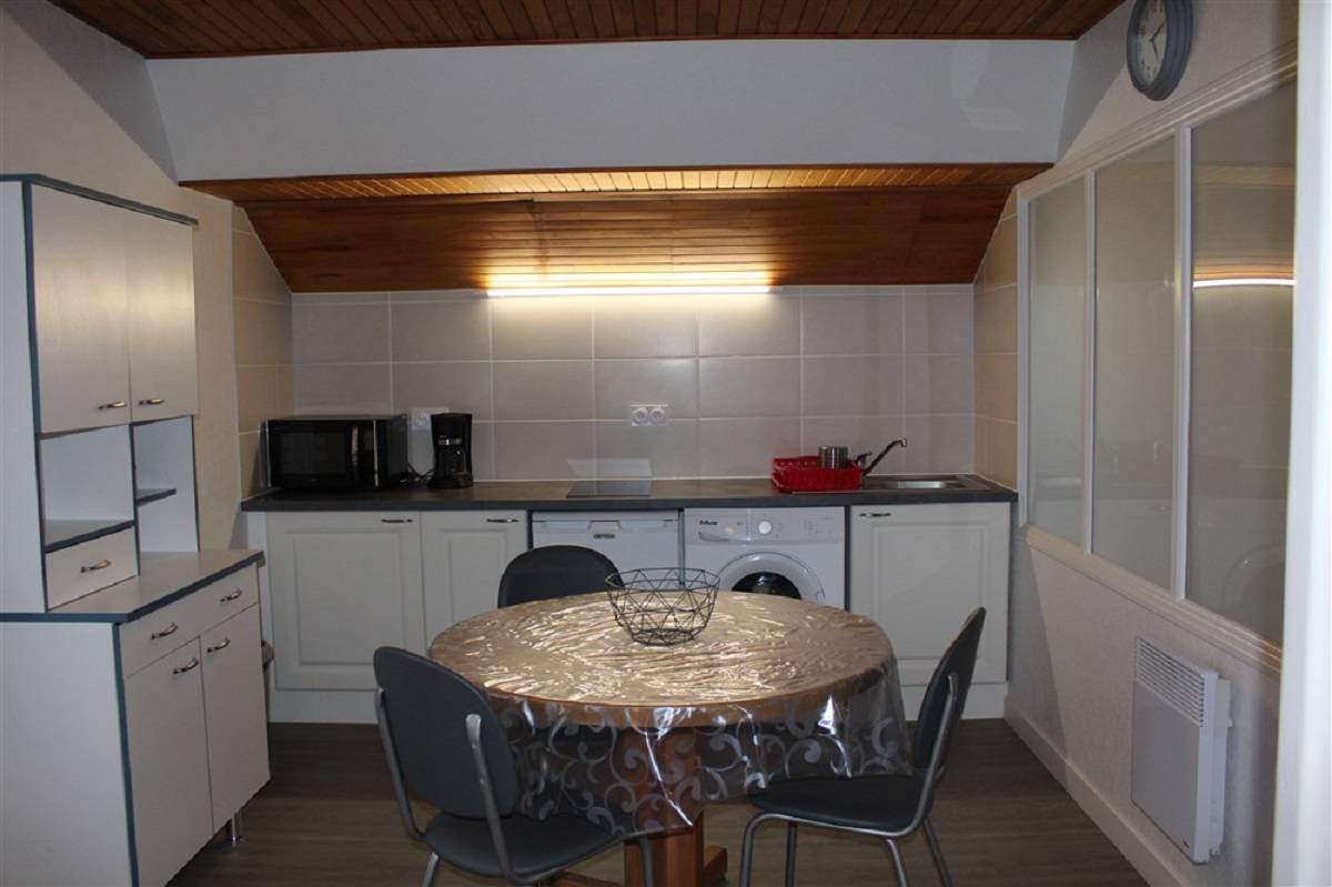 Cuisine toute équipée avec machine à laver privative, coin repas et coin salon avec fauteuils et télévision, accès Wifi sans supplément. Coin nuit avec 2 lits jumeaux de 90cm. Grande salle de bain avec douche et WC. Appartement au 1er étage de la maison et situé à 500(…)