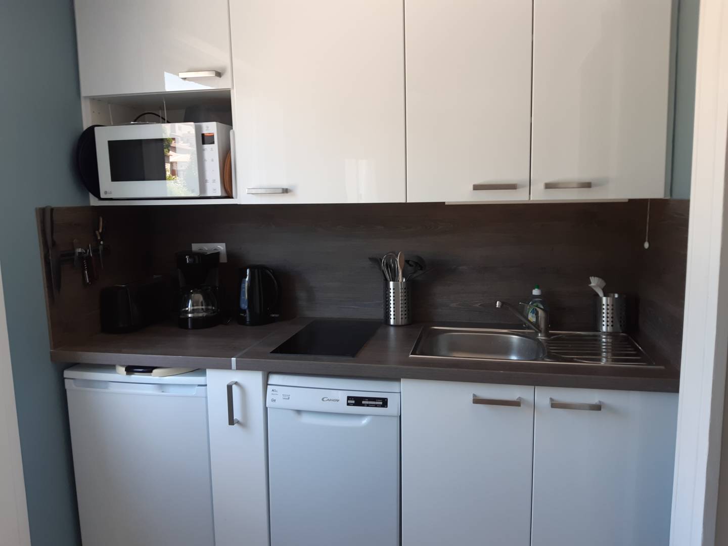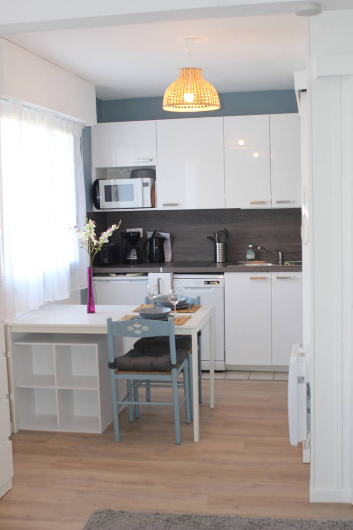 – un coin cuisine avec cuisine intégrée (2 plaques à induction, lave-vaisselle, réfrigérateur, four à micro-ondes, cafetière électrique, bouilloire, grille-pain), grande table,