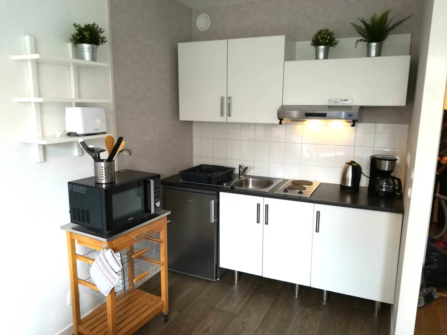 Kitchenette avec plaques électriques, four multi-fonctions, grille-pain, bouilloire, cafetière, petit frigo-congélateur avec même un petit nécessaire de base (café, thé, sucre, sel, poivre), vaisselle et équipements de cuisine complets,