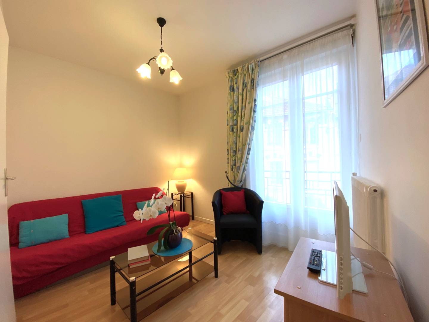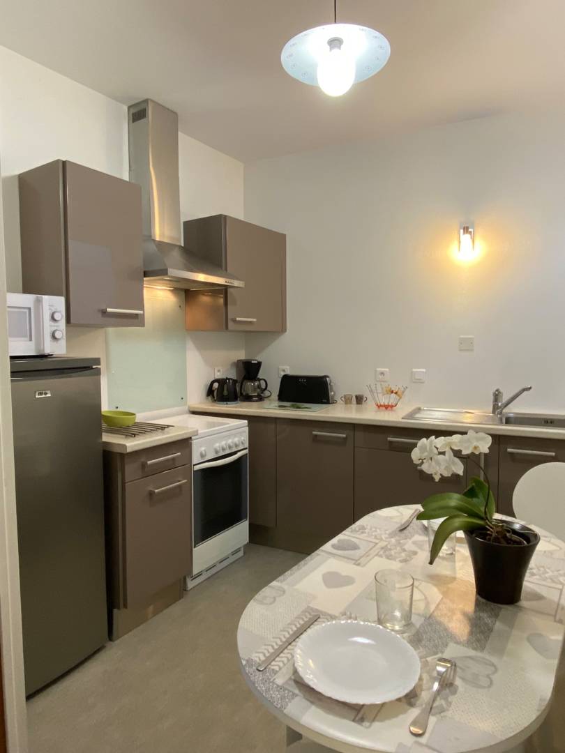 Appartement 32 m² de 1 à 2 personnes situé au 1er étage d’une résidence sans ascenseur comprenant 7 locations sur 2 étages. Résidence face à la Poste et à proximité des thermes.