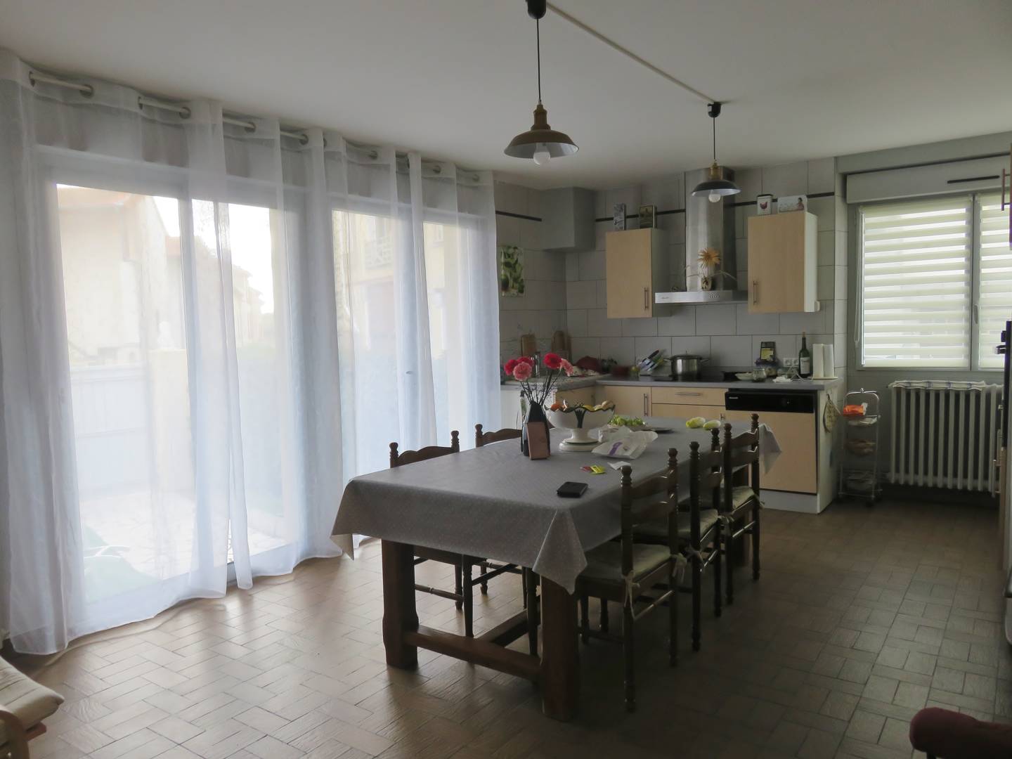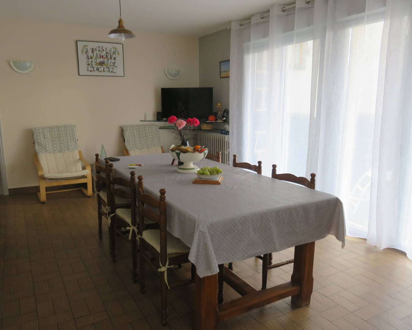 Appartement au rez de chaussée avec une grande pièce salle a manger, un salon et une cuisine. Une grande chambre avec un lit 140 et une deuxième avec un BZ. Une salle de bain, des wc, une pièce chaufferie et une cour extérieure fermée.