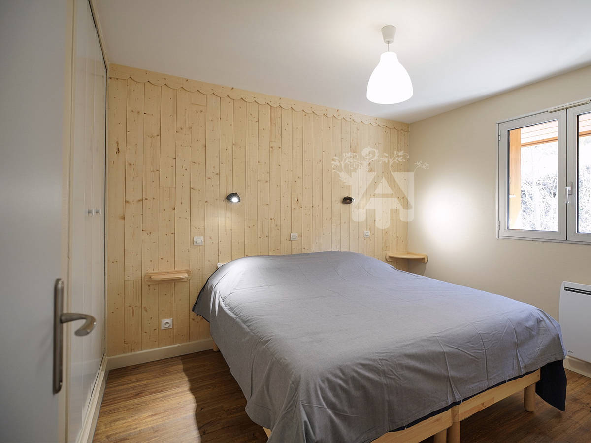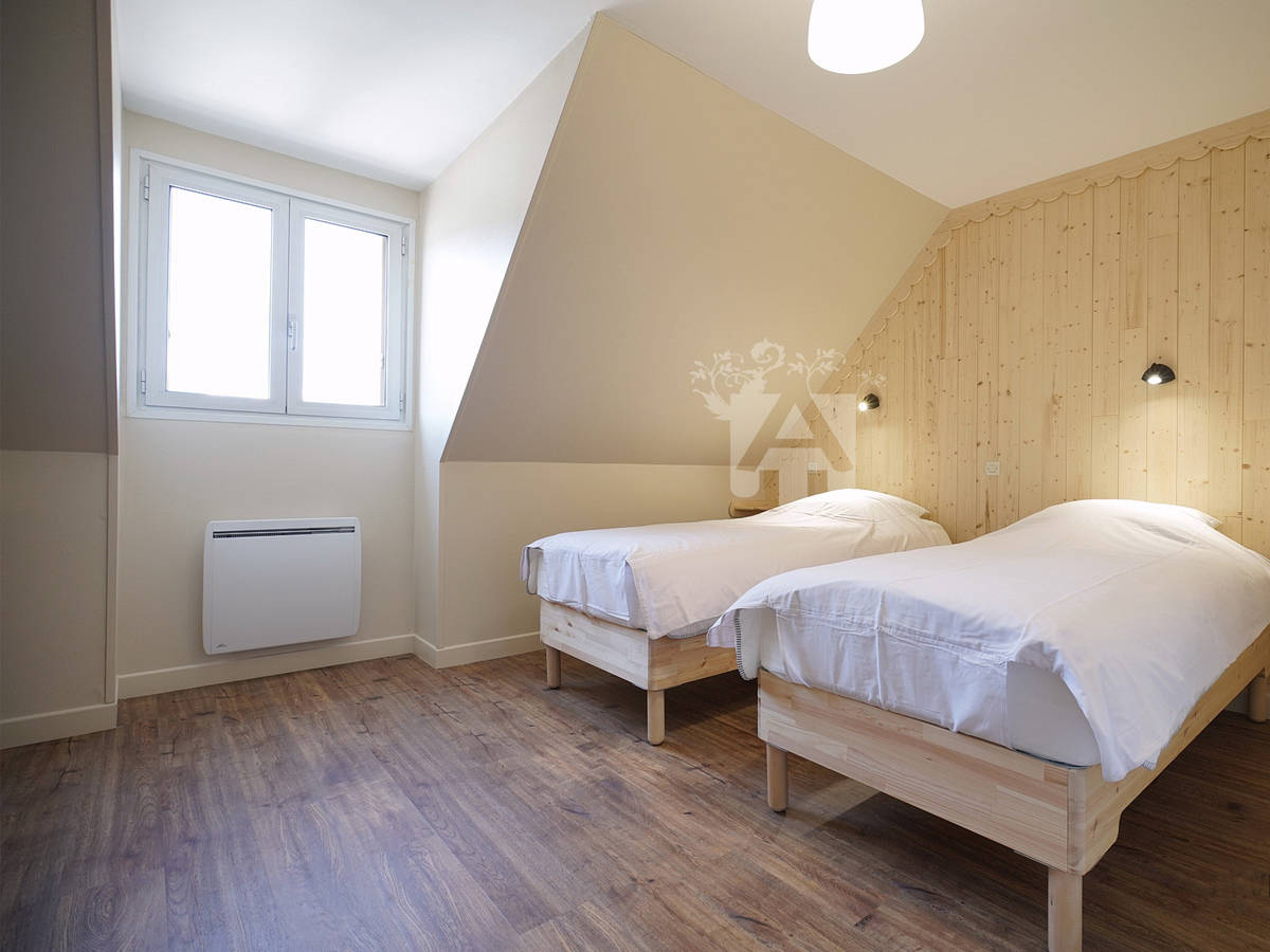 A l’étage, un palier dessert les 2 chambres. La première chambre est équipée d’un lit double de 160 cm avec salle d’eau. La deuxième chambre se compose de 2 lits simples de 90 cm chacun.