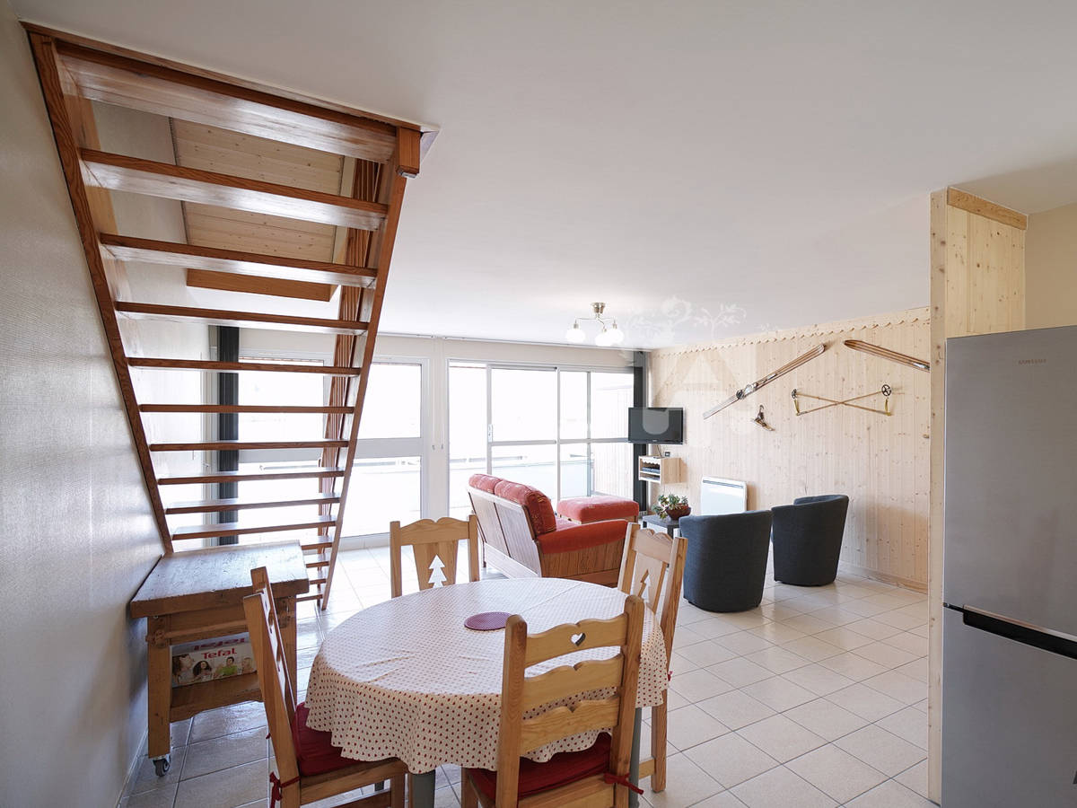 L’appartement se présente de la manière suivante : Au rez-de-chaussée, vous trouverez un salon/salle à manger avec canapé, 2 fauteuils, table basse, TV avec décodeur TNT, table et chaises pour 4 personnes ainsi qu’une cuisine ouverte et équipée (four, réfrigérateur avec compartiment congélateur, lave-vaisselle, micro-onde, cafetière, bouilloire, grille-pain, appareil à raclette, vaisselle et ustensiles de cuisine, lave-linge. Un WC complète cet espace.
