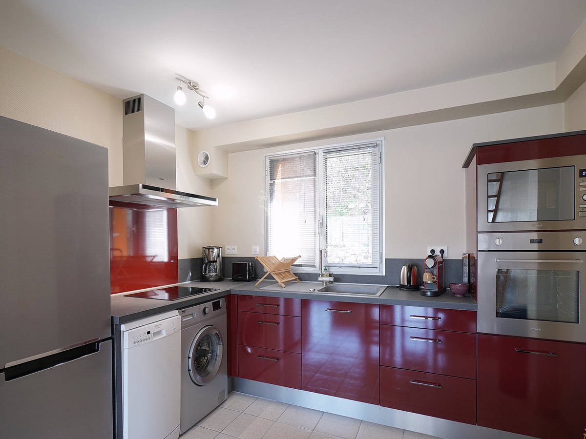 L’appartement se présente de la manière suivante : Au rez-de-chaussée, vous trouverez un salon/salle à manger avec canapé, 2 fauteuils, table basse, TV avec décodeur TNT, table et chaises pour 4 personnes ainsi qu’une cuisine ouverte et équipée (four, réfrigérateur avec compartiment congélateur, lave-vaisselle, micro-onde, cafetière, bouilloire, grille-pain, appareil à(…)