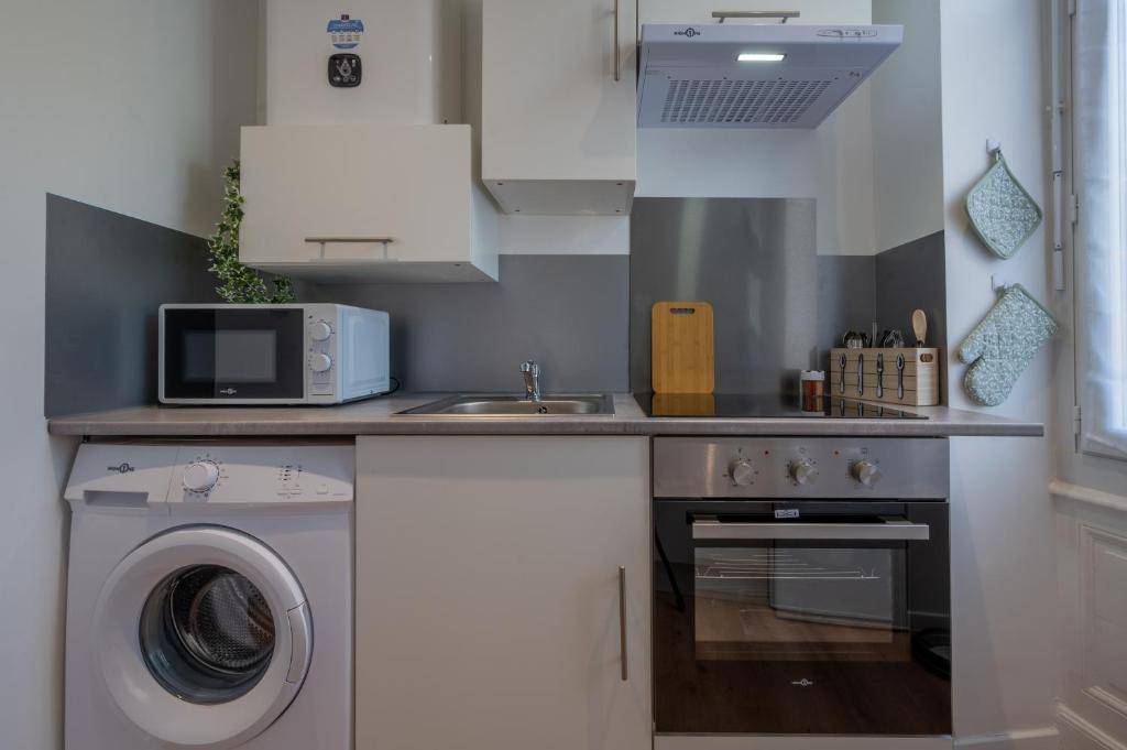 Logement de 27 m² tout blanc, refait à neuf, très lumineux avec un lit de 140×190, TV, box wifi, machine à laver, lave vaisselle.