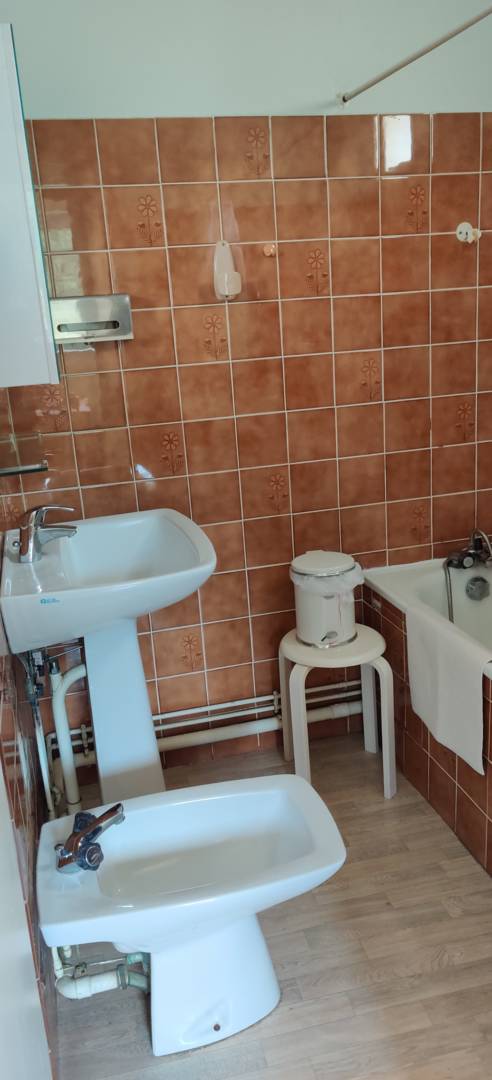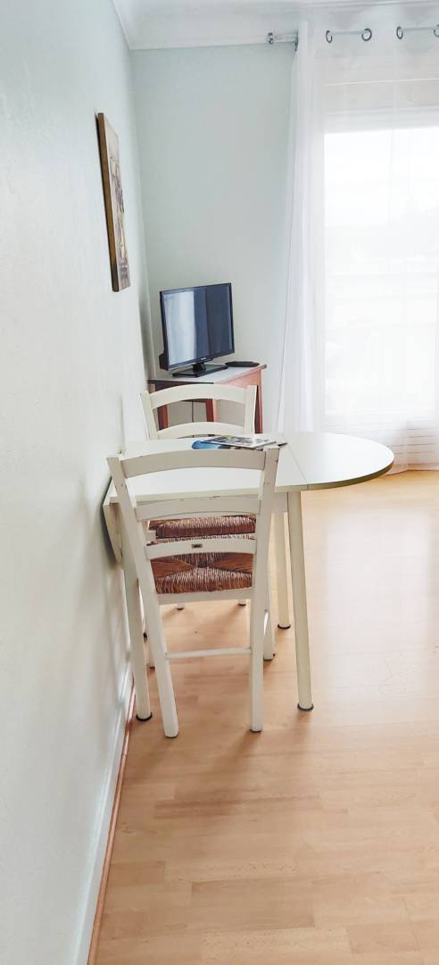 L’appartement n°23 est un studio situé au 2ème étage. Il se compose de : – une pièce de vie avec 1 lit en 140, un coin salon avec TV et un coin repas, – une cuisine séparée équipée avec réfrigérateur, plaques, four, … et un coin repas – une salle de bain avec baignoire, – un wc séparé – un balcon avec salon de jardin et parasol