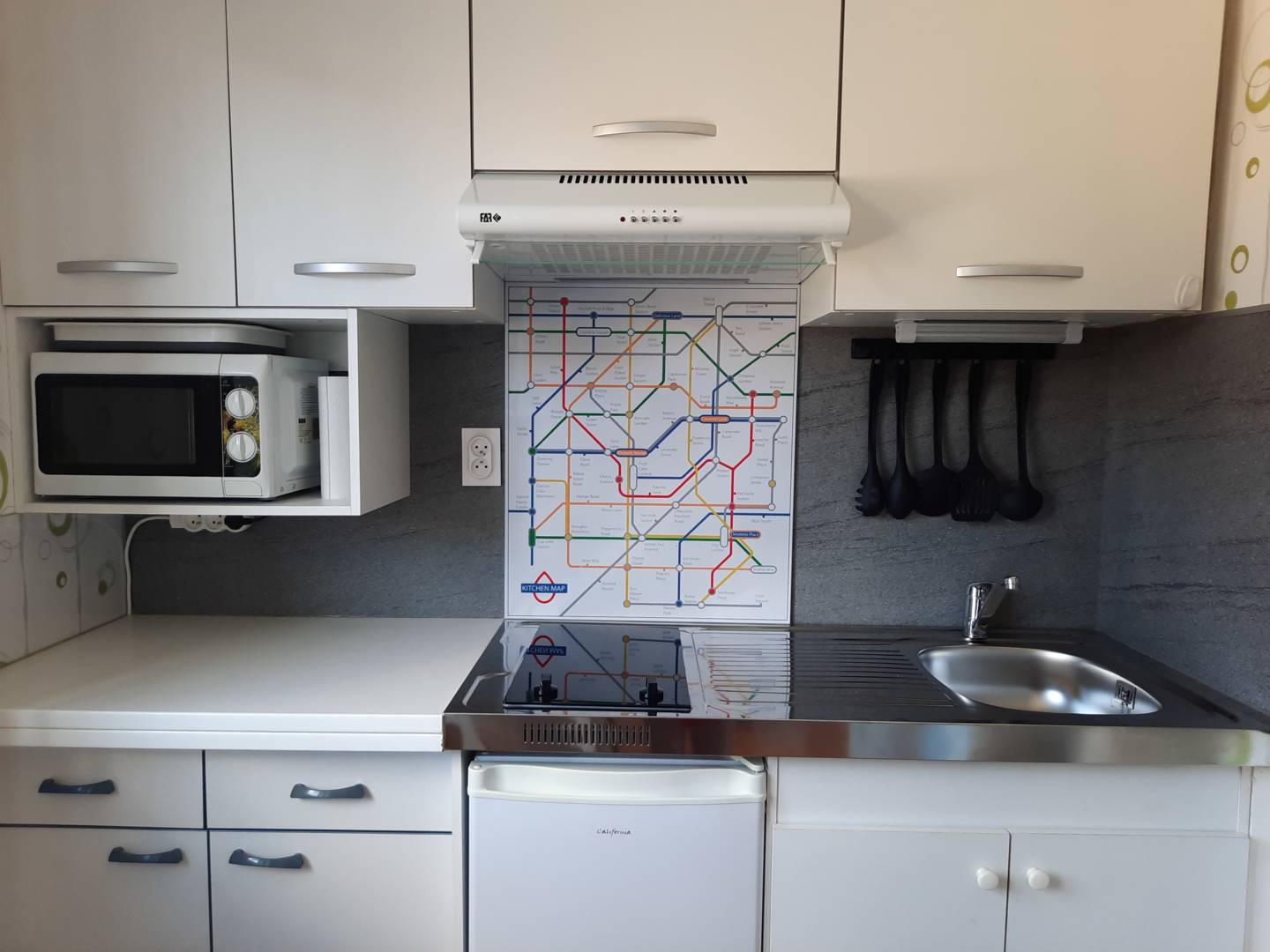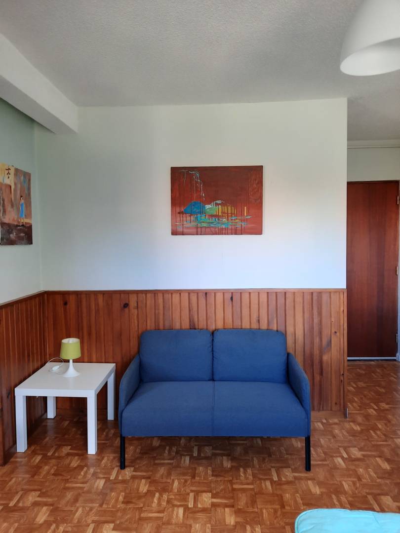 Il comprend une pièce principale avec un espace « entrée » placard, un espace nuit: lit 2 places de 140×190, avec tablettes et lampes de chevet, un espace salon avec canapé et table basse, et un coin cuisine intégrée: plaques à induction, réfrigérateur, four à micro ondes, cafetière électrique, bouilloire, grille pain.