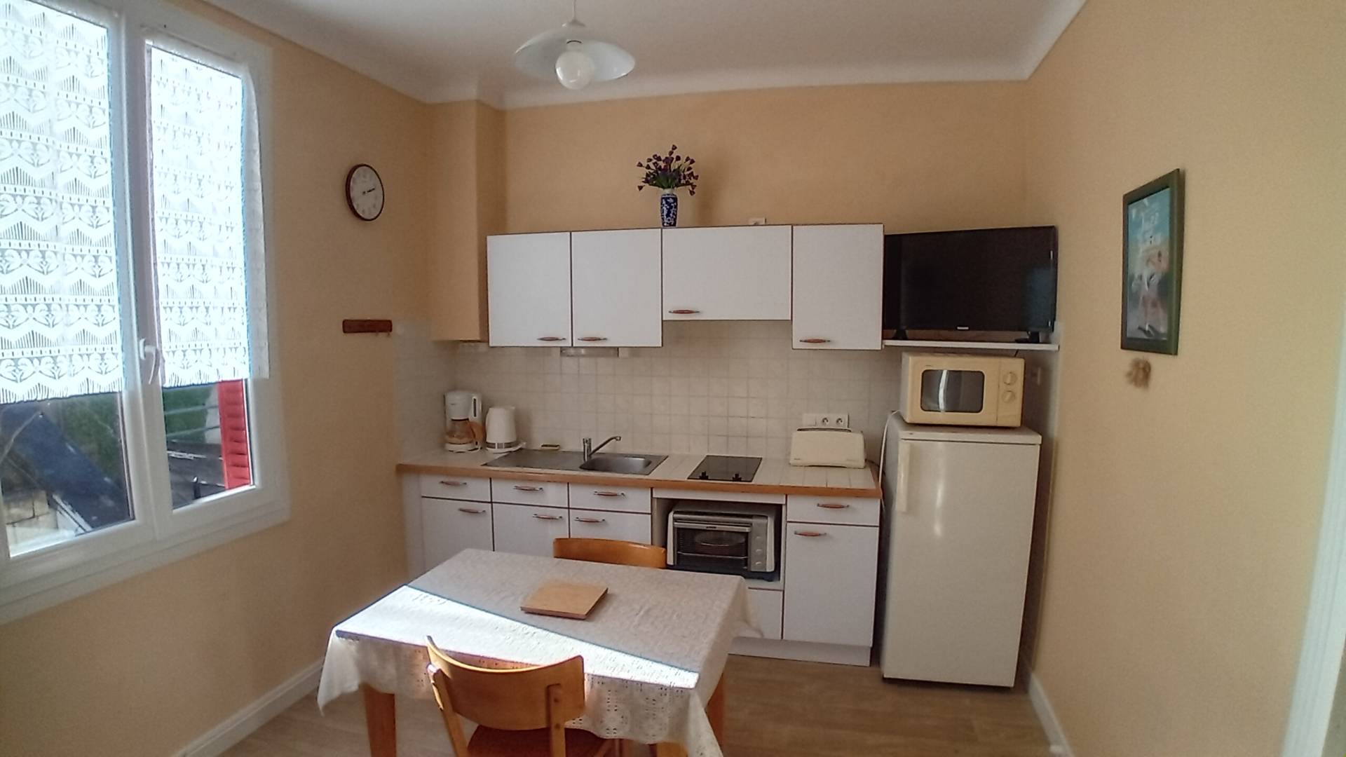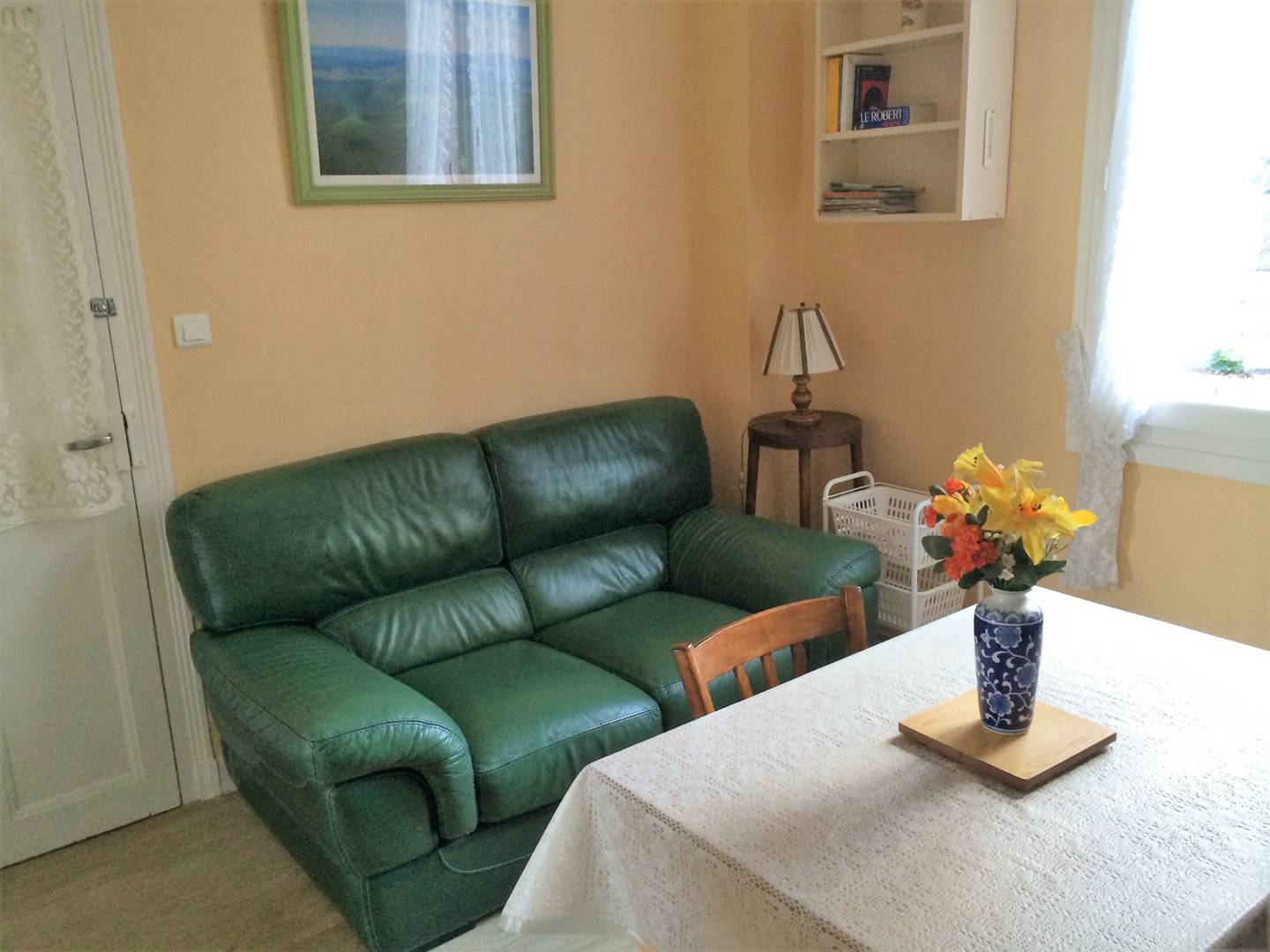 Propre et fonctionnel, il est accessible par la rue Alfred Punett, en contrebas de celle-ci, 18 marches séparent le trottoir du palier. il est composé de deux pièces, la cuisine-séjour côté jardin, et de la chambre côté parc. Très lumineux, et agréable à vivre, il est proche du cœur de la ville, du parc, du marché dominical et des Thermes Aïga (550m).