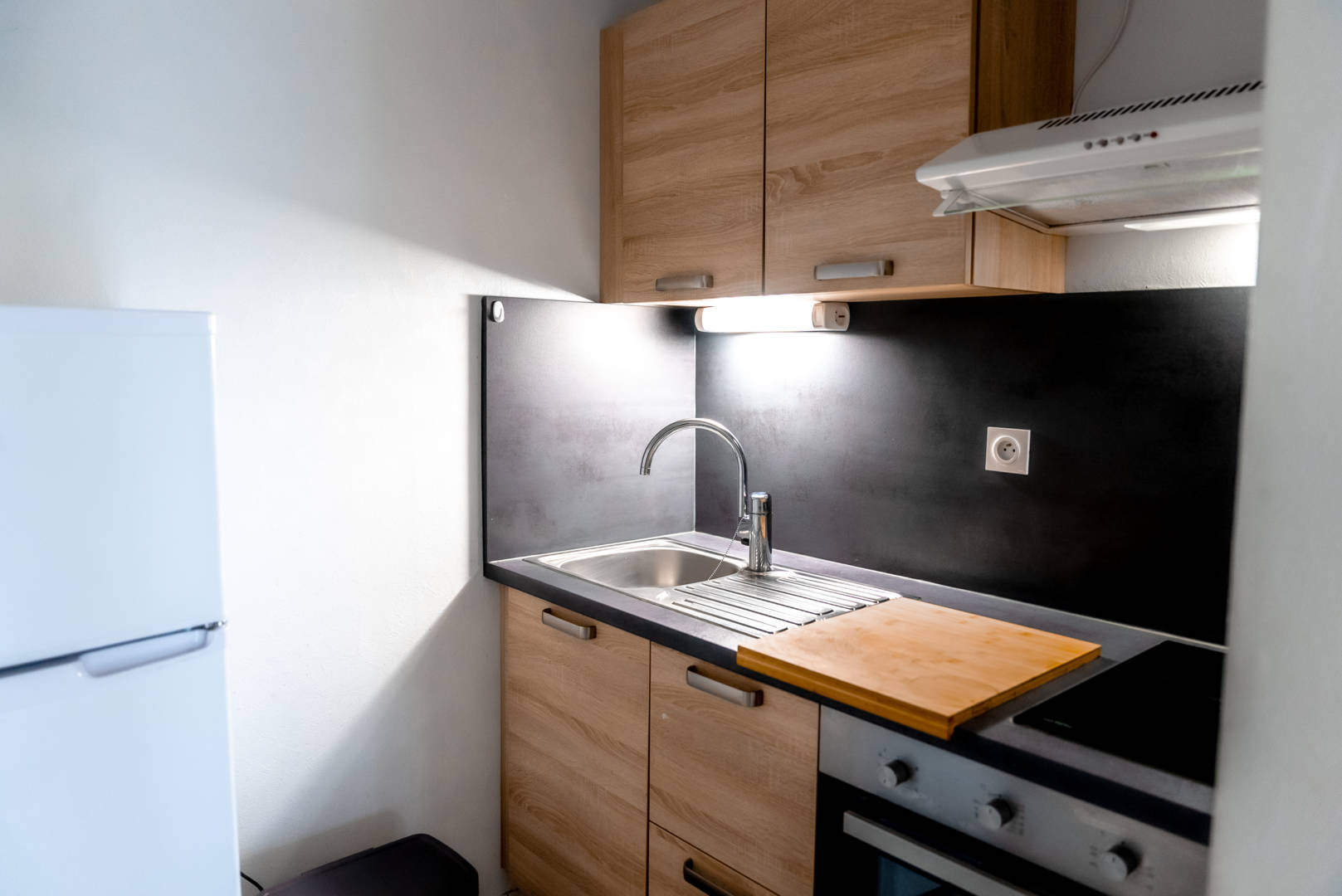 Studio composé d’une pièce principale avec un coin cuisine équipé (réfrigérateur-congélateur, four, micro-onde); un coin séjour avec un canapé; 1 lit 2 personnes 180 cm et une salle d’eau. Lave linge.