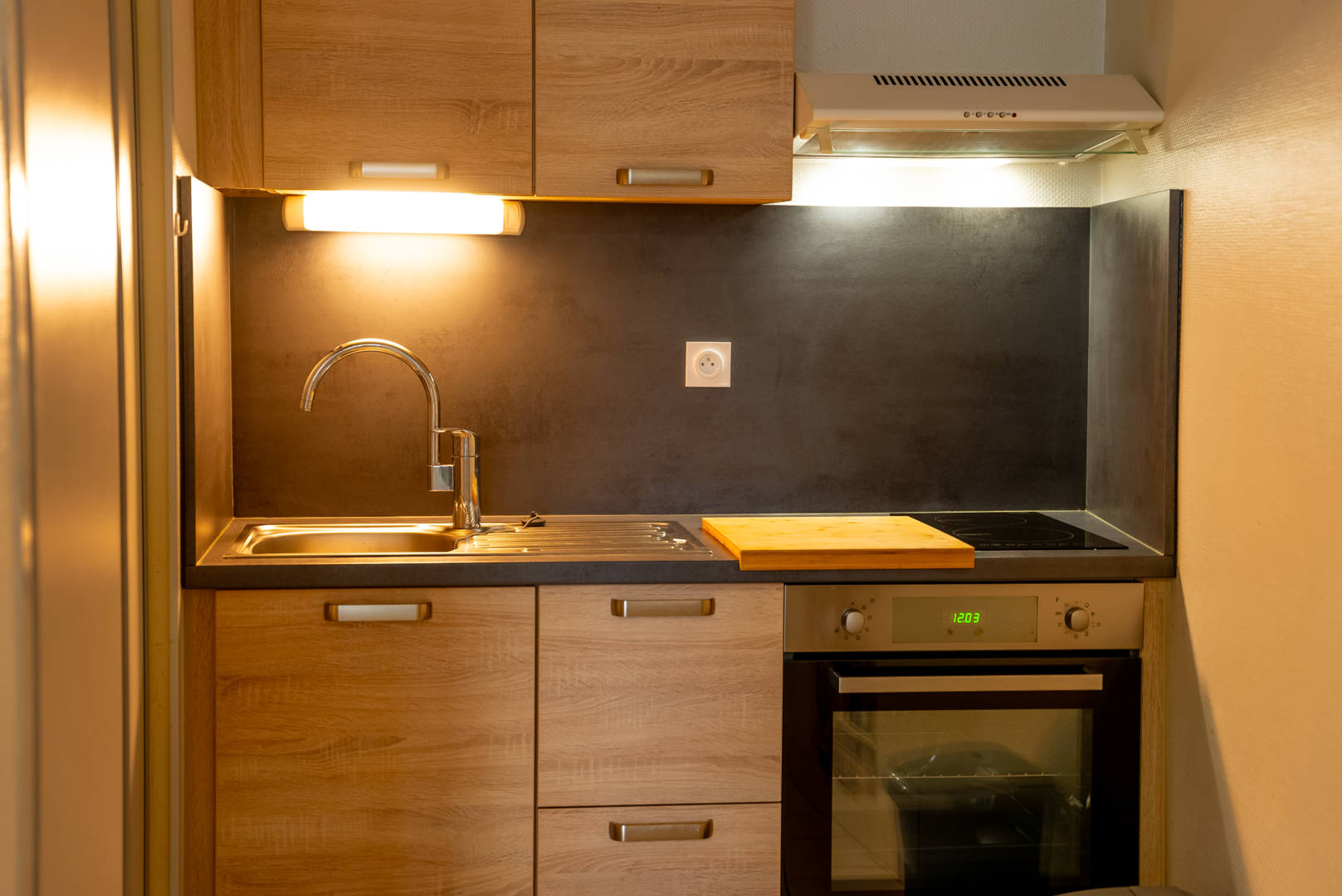 Studio composé d’une pièce principale avec un coin cuisine équipé (réfrigérateur-congélateur, four, micro-onde); un coin séjour avec canapé; un grand lit 2 personnes 180 cm et une salle d’eau. Lave Linge. Wifi. Terrasse avec salon de jardin et barbecue.