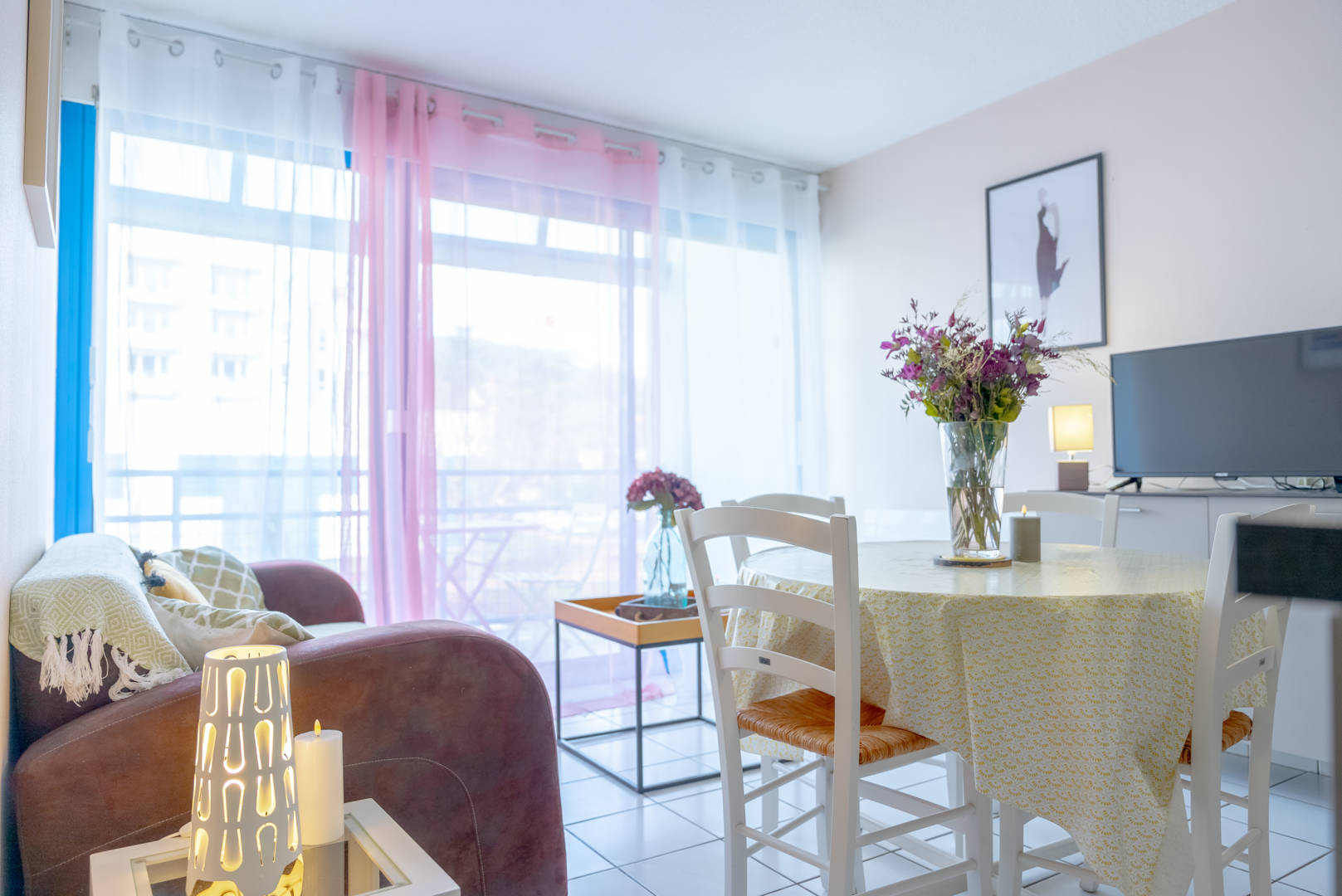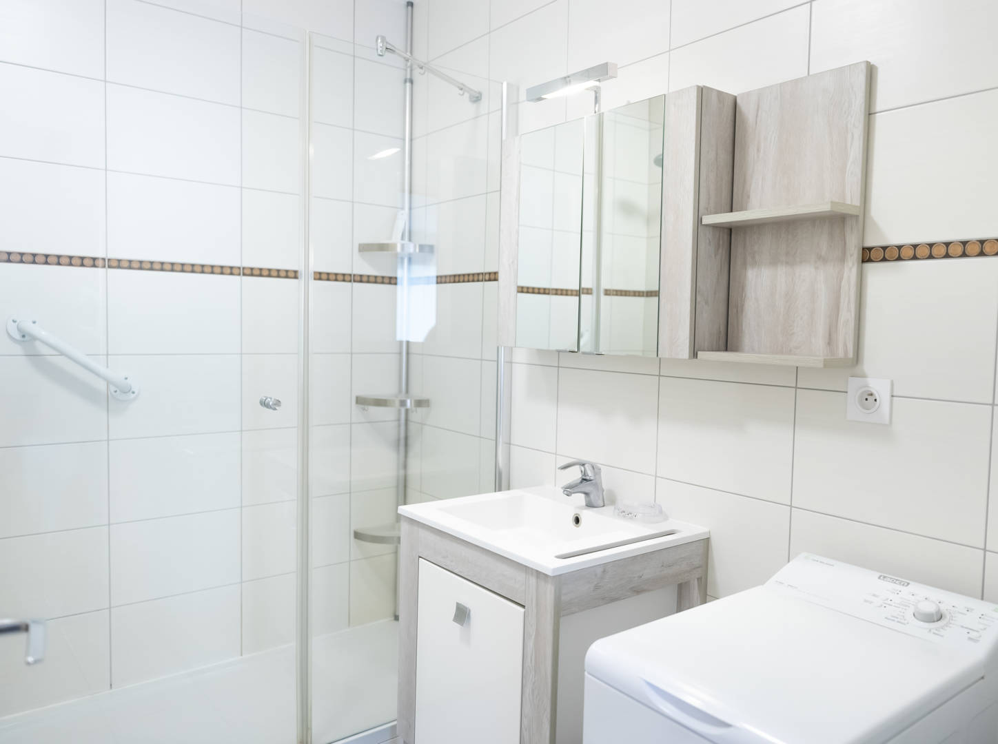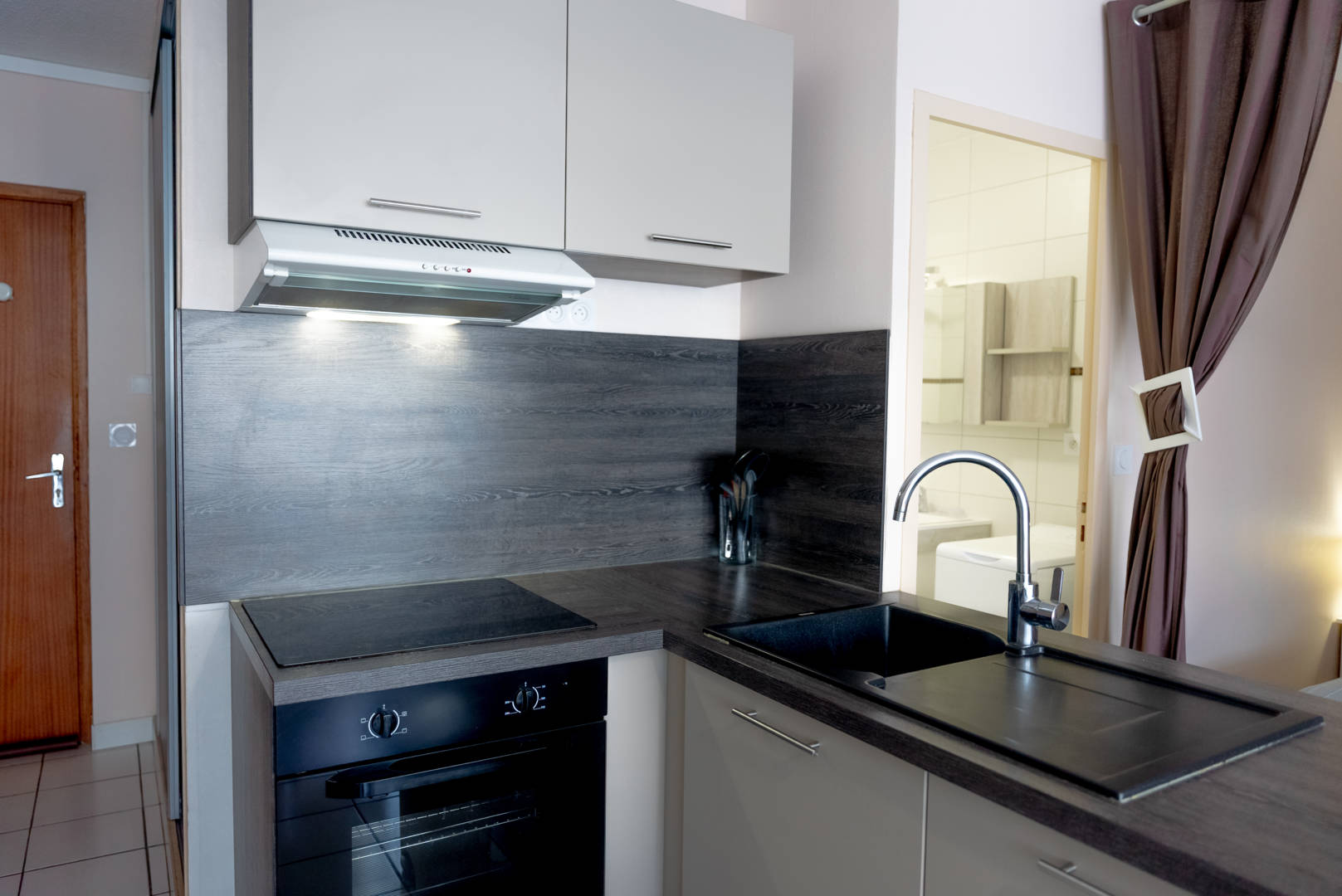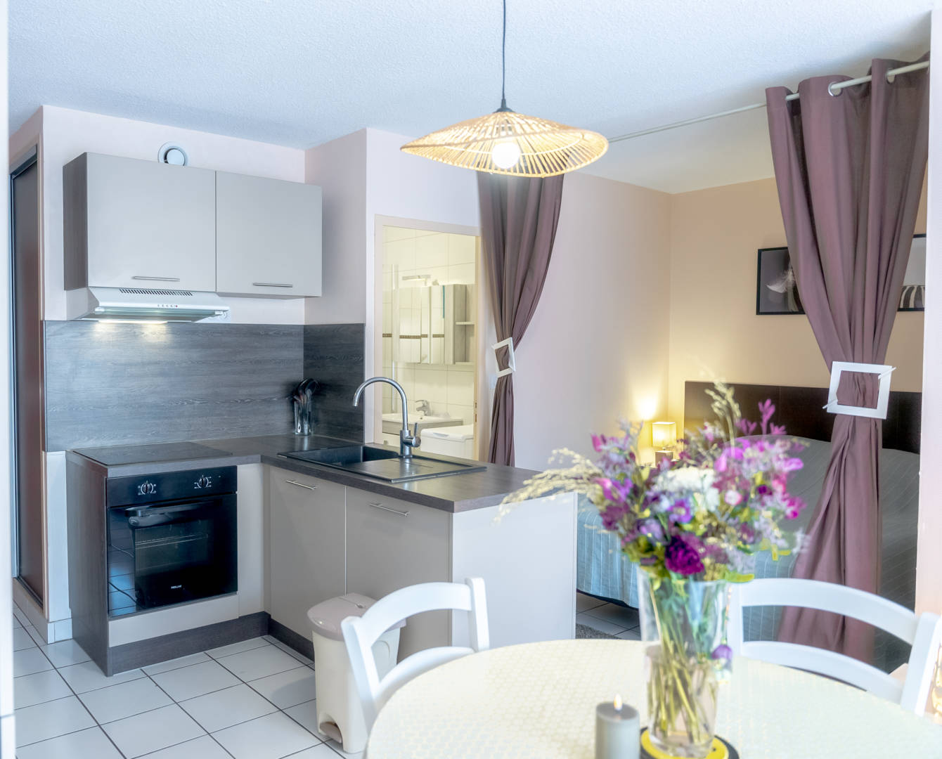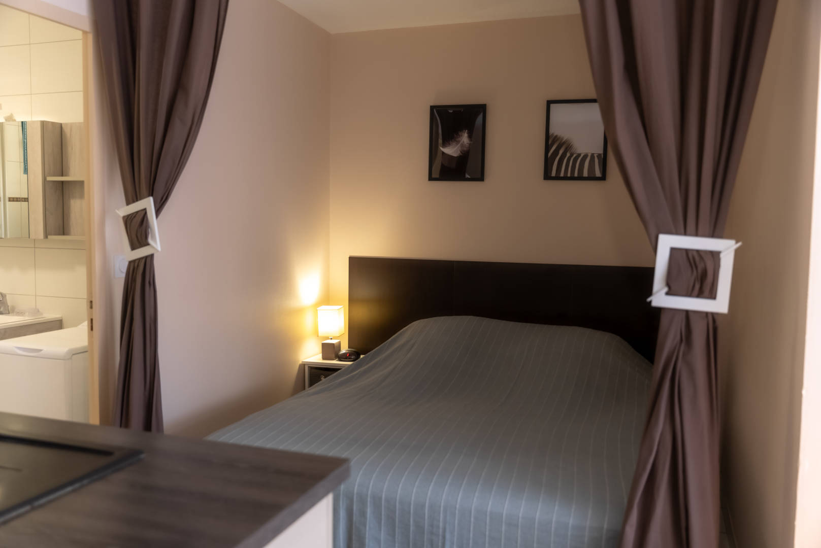 Studio composé d’une pièce principale avec un coin cuisine équipé (réfrigérateur-congélateur, four, micro-onde, lave vaisselle); un coin séjour avec convertible; un lit 2 personnes 180 cm et une salle d’eau. Lave Linge. Wifi. Terrasse avec salon de jardin et barbecue.