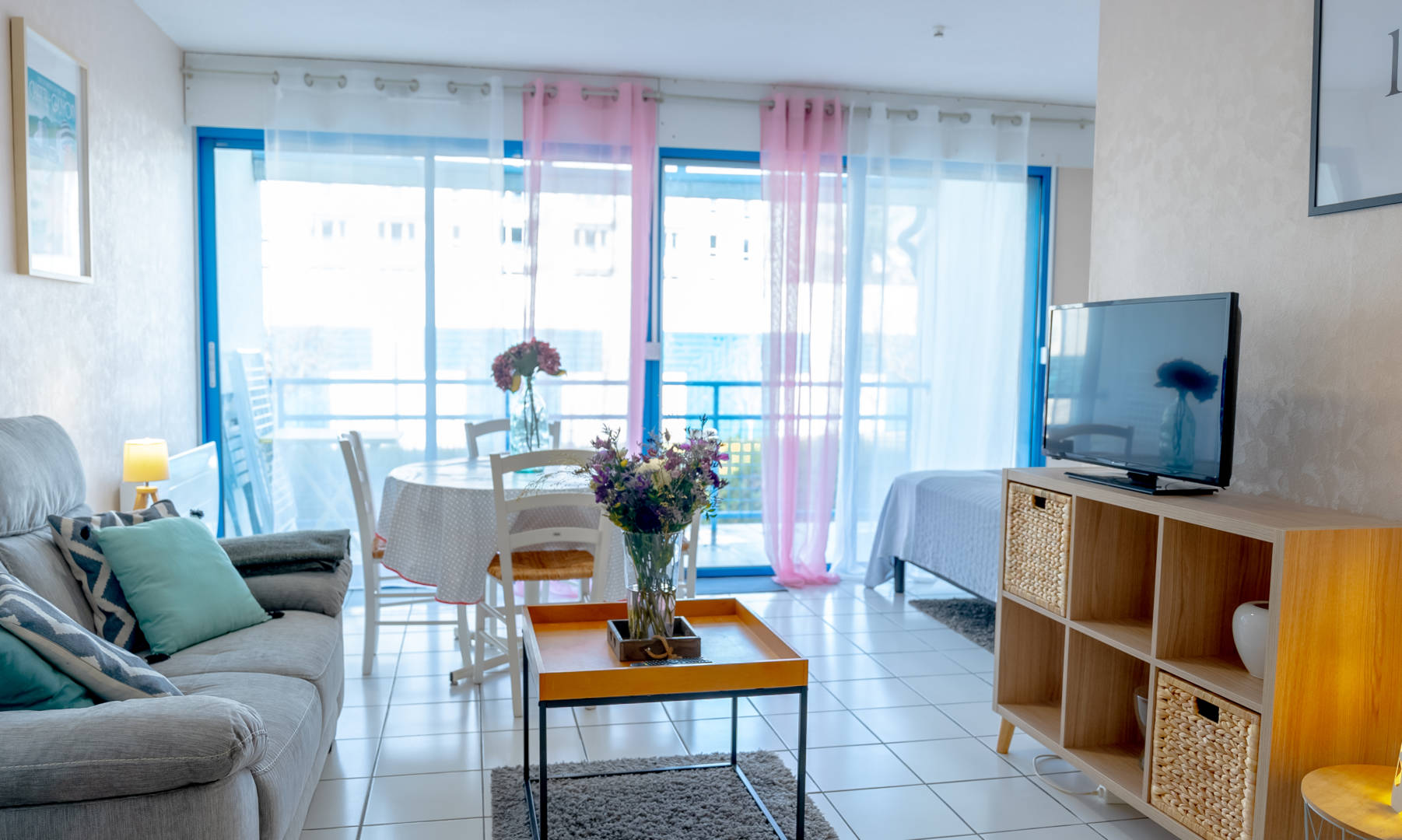 Studio composé d’une pièce principale avec un coin cuisine équipé (réfrigérateur-congélateur, four, micro-onde); un coin séjour avec canapé; un grand lit 2 personnes 180 cm et une salle d’eau. Lave Linge. Wifi. Terrasse avec salon de jardin et barbecue.