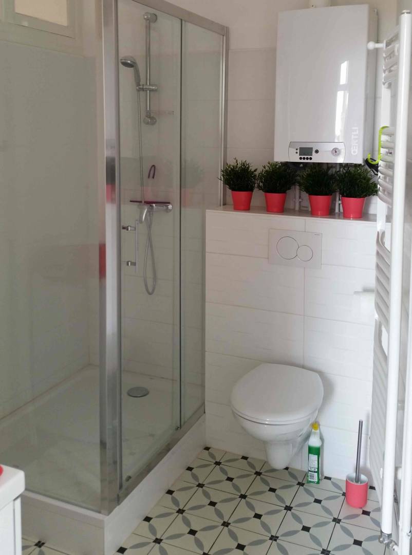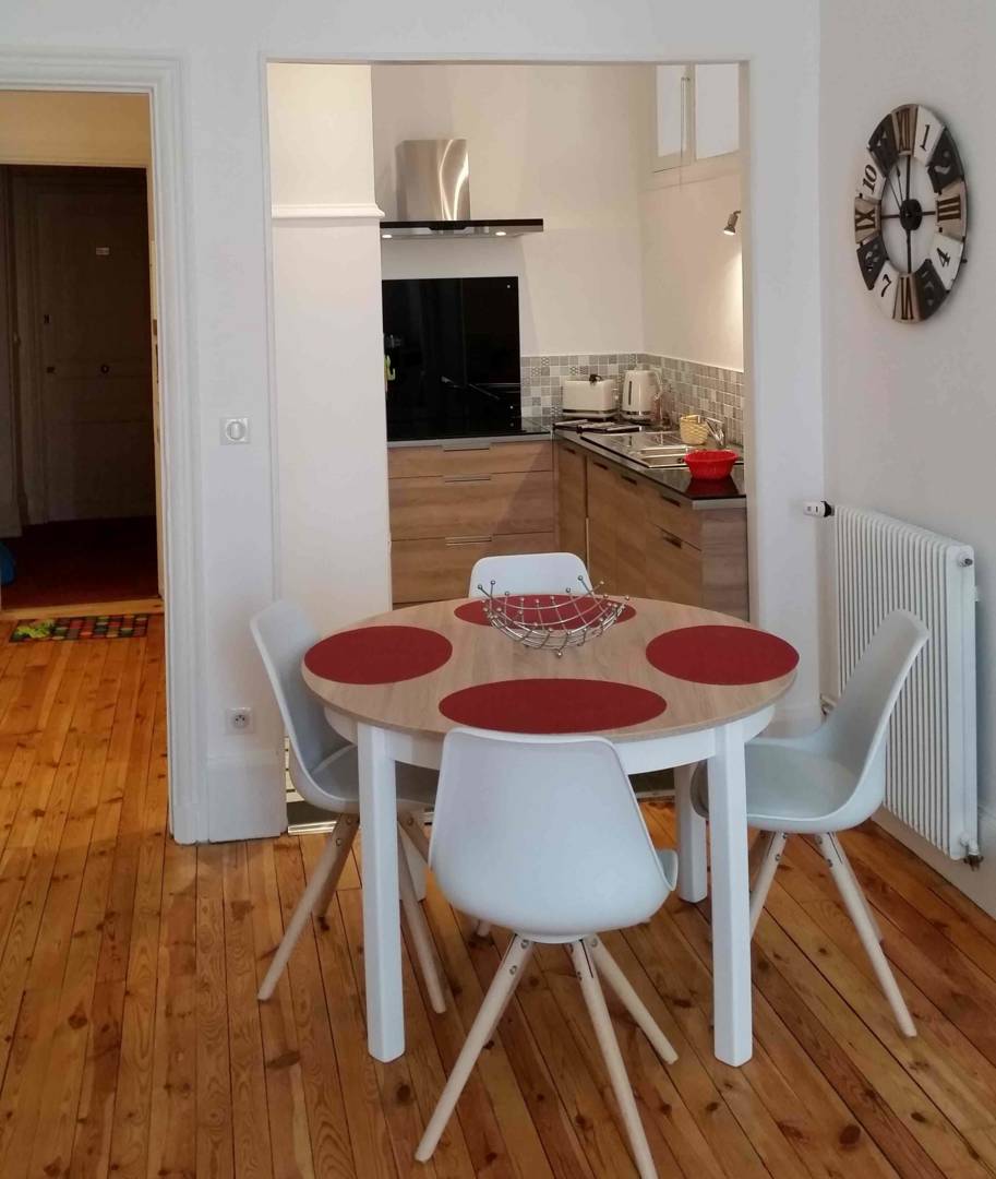 Disposition de l’appartement : Une pièce principale avec balcon : un canapé, un fauteuil, une table basse, une TV écran plat, accès wifi. Une cuisine équipée : une plaque vitrocéramique 4 feux, une hotte, un réfrigérateur avec partie congélateur, un four combiné, un grille – pain ,une bouilloire électrique, une(…)