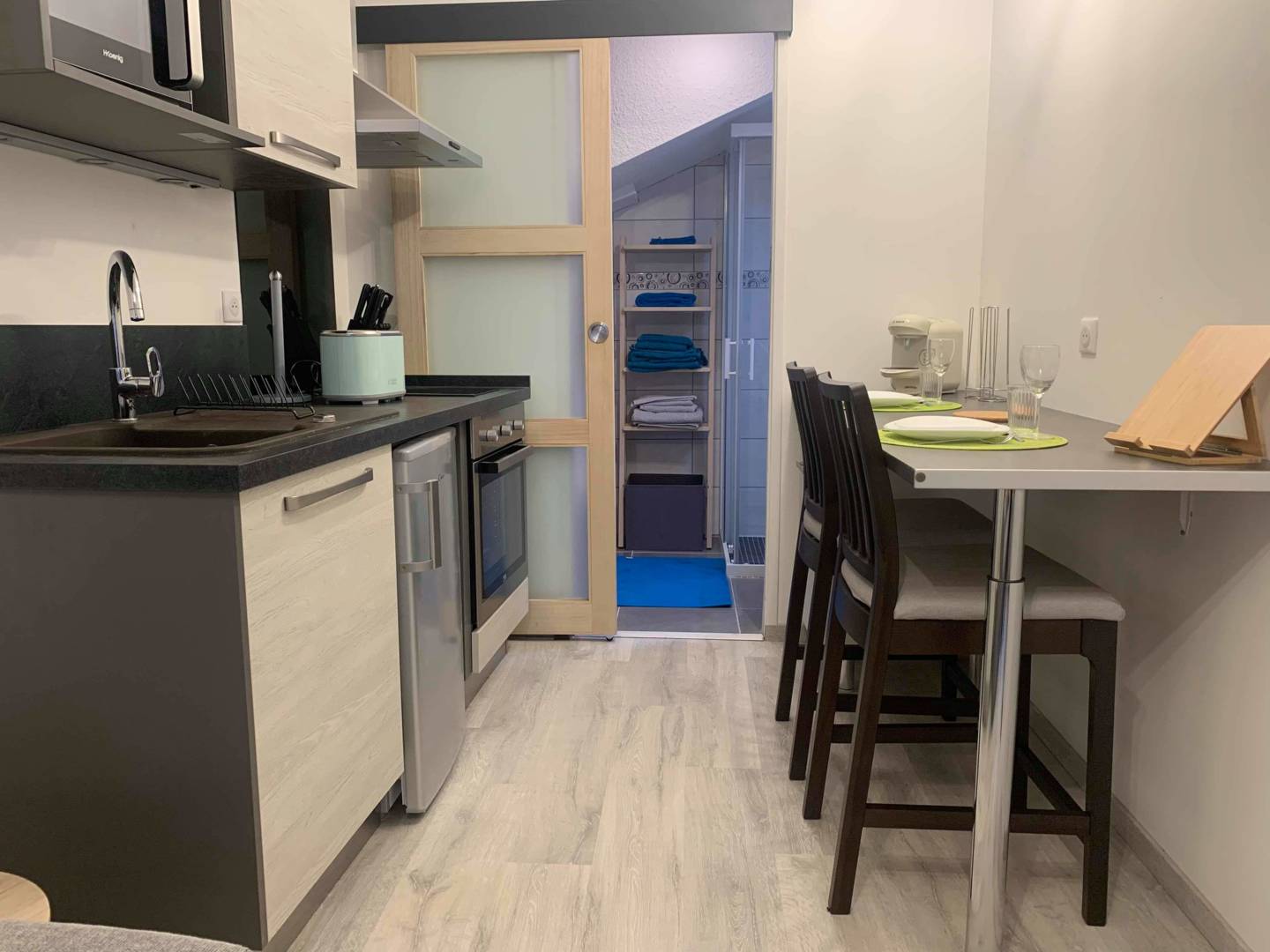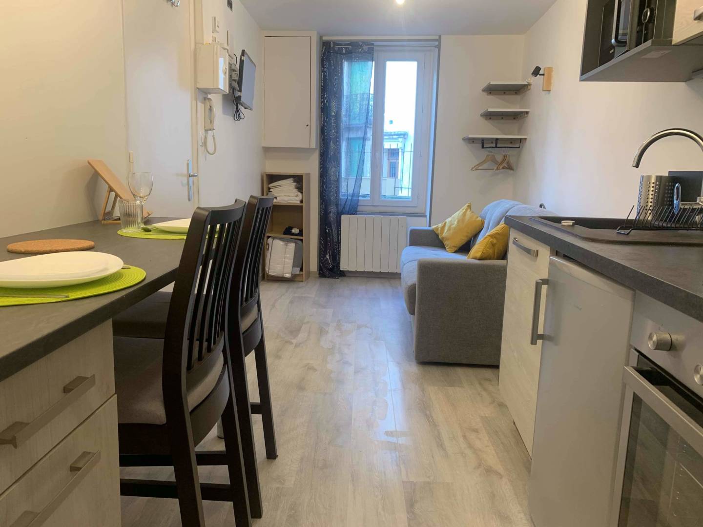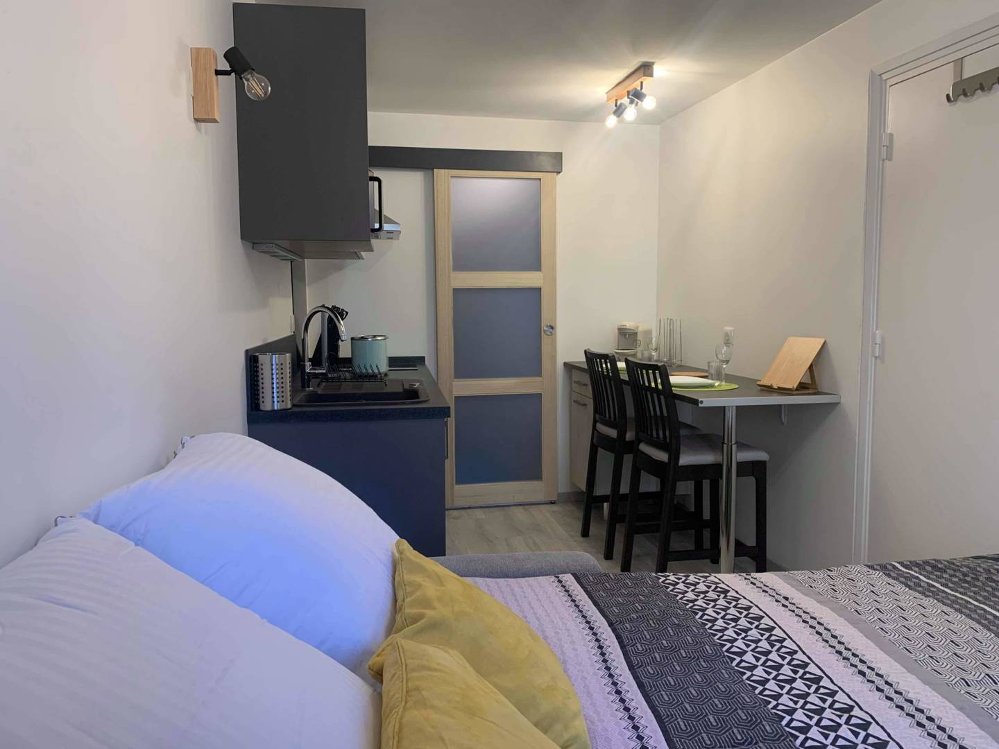 Charmant studio composé d’une pièce principale avec coin cuisine (équipé), d’un coin repas et canapé lit « Rapido » (matelas confort), d’une salle d’eau avec douche à l’italienne. WC surélevé et vasque. Lave linge.