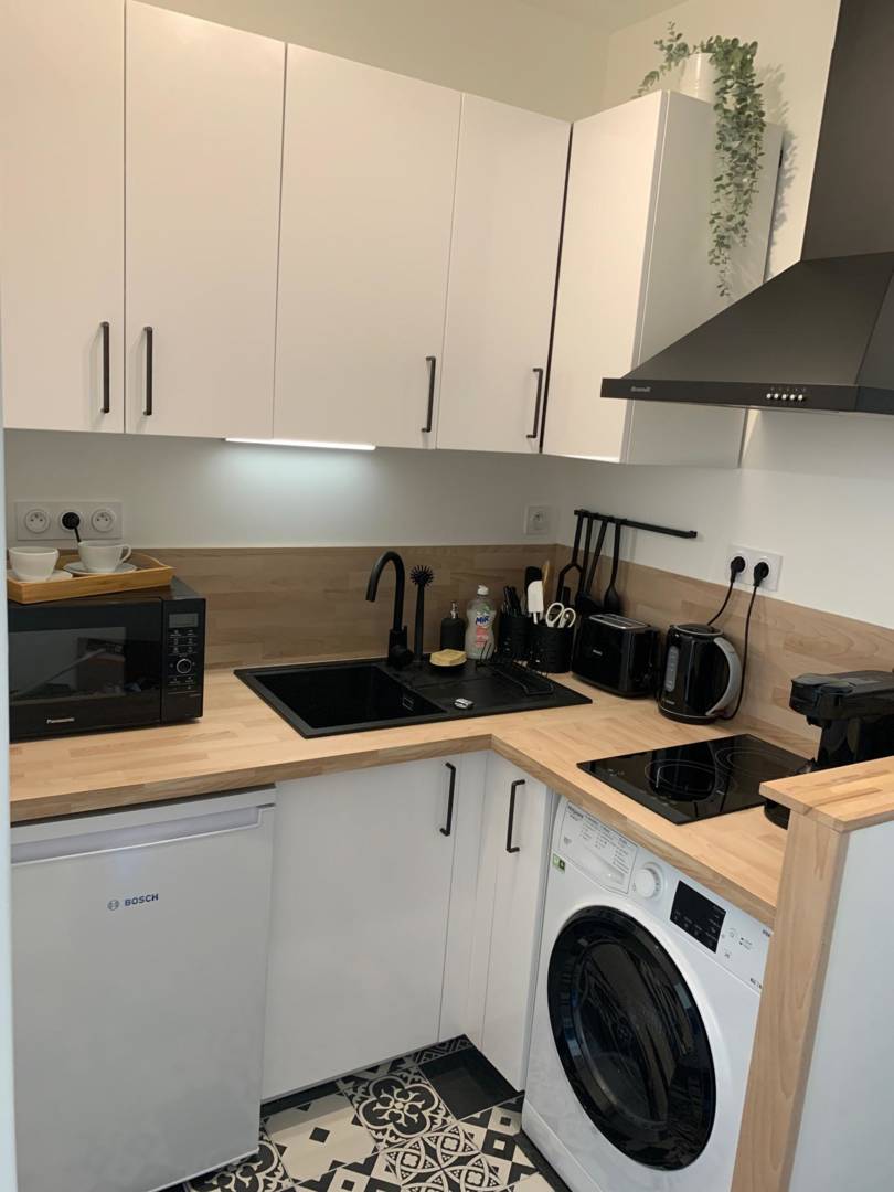 – Cuisine : réfrigérateur-congélateur, four micro-ondes combiné, plaques inductions, grille-pain, bouilloire et cafetière.