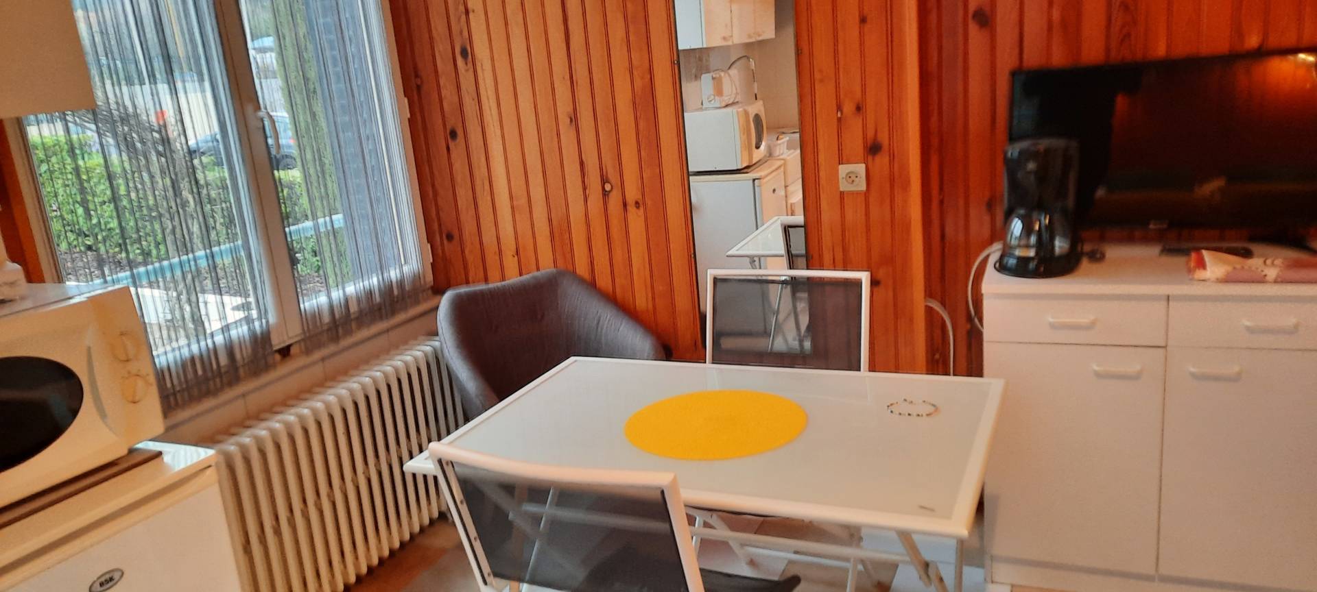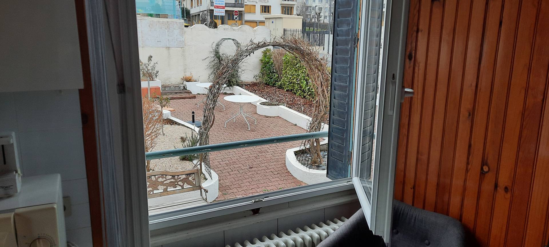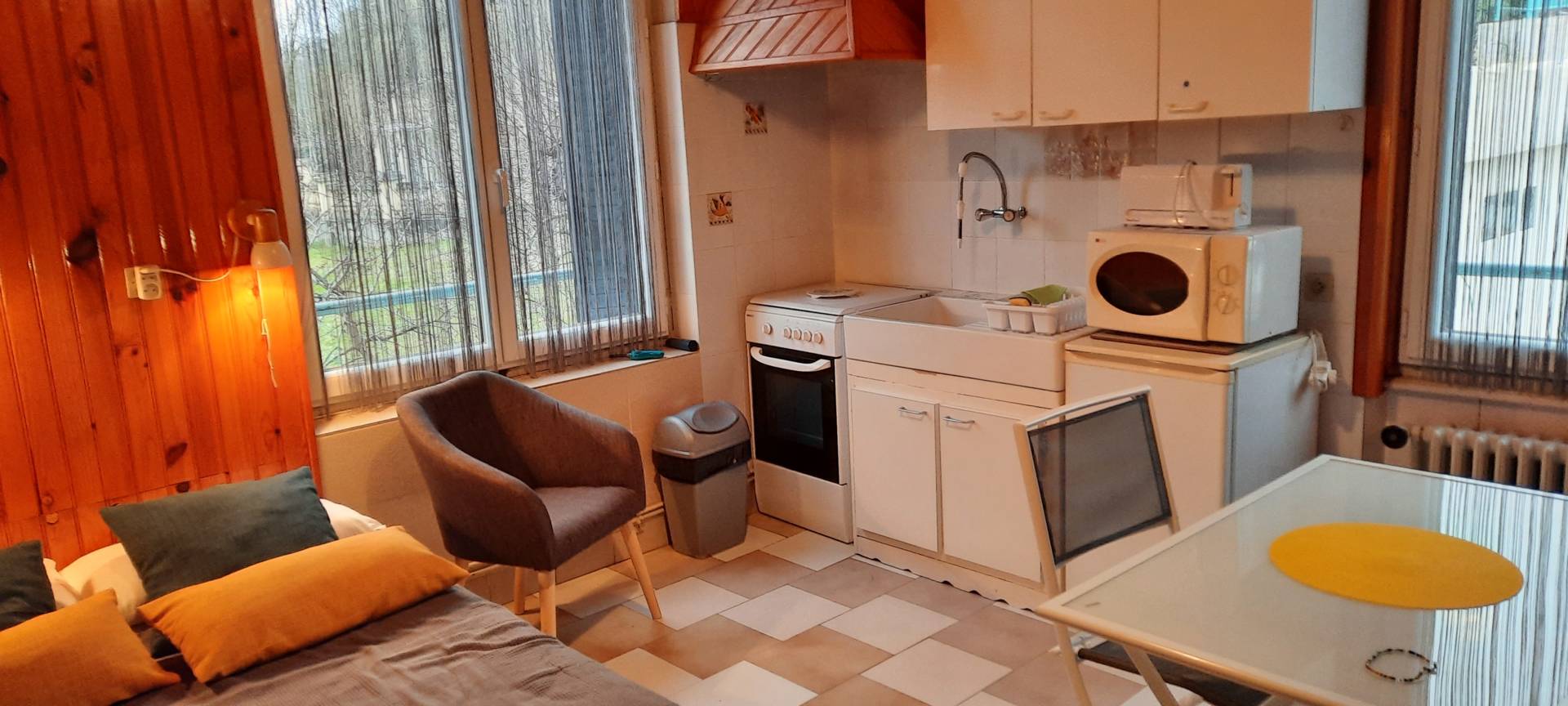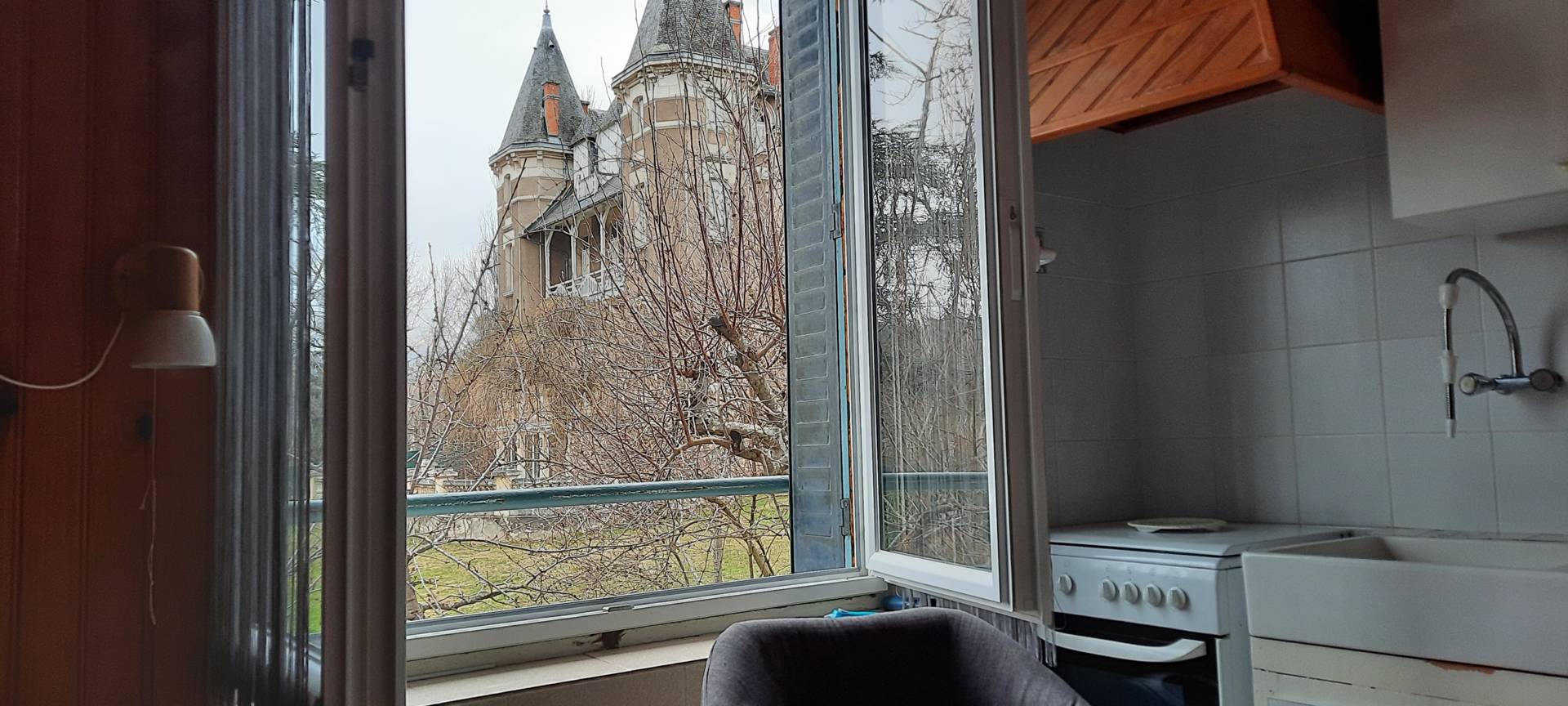 Dans un écrin de verdure, confortable appartement de 18 m2, situé en rez-de-jardin de la villa côté château. Double exposition, avec une belle vue sur le jardin et château.