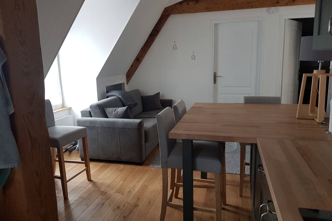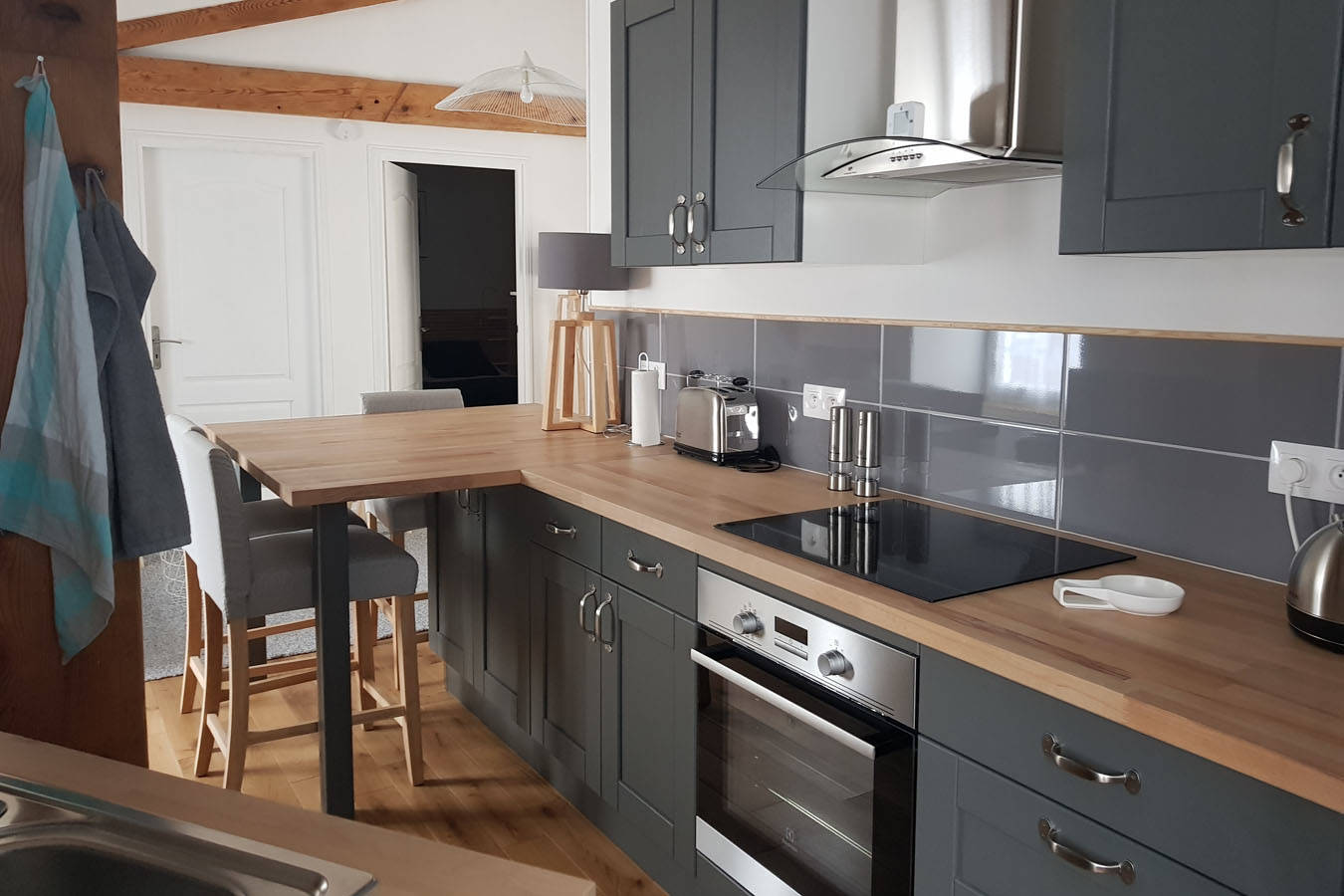 • Une cuisine équipée ouverte sur le salon-séjour : lave-vaisselle 12 couverts, réfrigérateur-congélateur, plaque induction, hotte, four multifonction, micro-onde. Appareil à raclette, gaufrier, croque-monsieur, prise USB…