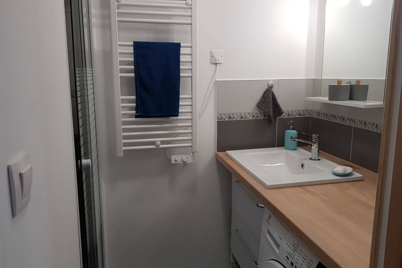 • Une salle de douche avec douche italienne, vasque, rangement, sèche-serviette électrique, lave-linge, sèche-cheveux. • Un WC séparé.