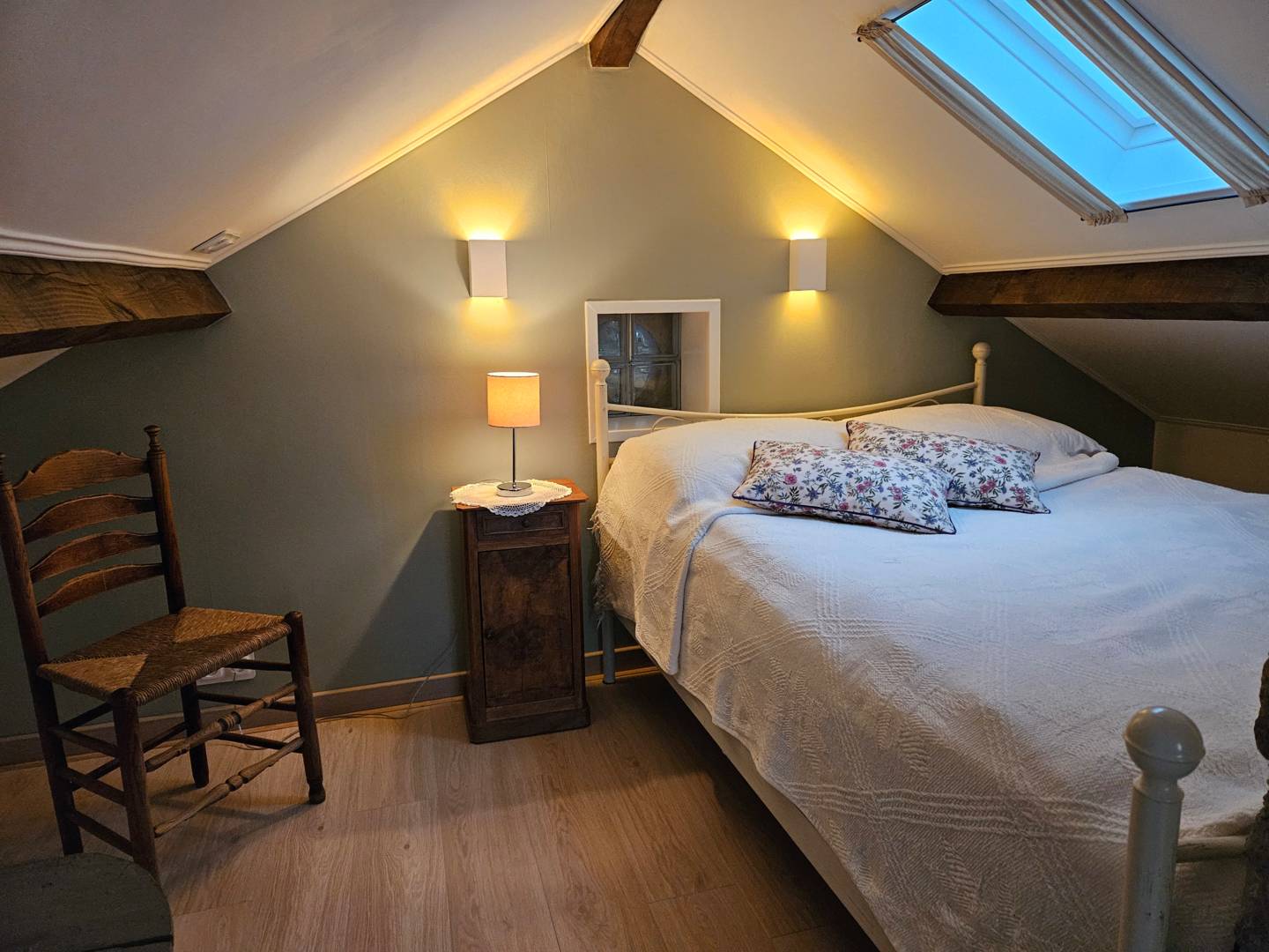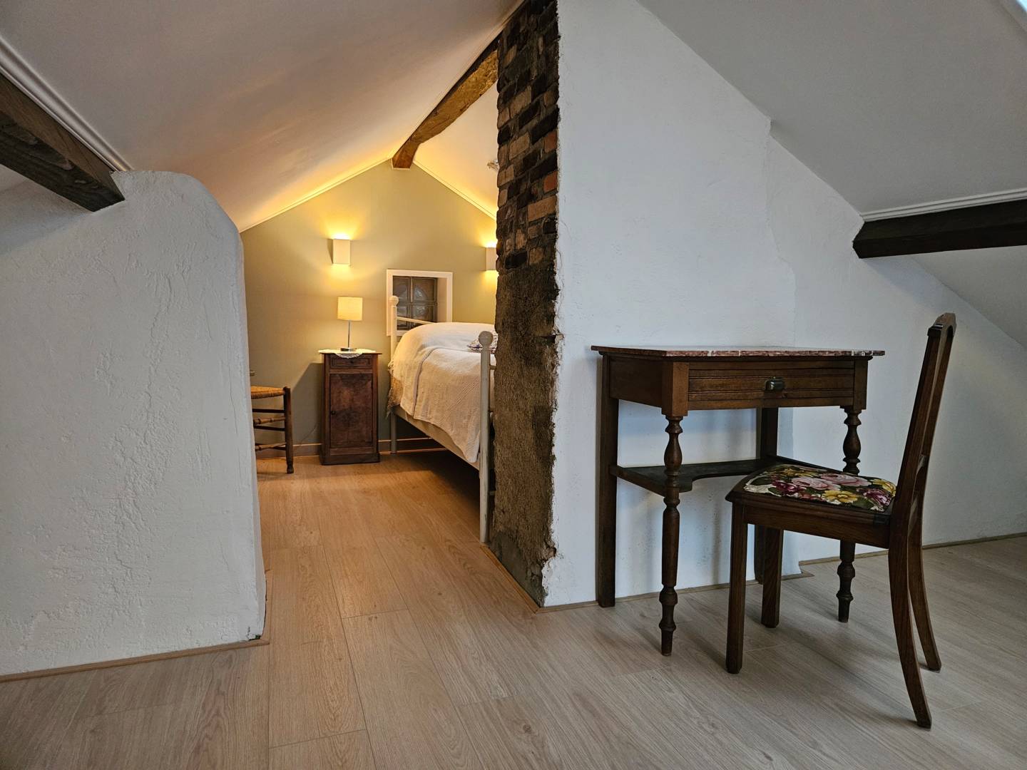 Un deuxième escalier fixe mène au grenier, une pièce lumineuse et agréable où vous pouvez travailler ou où les enfants peuvent jouer librement. La chambre à coucher attenante, non fermée, est équipée d’un lit double (140 cm x 190 cm).