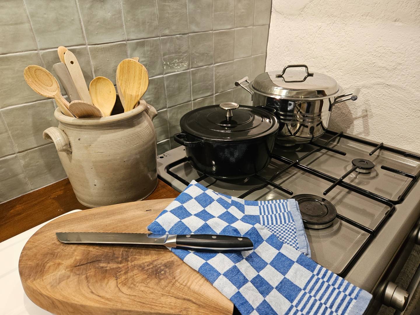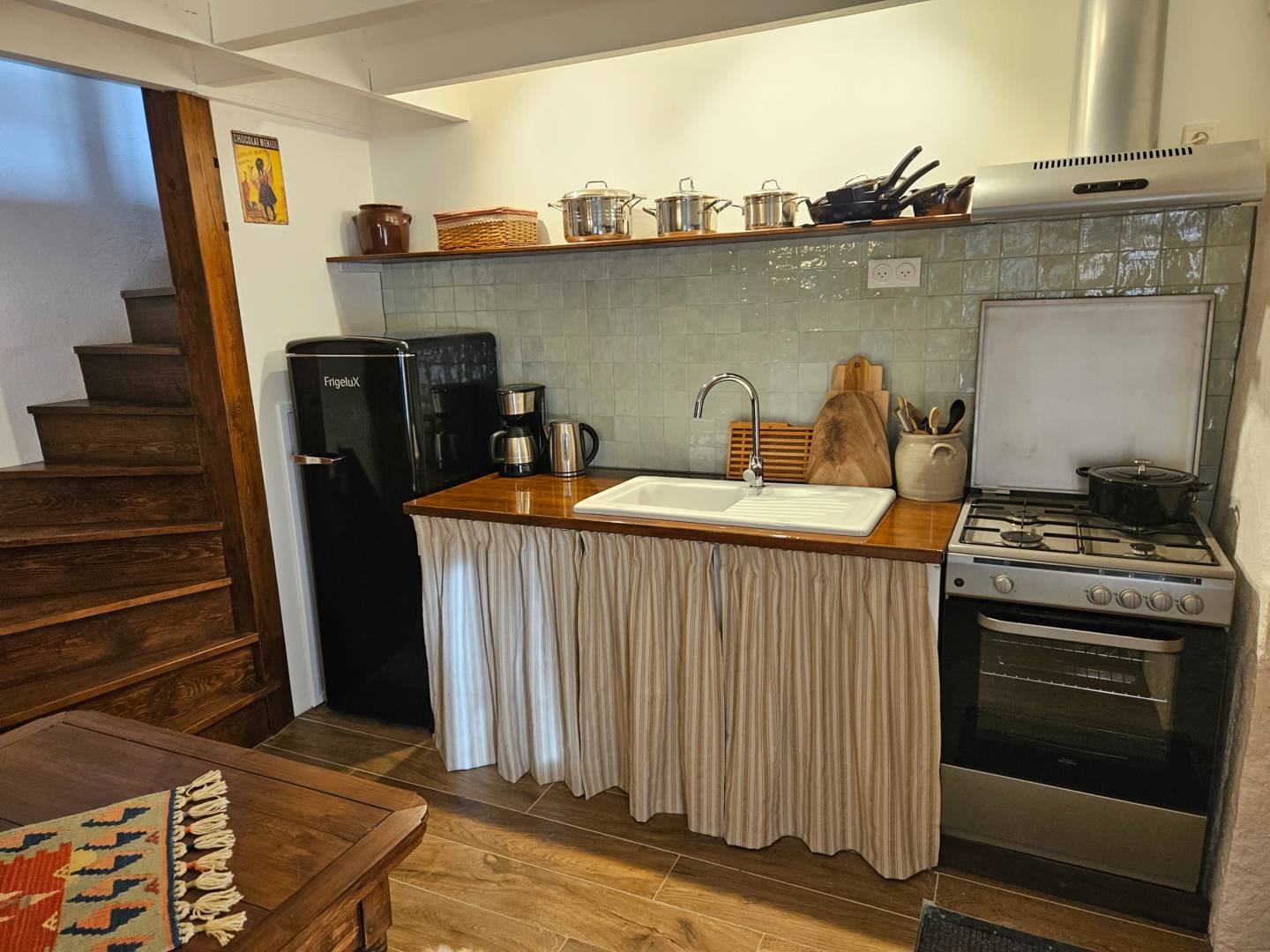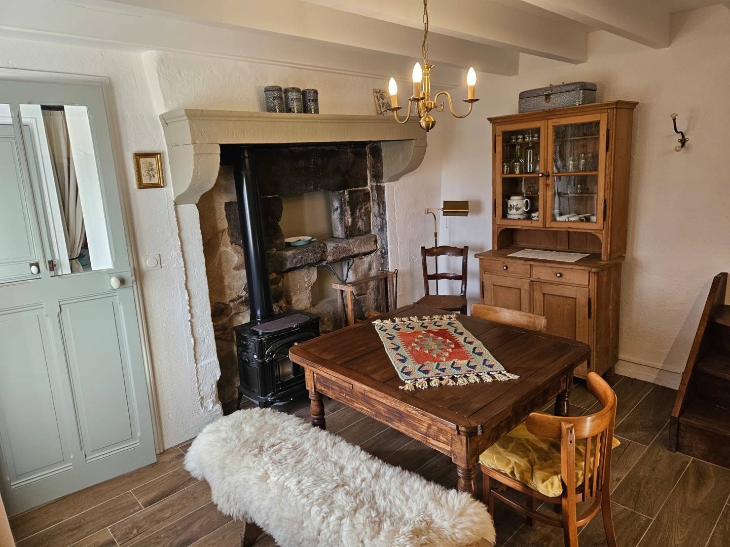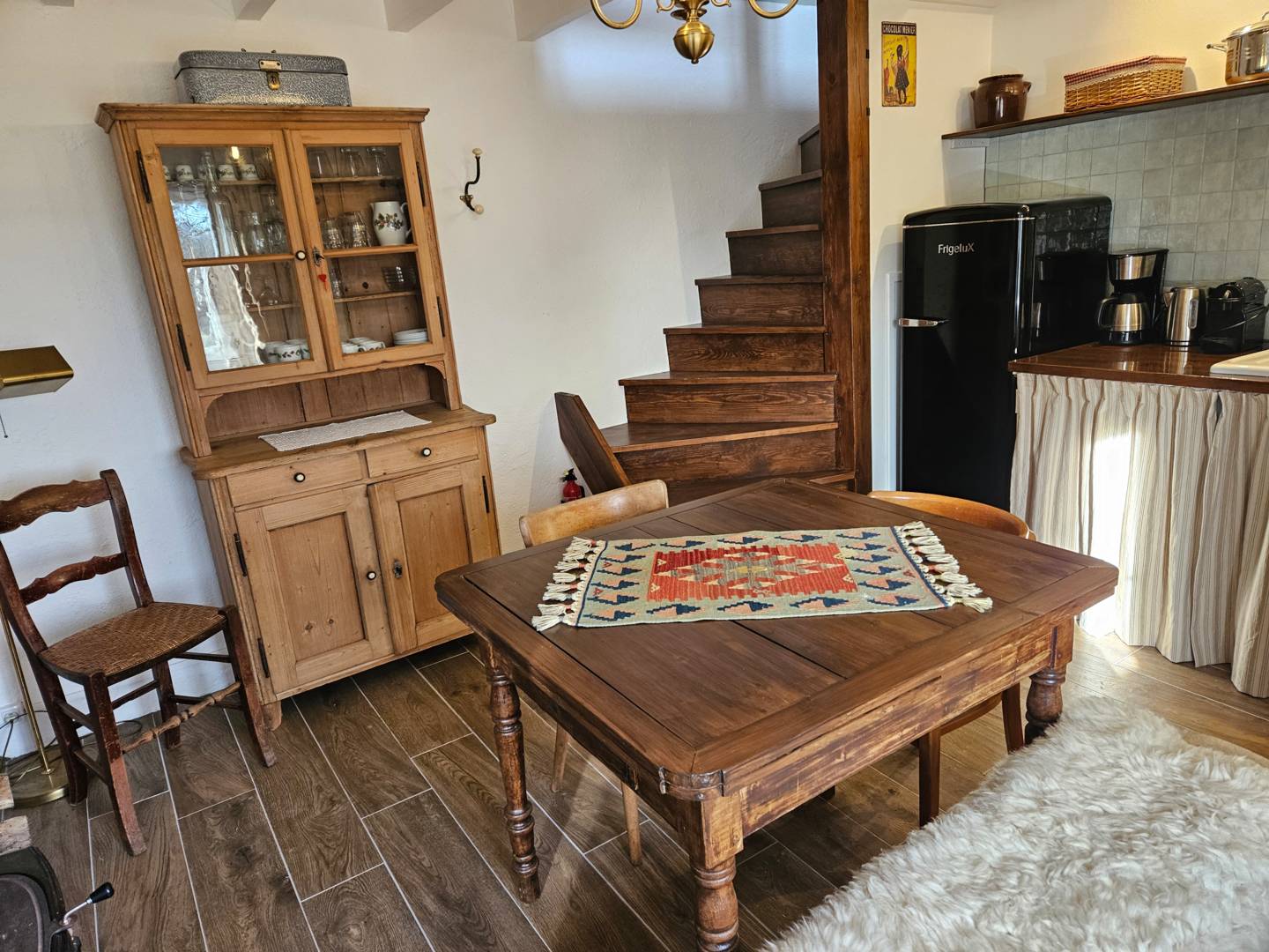 Vous entrez dans la cuisine bien équipée, qui comprend une cuisinière à gaz avec four, un lave-vaisselle, un réfrigérateur avec compartiment congélateur, une cafetière, une bouilloire et un grille-pain. La table à manger avec banquette et chaises et le poêle à bois font de la cuisine un espace confortable où vous aimerez passer du temps.