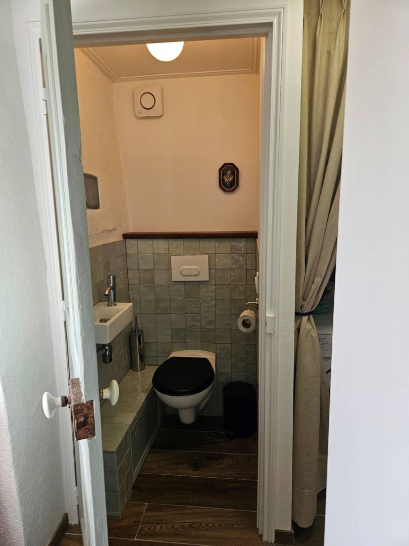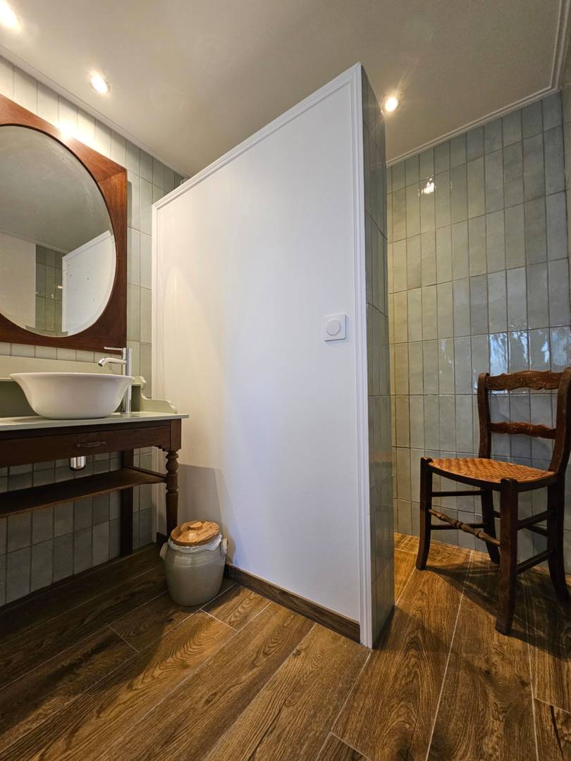 Au rez-de-chaussée, vous trouverez également les toilettes et la salle de bains, équipée d’une douche à l’italienne et d’un lavabo.