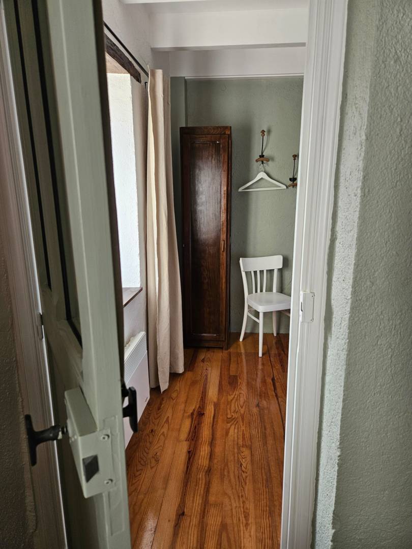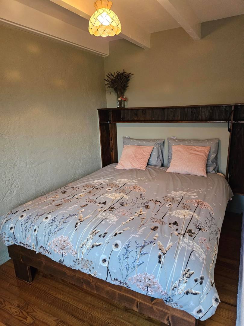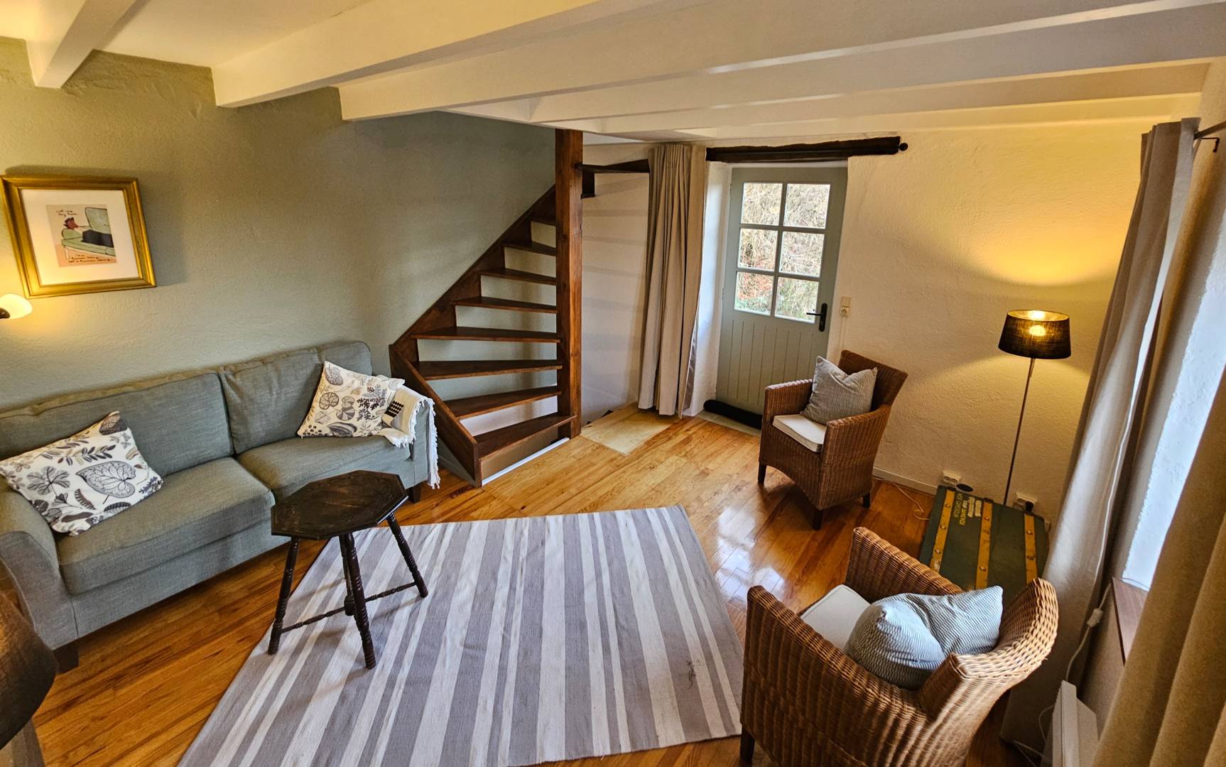Dans la cuisine, un escalier fixe mène au premier étage, où se trouve le salon. Vous y bénéficiez d’une vue magnifique. Il est équipé d’un canapé confortable, de deux fauteuils individuels, d’une télévision avec meuble chromé et du Wi-Fi. Adjacente au salon, vous trouverez une chambre avec un lit double (160 cm x 200 cm). Vous pouvez ranger vos vêtements dans l’armoire à l’ancienne.