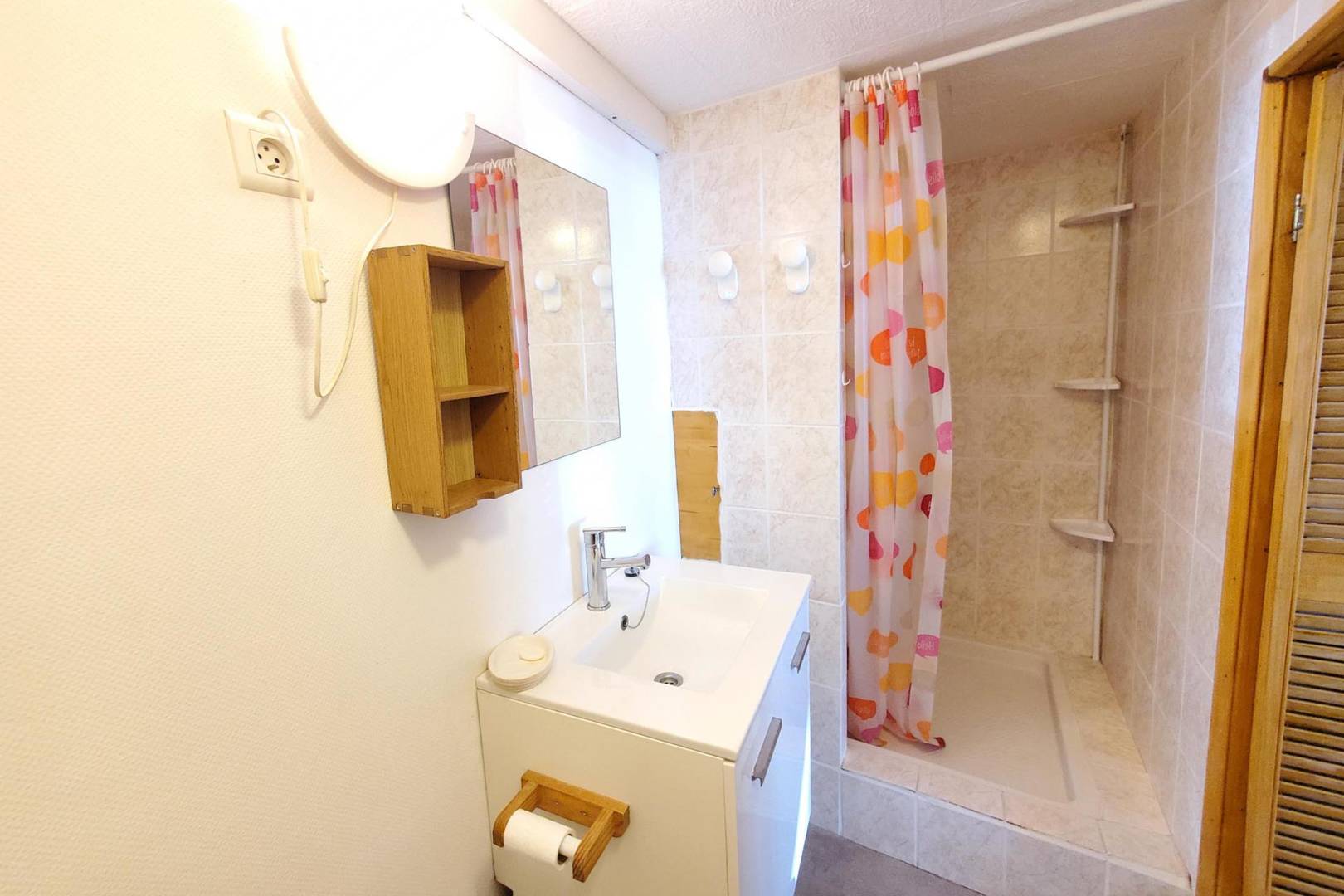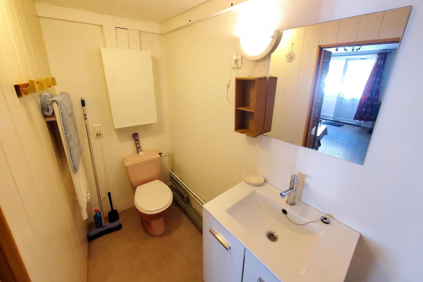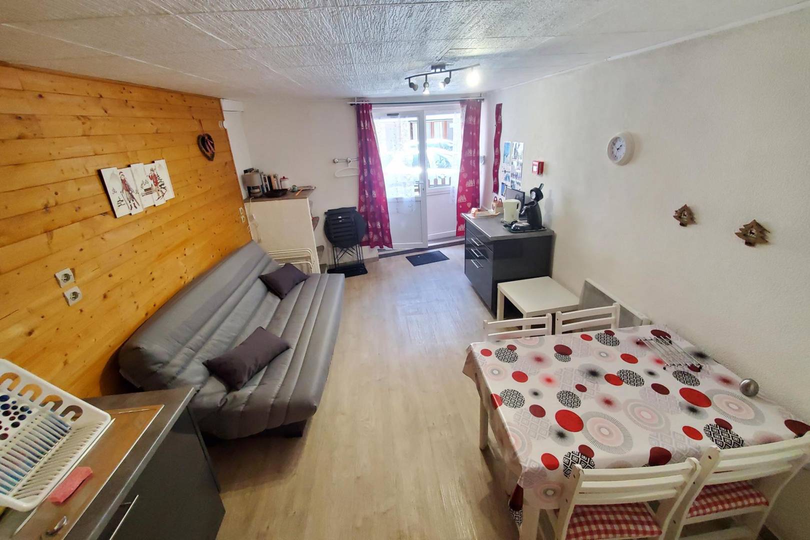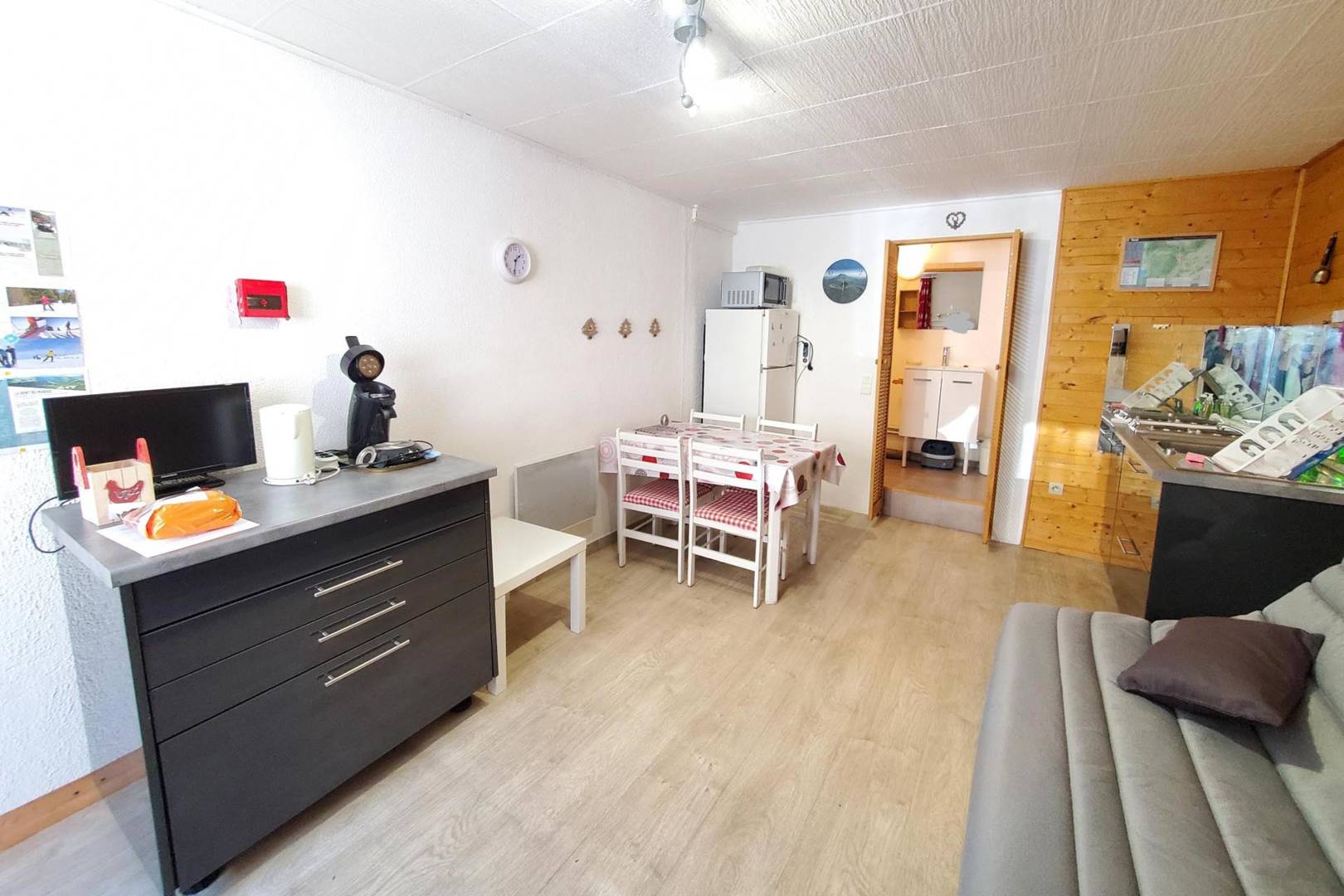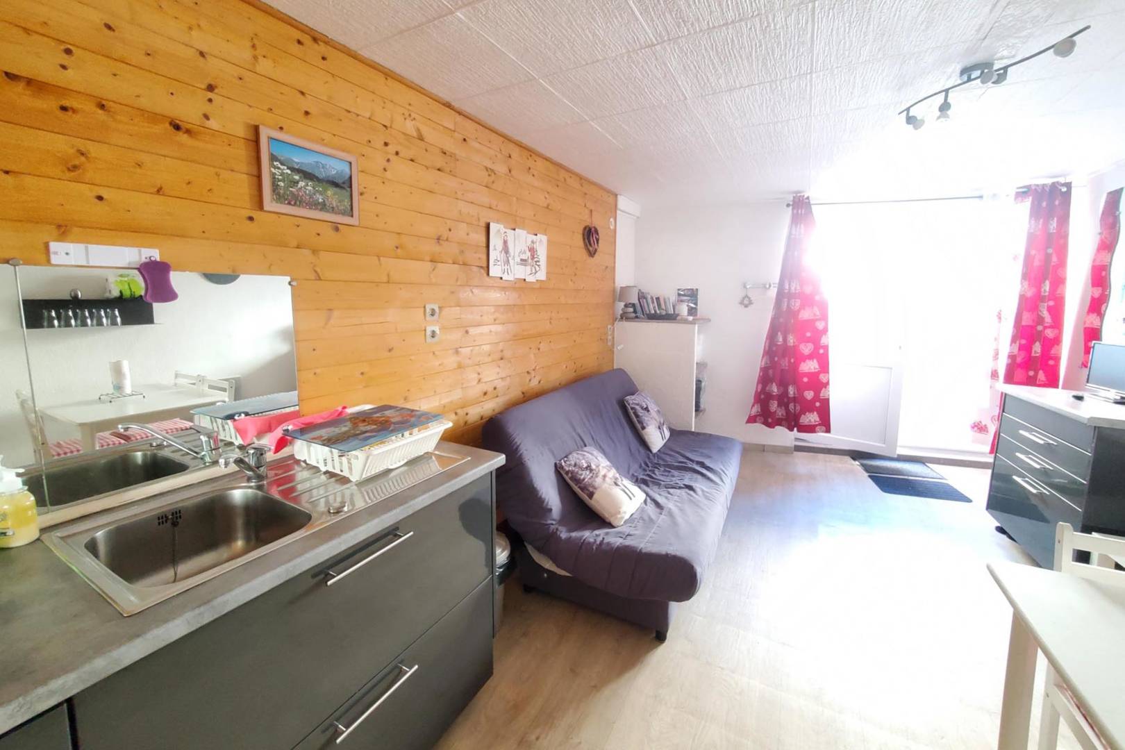 Il se compose d’une une pièce de vie avec un clic-clac et une cuisine américaine, un coin repas, une salle d’eau avec WC.
