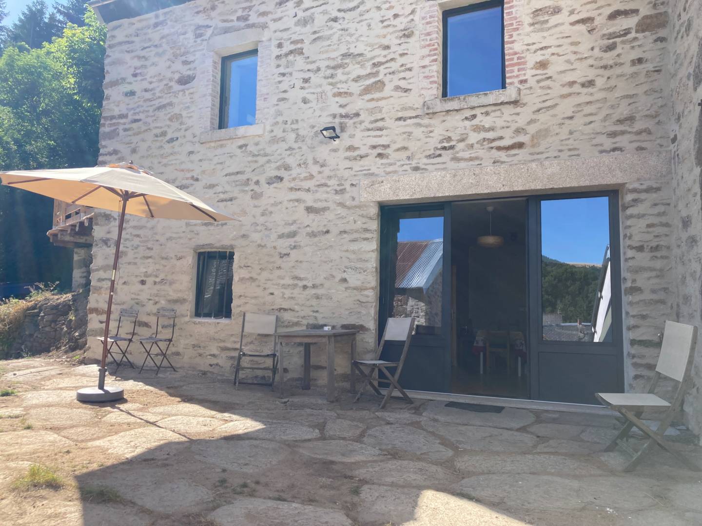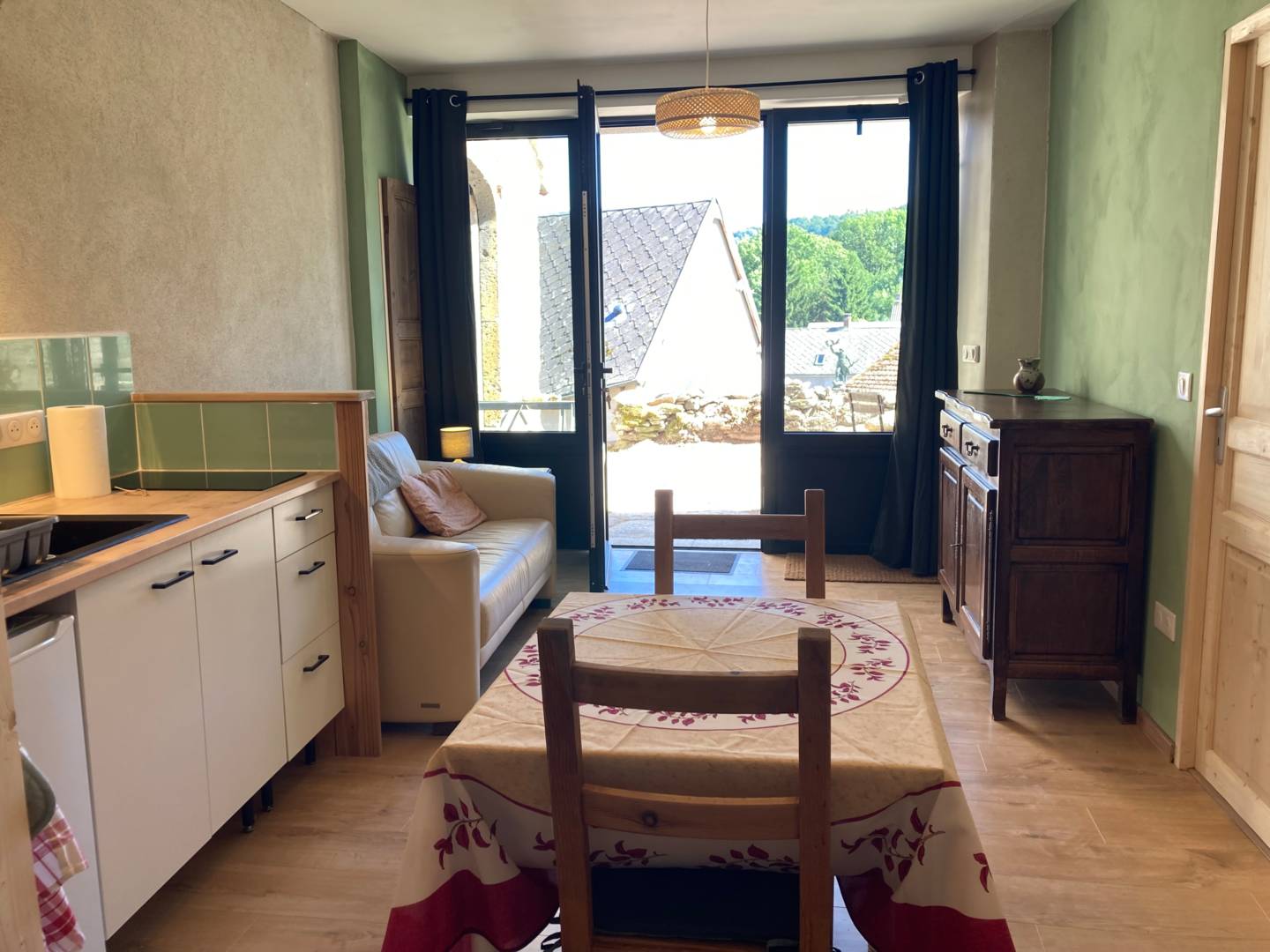 Cette partie du gîte est équipée en studio indépendant, il peut être relié au gîte 4 personnes du haut par un escalier intérieur. Idéal pour 1 ou 2 personnes, confortable et en beaux matériaux, belle vue, calme. Parfait aussi pour une personne travaillant dans le coin occasionnellement pour de courts séjours. Télé-travail possible avec wifi et la fibre. 1 pièce de vie avec grande baie vitrée donnant sur la terrasse privative faite de vieilles lauzes (devant la grange). Petite cuisine, 2 plaques à induction, table à manger, salon avec canapé. Chambre spacieuse avec un lit 160 x 210 et étagères de rangement. Grande salle de bain avec douche équipée PMR et un toilette séparé. Espace extérieur tranquille sans vis-à-vis. En partie enterré, ce gîte reste frais même en période de canicule. De plein pied, en rez-de-chaussée.
