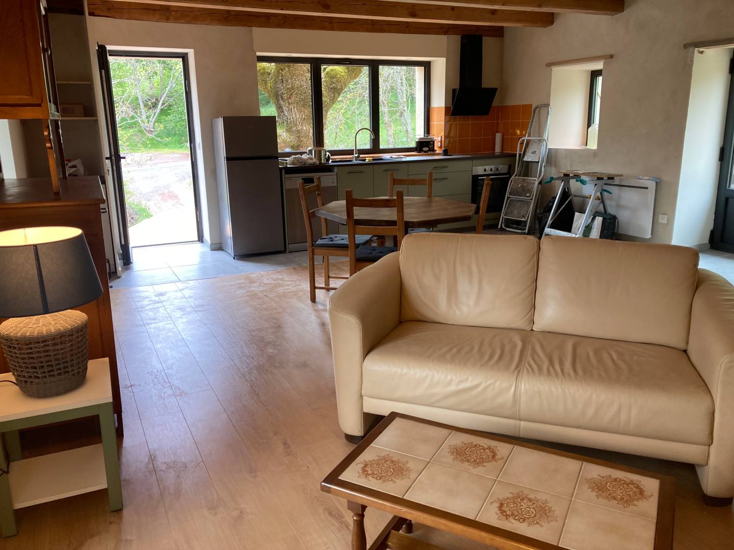 Au rez-de-chaussée, spacieuse pièce de vie, entièrement réalisée en matériaux naturels bois-chaux-chanvre, avec une belle cuisine équipée (plaques induction, four électrique, lave-vaisselle, lave-linge), une salle à manger lumineuse et un salon avec poêle à bois. Une grande terrasse suspendue, tout en bois de douglas naturel, ombragée par un vieux frêne.