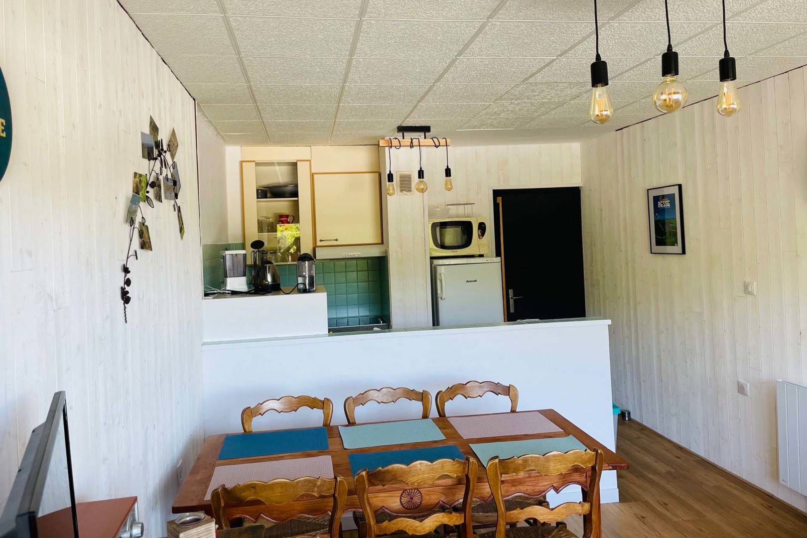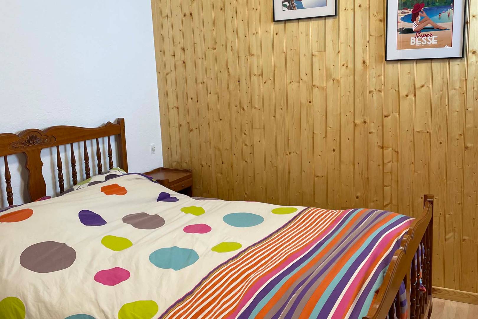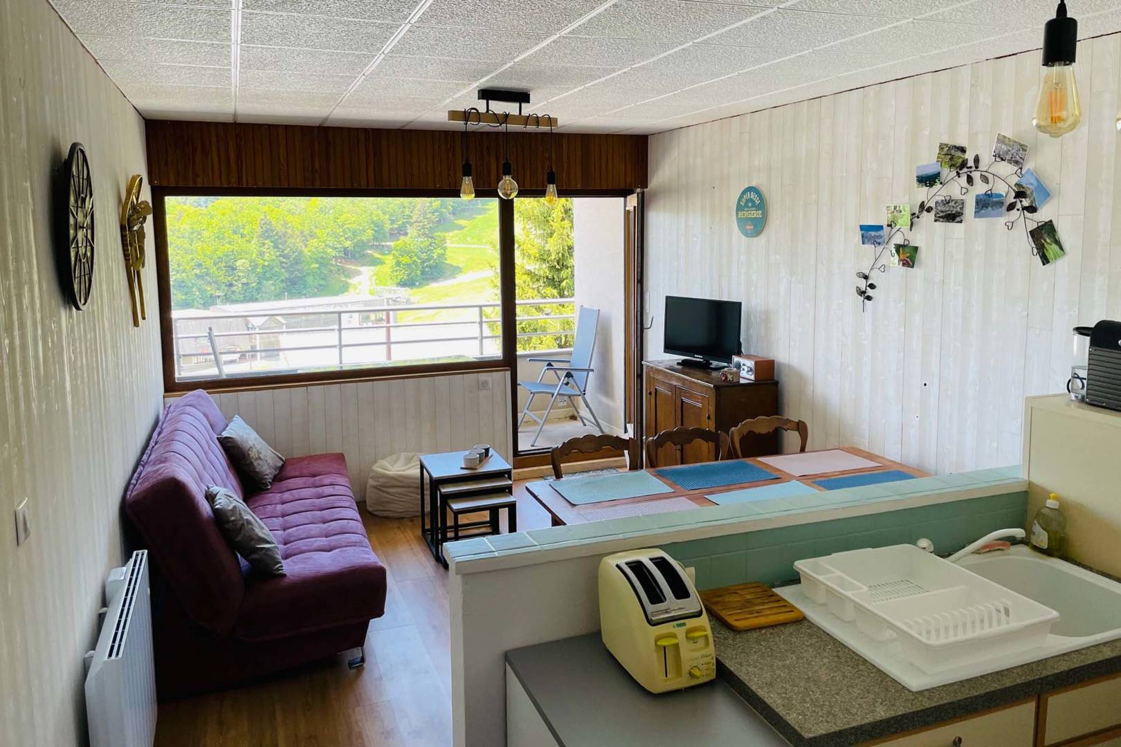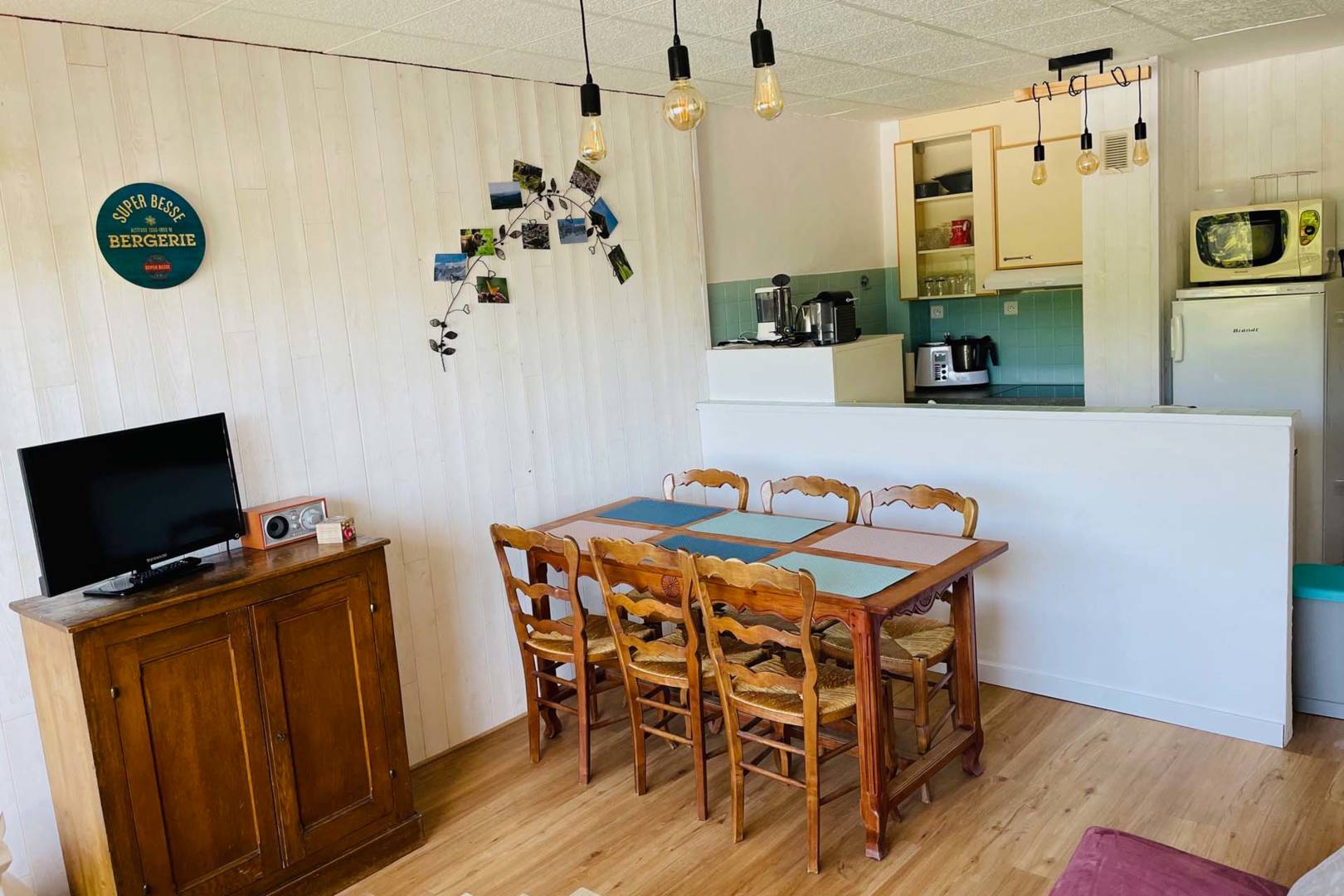 Appartement familial de 6/7 personnes maximum. A 100m des pistes, face à la montagne, à Super Besse. A louer appartement d’environ 50m2. Situé au 1er étage (sans ascenseur) de la résidence Studio 1350, rue Marcel Gauthier, avec vue sur les pistes depuis un balcon de 3m2. L’appartement comprend un séjour avec canapé convertible et une table avec 6 chaises, une salle d’eau, un wc séparé, une cuisine complètement équipée, une chambre avec un lit de 140×190 et une deuxième chambre avec lits superposés et un lit double (taille clic clac) 120×190. Descriptif des équipements : lave vaisselle, lave linge, plaques vitrocéramiques, frigo, cafetière, grille pain, robot cuisine, micro-ondes, service à raclette, fer à repasser et tout le matériel nécessaire pour cuisiner, télévision. L’appartement comprend également une cave individuelle qui permet de poser vos skis ou vélos. Les animaux ne sont pas admis et l’appartement est non-fumeur. Possibilité de location de linge et de réservation de ménage. Tarif en fonction de la période. Chèque de caution de 500€ Paiement de 50% à la réservation et le reste un mois avant la date de la location.