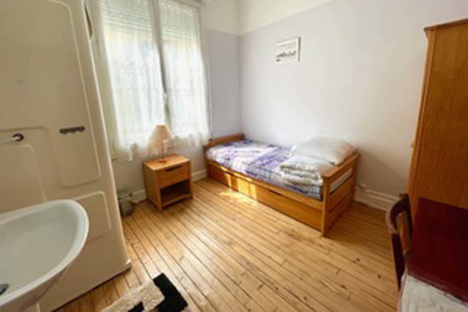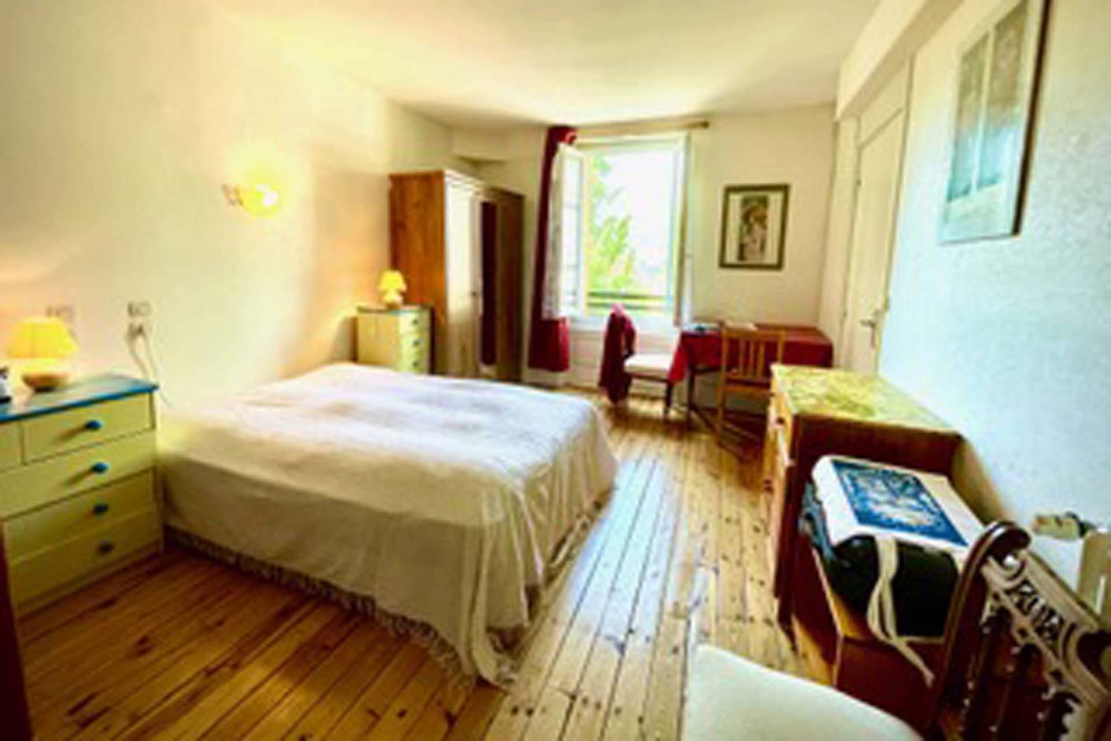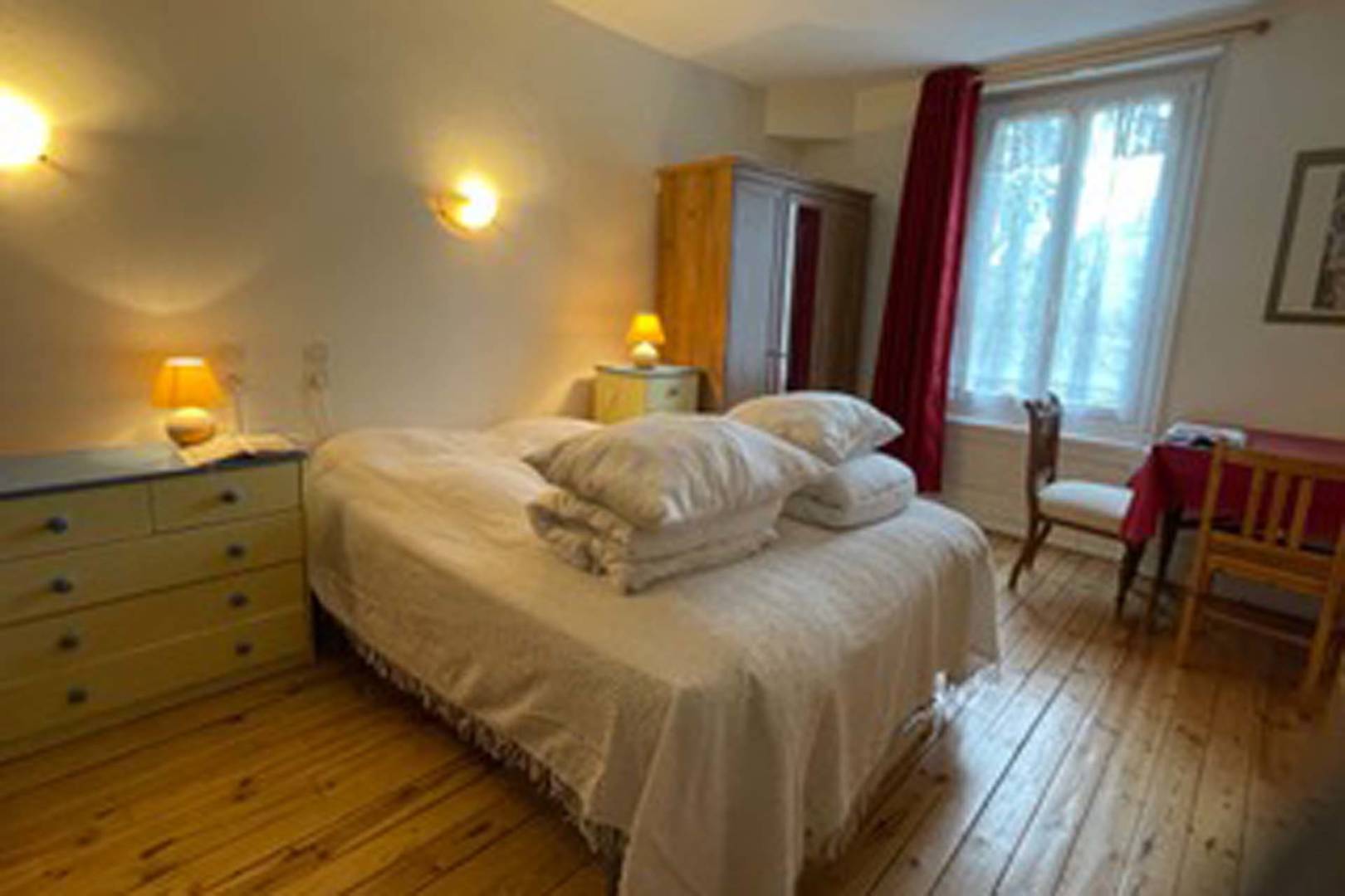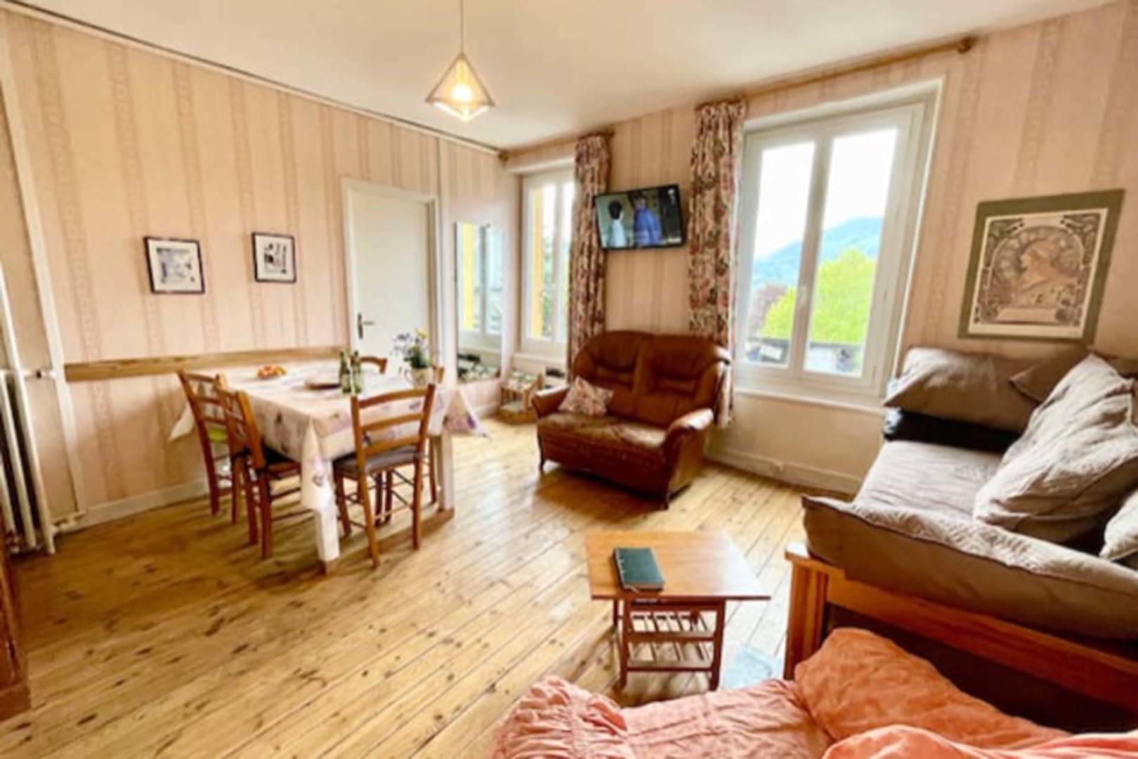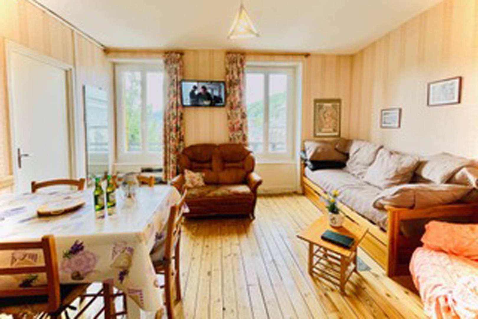 Appartement en plein centre-ville du Mont-Dore, très lumineux, face à l’église et proche de tous commerces. Chambre sur rue (15 m²) avec WC et salle de bain. Chambre sur cour avec douche et lavabo. Grand séjour avec une belle vue. 2 WC. 2 téléviseurs dont un avec grand écran plat.(…)