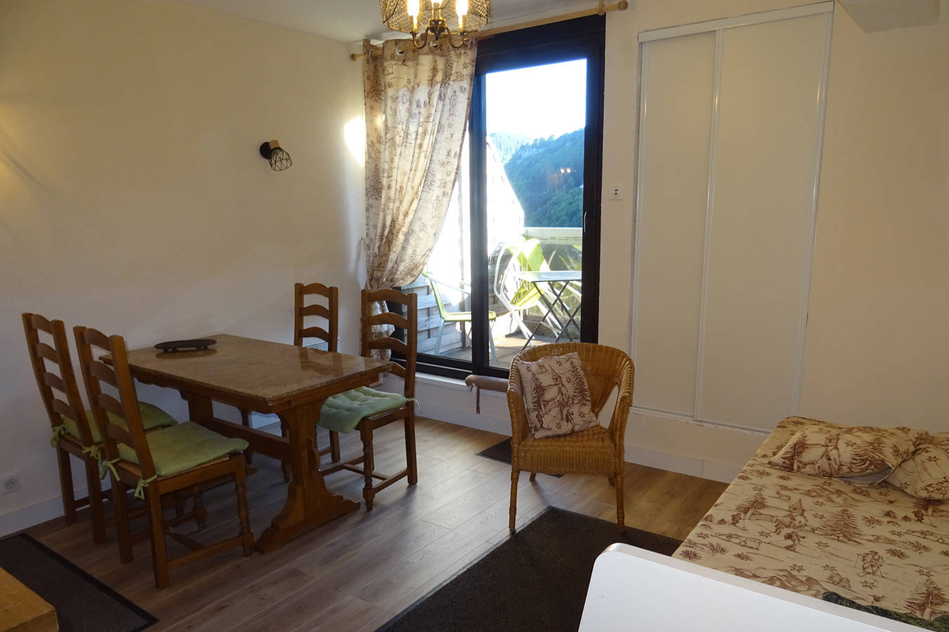 La grande baie vitrée apporte beaucoup de clarté et offre une très belle vue sur la vallée du Sancy et le village.