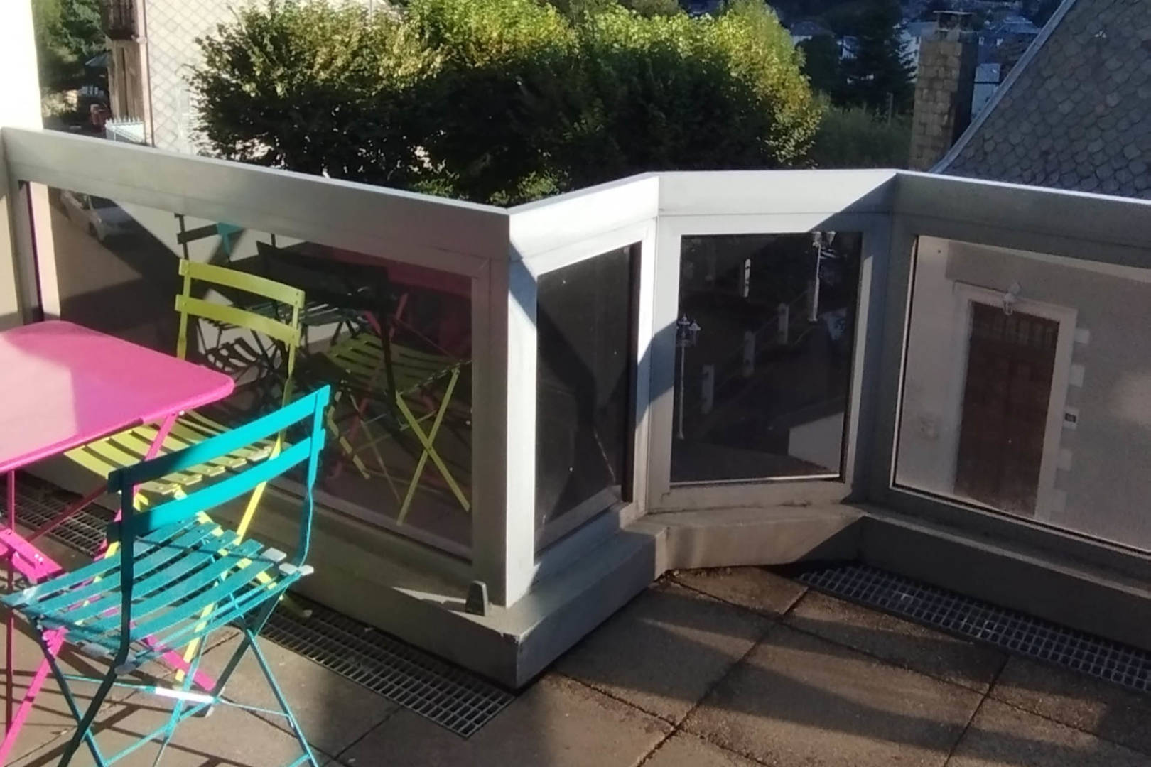 Balcon-terrasse accessible par grande baie vitrée coulissante avec deux petites tables et 4 chaises + deux transats Lafuma. Volet roulant électrique.