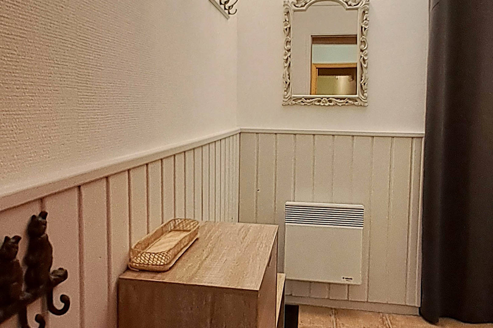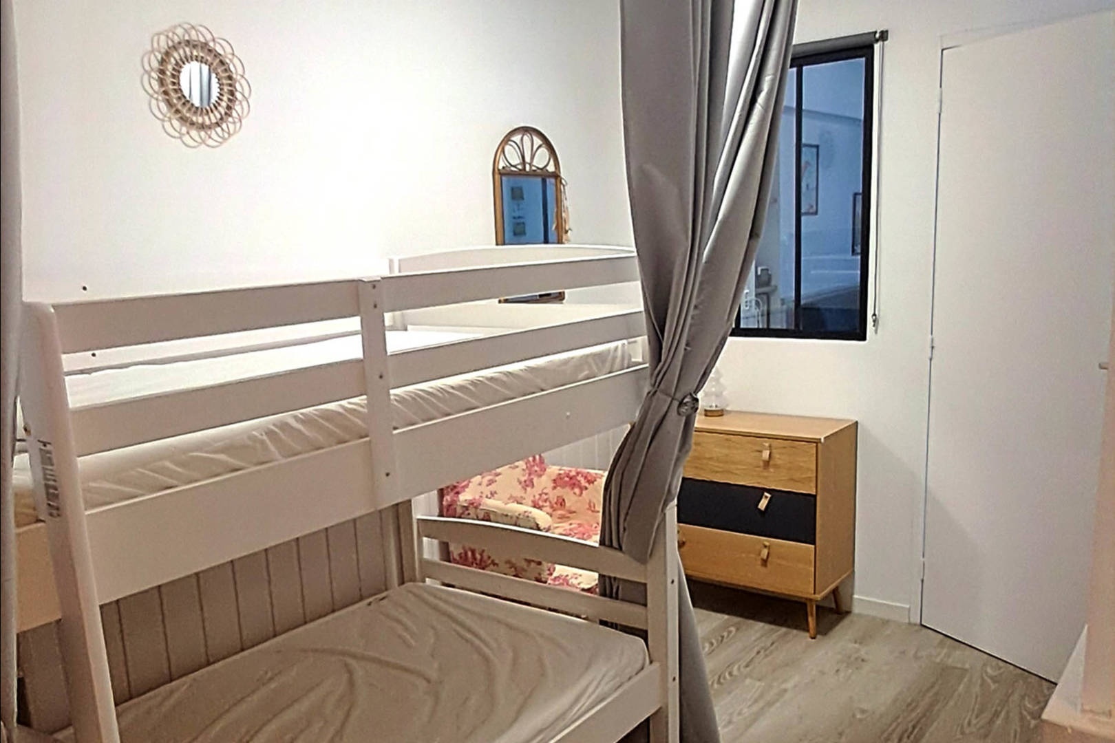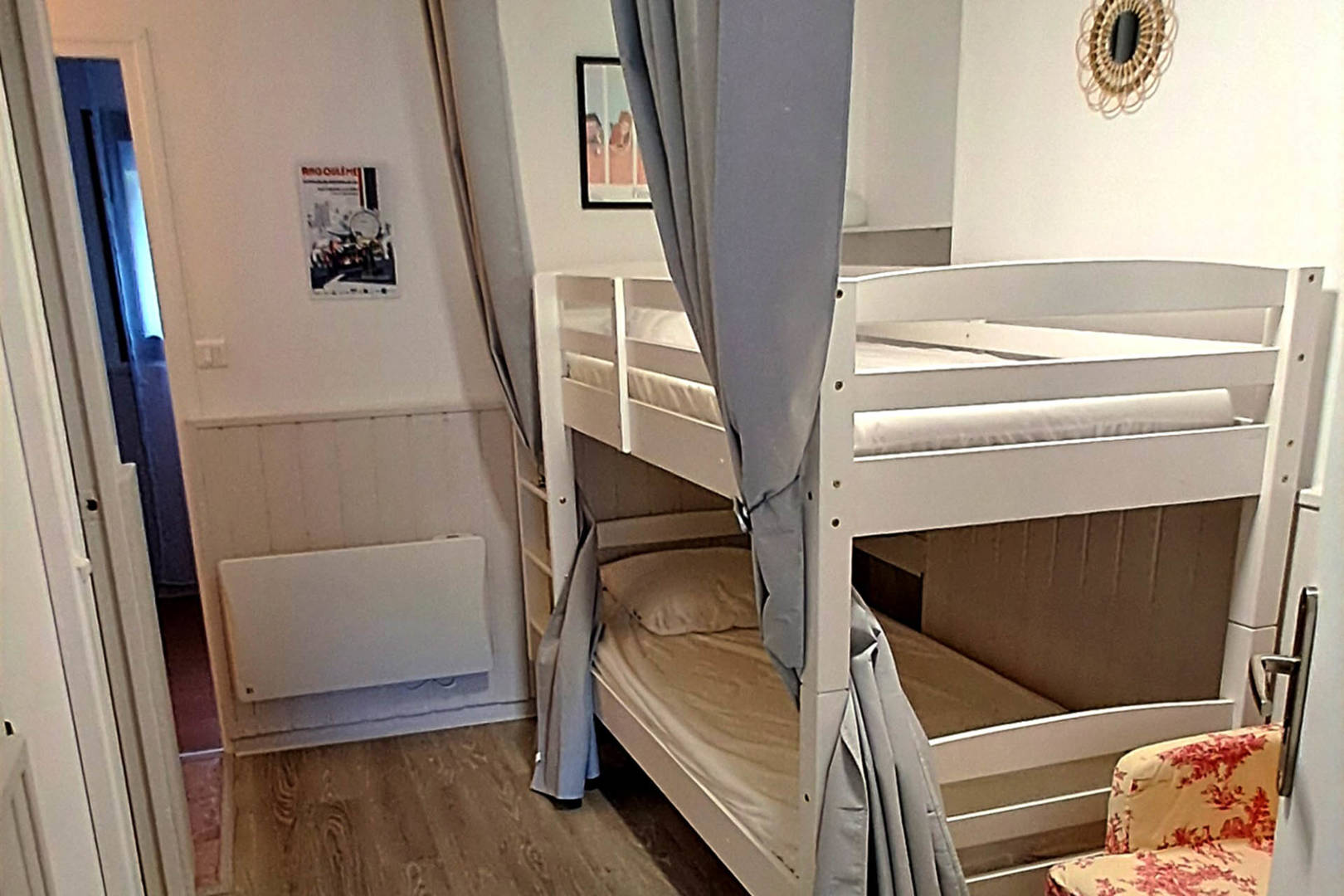 Coin montagne avec 2 lits superposés de 90 avec étagères/tables de nuit, une commode et un fauteuil. Le coin montagne est séparé de la pièce à vivre par une cloison avec une verrière et une porte.