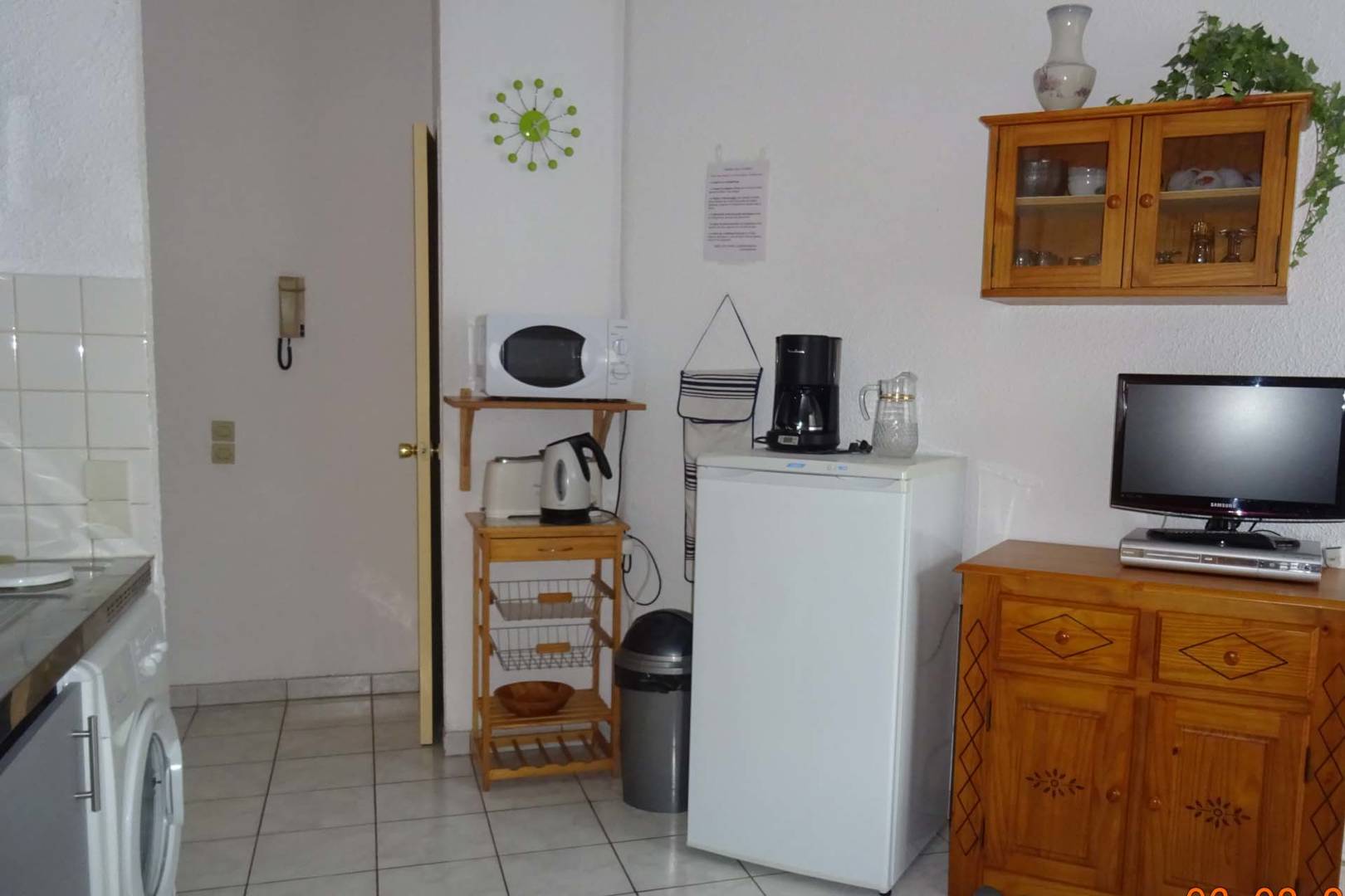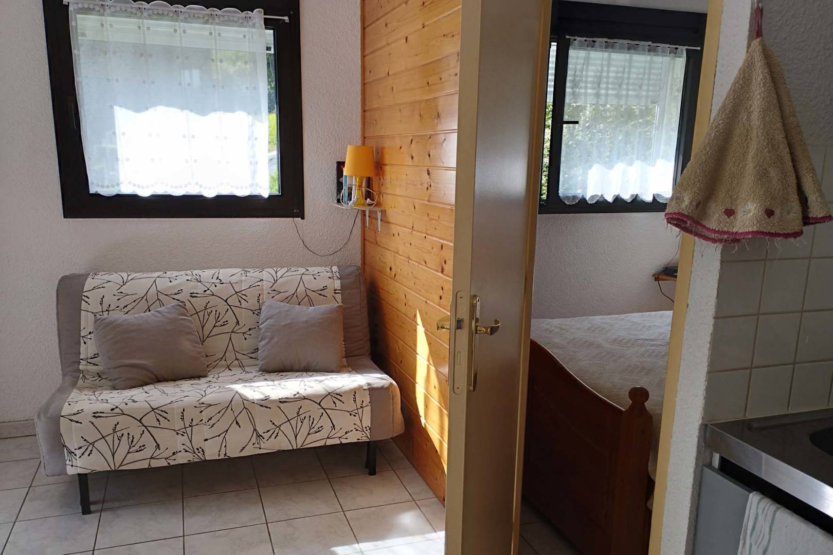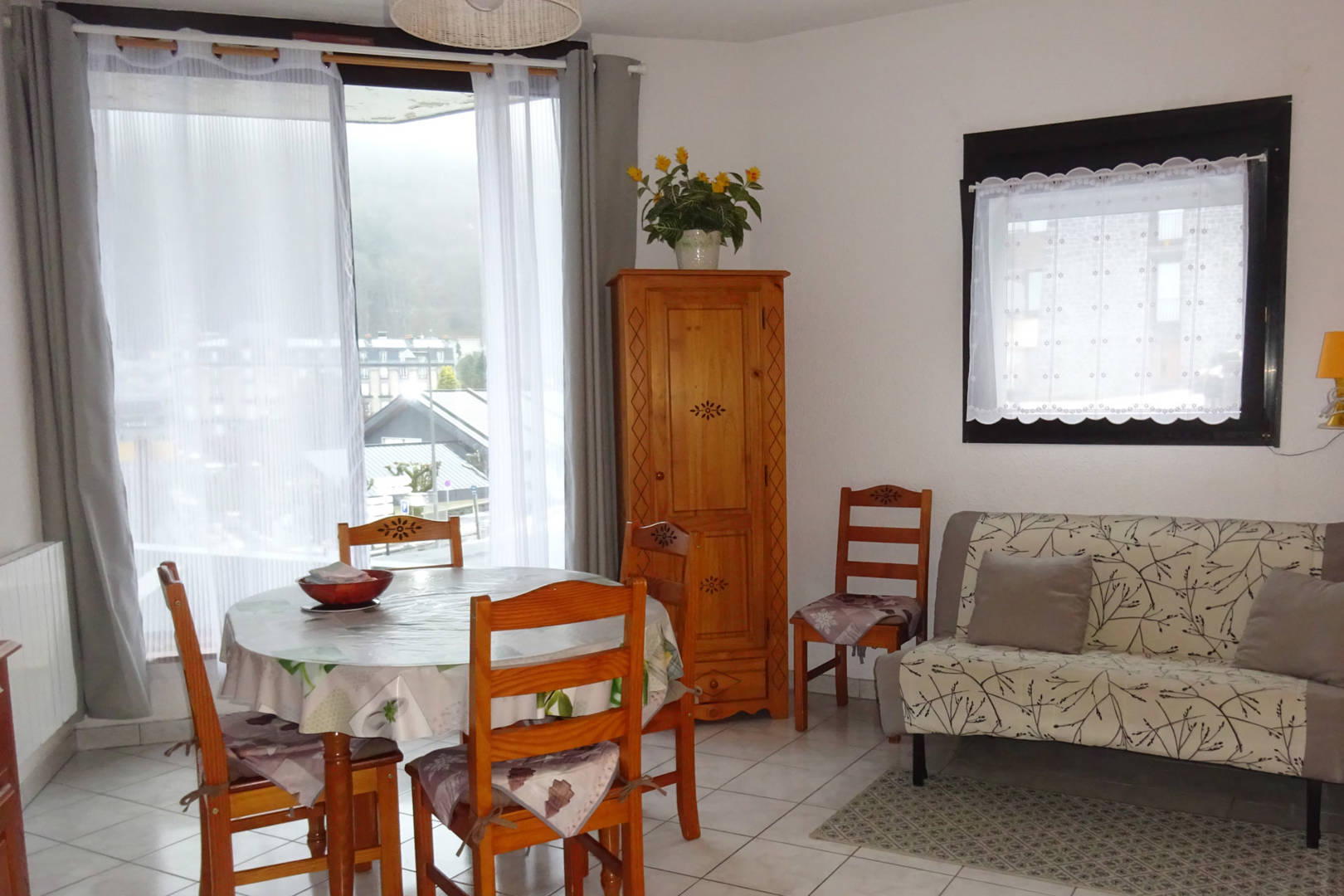 Meublé T2 de 36m² très lumineux, baie vitrée donnant sur la ville. Confortable, tout équipé, 5/6 personnes, dans une résidence privée au rez-de-chaussée de la Résidence de l’Oise, avec terrasse rez-de-jardin. Tout près du centre ville (100m), parking gratuit à proximité et vue dégagée sur le village. Composition de l’appartement : -grande pièce à vivre avec coin cuisine équipée, mini-four, micro-onde, grand réfrigérateur avec partie congélateur, grille-pain, bouilloire, cafetière, lave-linge, planche et fer à repasser, aspirateur, TV, lecteur DVD. Un BZ pour couchage 2 personnes peut être utilisé. Placards. -chambre fermée avec lit 2 personnes (literie neuve) -coin-nuit avec deux lits superposés d’une personne avec commode -salle de bains avec baignoire et WC. -local à skis individuel et local à vélos commun.