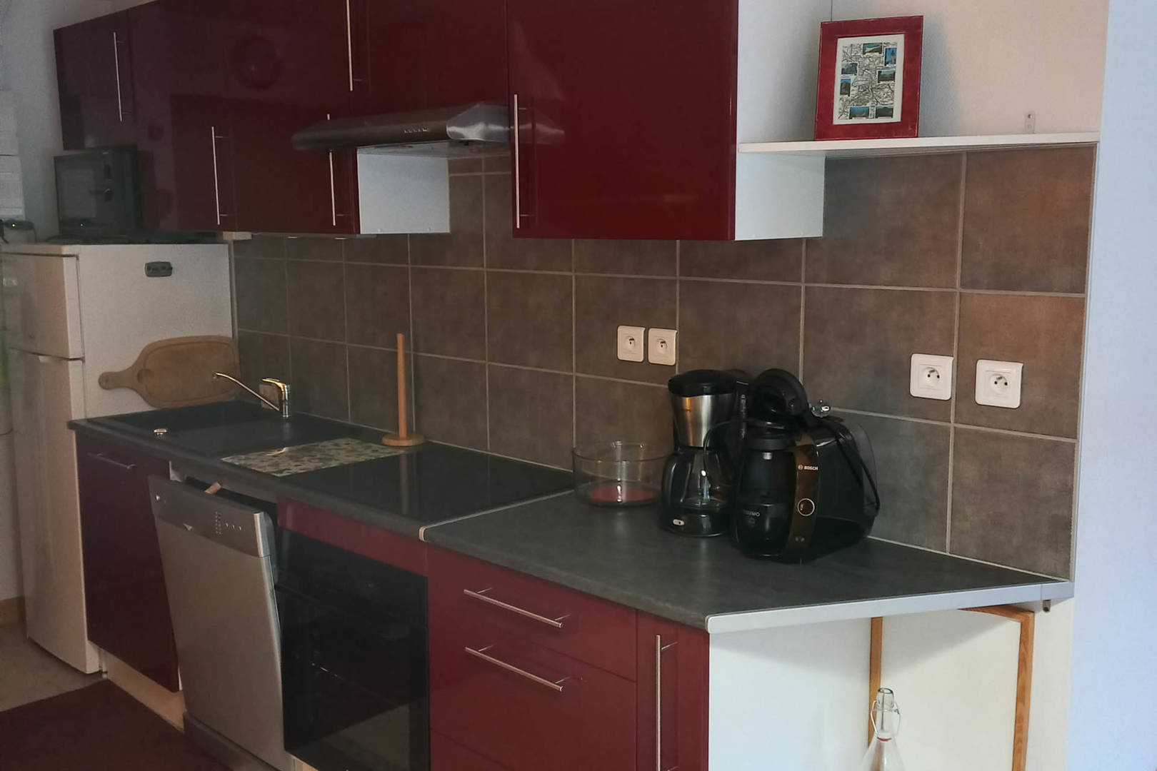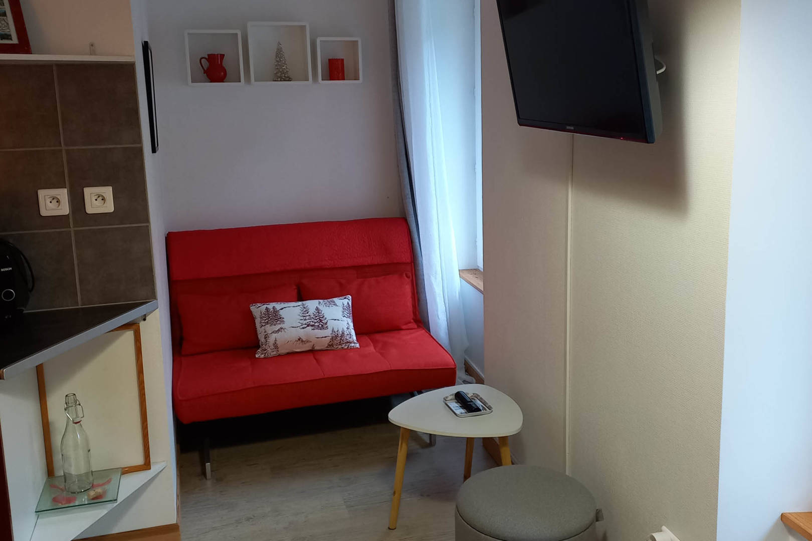 Une pièce de vie composée d’une table avec deux allonges, quatre chaises, une cuisine aménagée avec réfrigérateur/congélateur, plaque à induction, hotte aspirante, lave-vaisselle, four et micro-onde, cafetière, machine à café Tassimo, bouilloire, grille-pain, appareil à fondue, mixeur, hachoir, deux plateaux, un billot, vaisselle pour quatre personnes et ustensiles de cuisine, aspirateur balai, pelle et balayette, balai, escabeau, balai brosse, un canapé, un petite table basse, un pouf, une lampe sur pied, une télévision écran plat, une coupe à fruit, une esquisse et deux affiches encadrées, deux portes clés cœur, un vase, une pendule, des objets de décoration et une poubelle de 30 L.