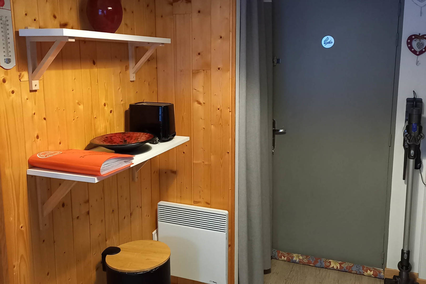 Une entrée avec penderie et cintres, service à raclette, grille viande, table et fer à repasser, range chaussures et un tapis.