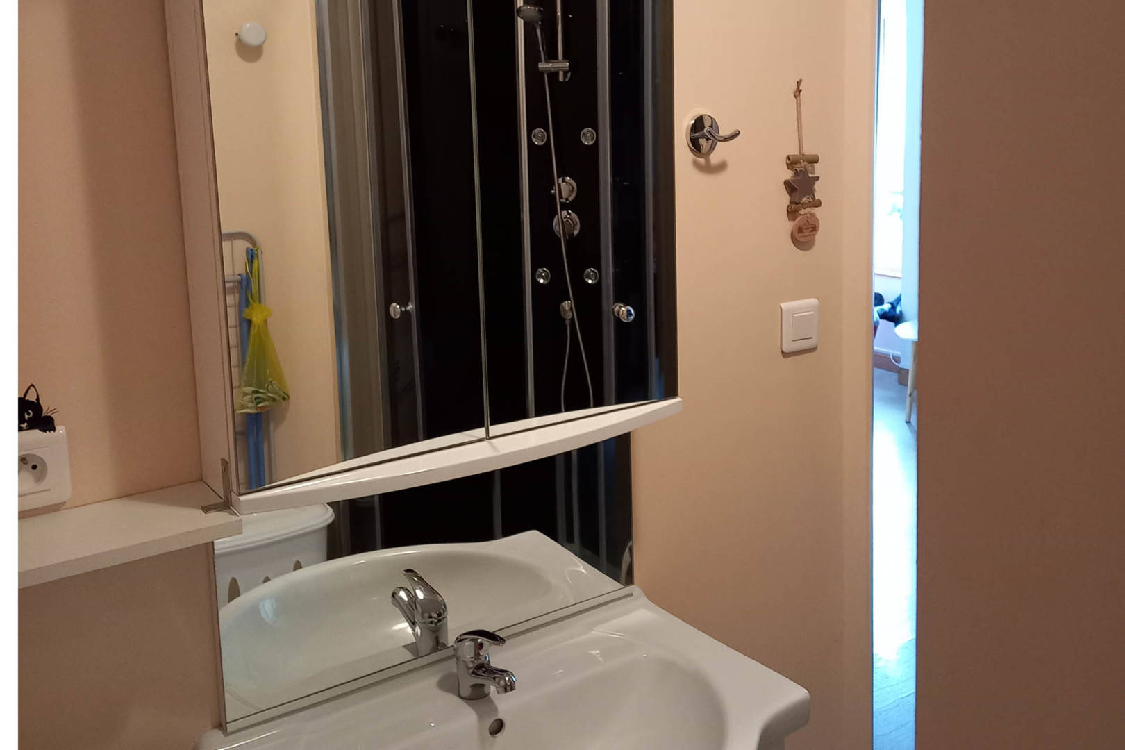 Une salle de bain avec WC et cabine de douche avec raclette et étagère suspendue, meuble vasque, WC avec balayette, sèche-serviettes, étendoir mural, étendoir mobile, pinces à linge, lave-linge, panière à linge, sèche-cheveux, seau et balai Vileda.