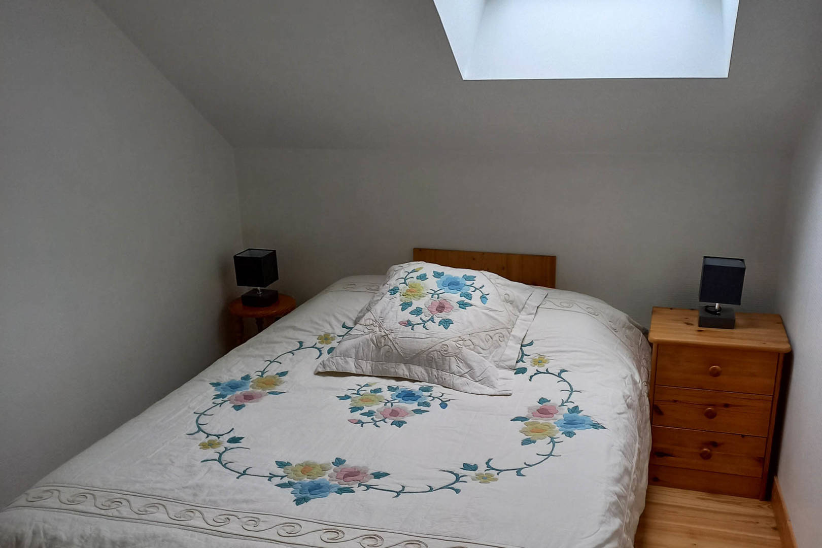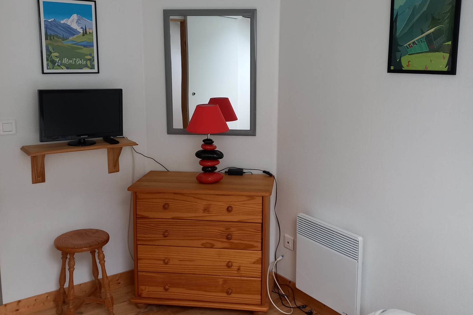 A l’étage, une chambre individuelle avec lit deux personnes 140×190 cm, TV écran plat, deux tabourets, un chevet, une commode, un miroir, porte manteau mural, deux cadres avec affiche, deux lampes et un radio réveil.