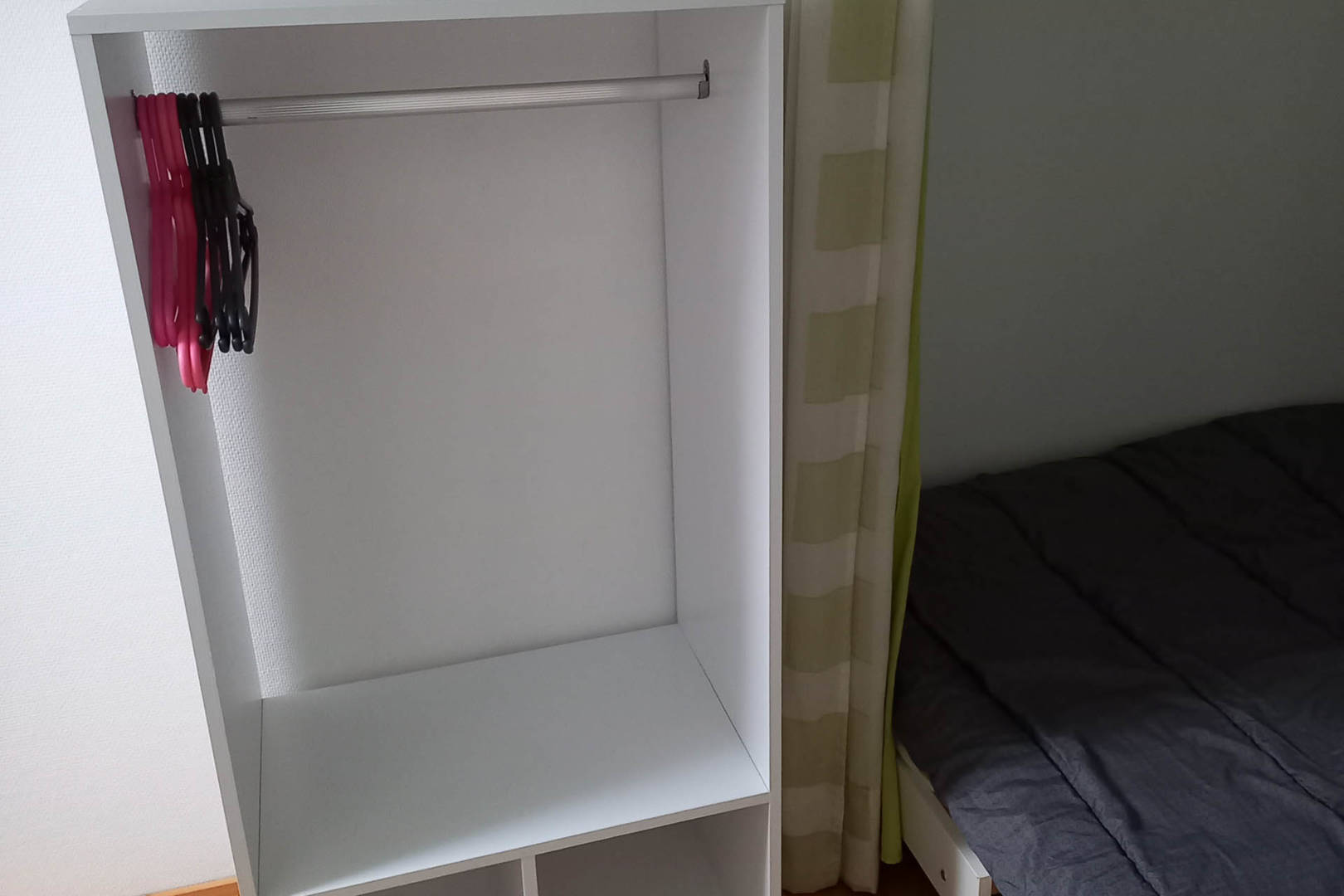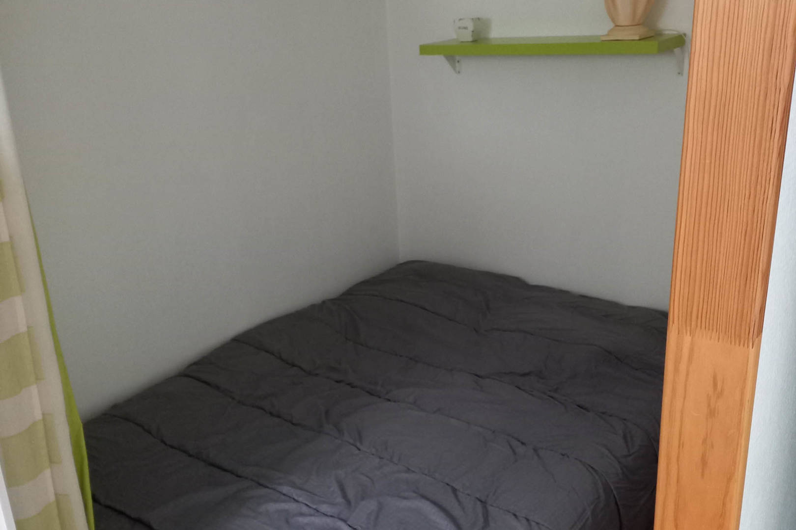 Un coin nuit sur le palier avec un lit de 140×190 cm, étagère murale, lampe à poser, un miroir, une penderie, un tableau déco, un tableau magnétique et petit bac vert anis.