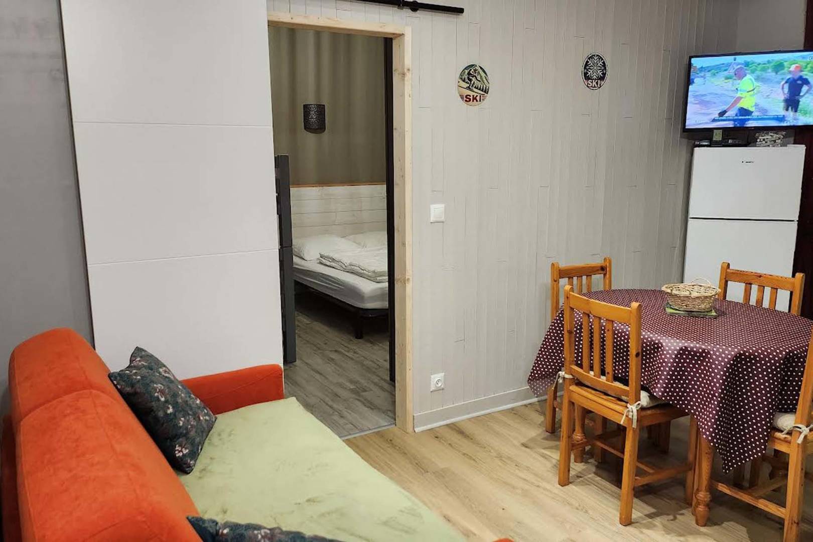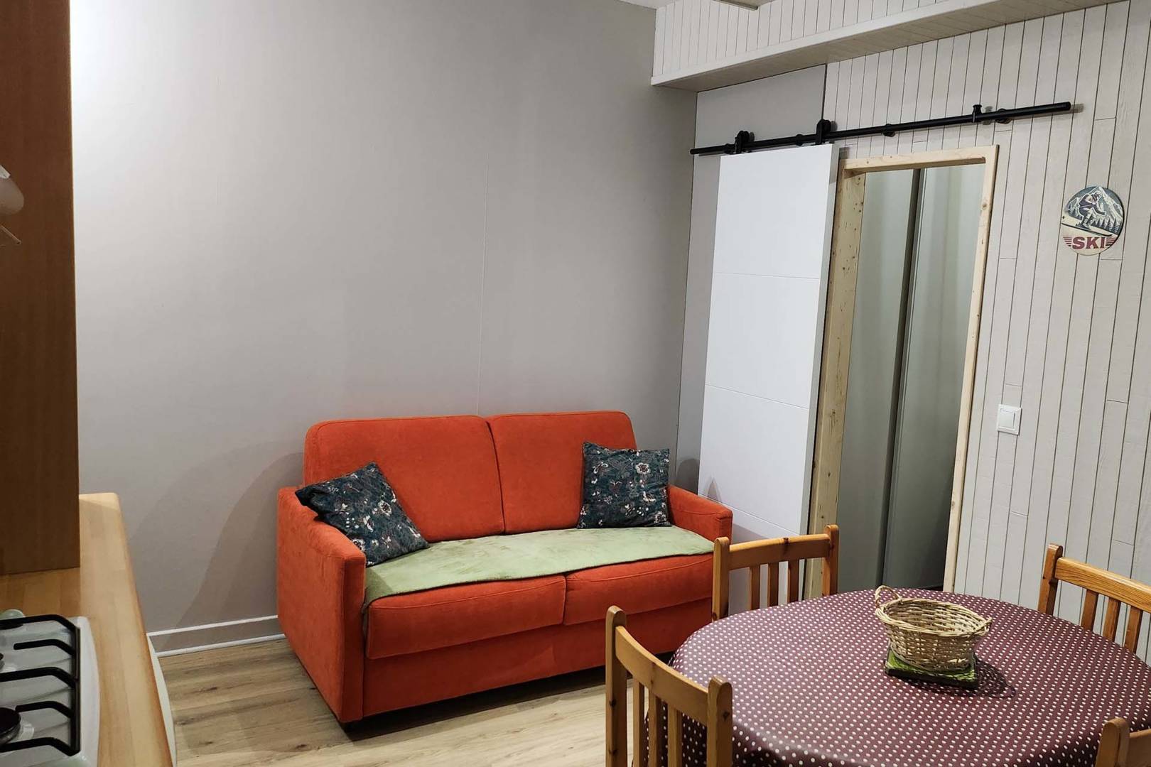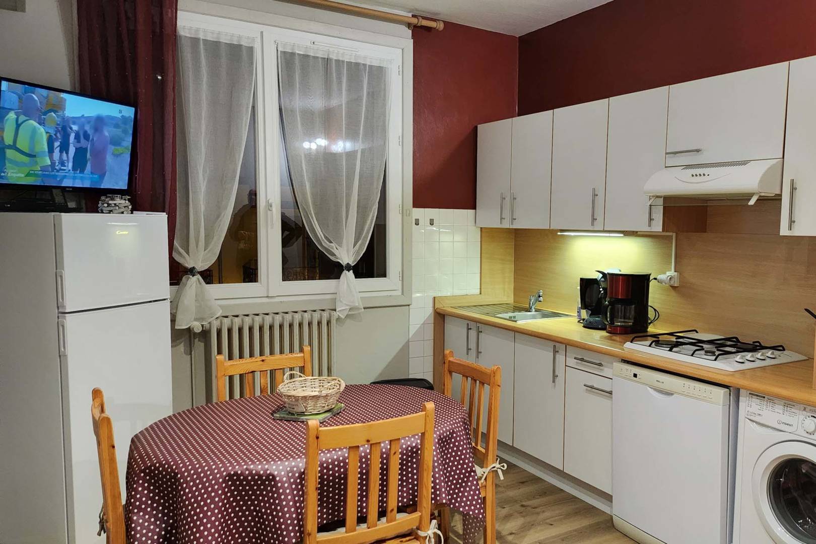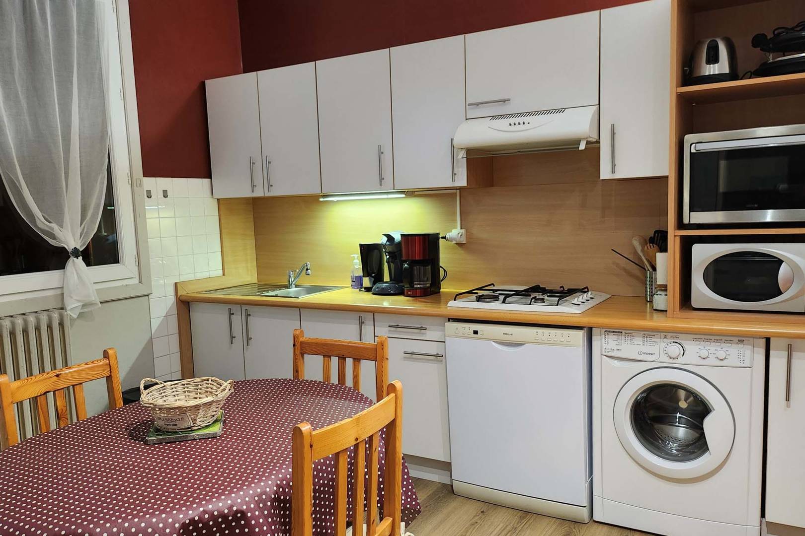 – D’une agréable pièce à vivre avec cuisine entièrement équipée lave-vaisselle, lave-linge, réfrigérateur-congélateur, four, micro-onde, machine Senseo, cafetière filtre, bouilloire, grille-pain, appareil à raclette et coin salon avec canapé convertible et connexion Wi-Fi.