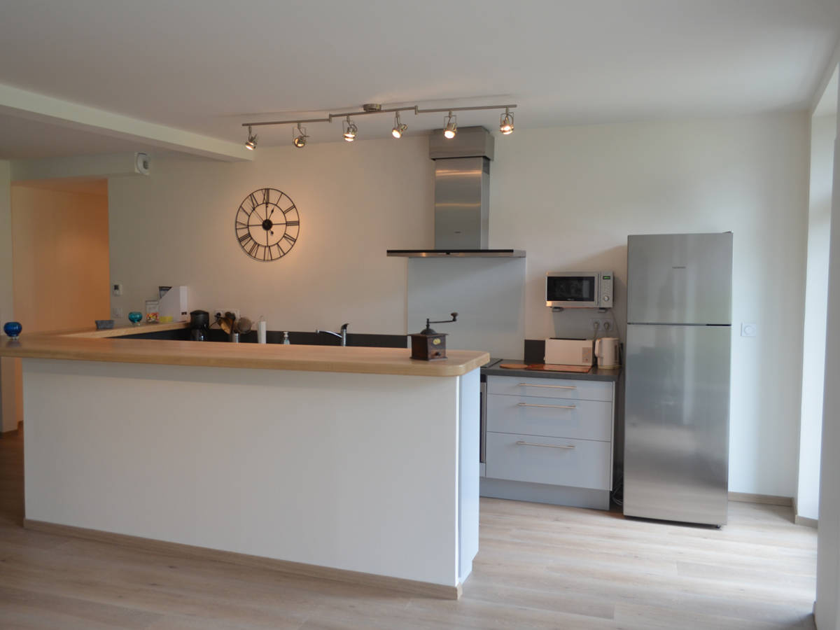 La cuisine « américaine » bénéficie de très nombreux rangements et d’un vaste plan de travail, elle est totalement équipée d’électroménagers intégrés :