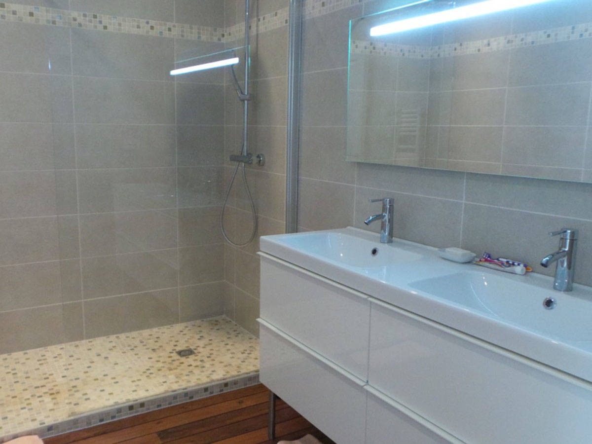 Elle comprend un meuble à quatre tiroirs qui supporte deux vasques, d’un miroir éclairant sur toute sa longueur, une douche à l’italienne avec pomme « pluie » ainsi qu’une douchette multifonctions alimentées par un mitigeur thermostatique.