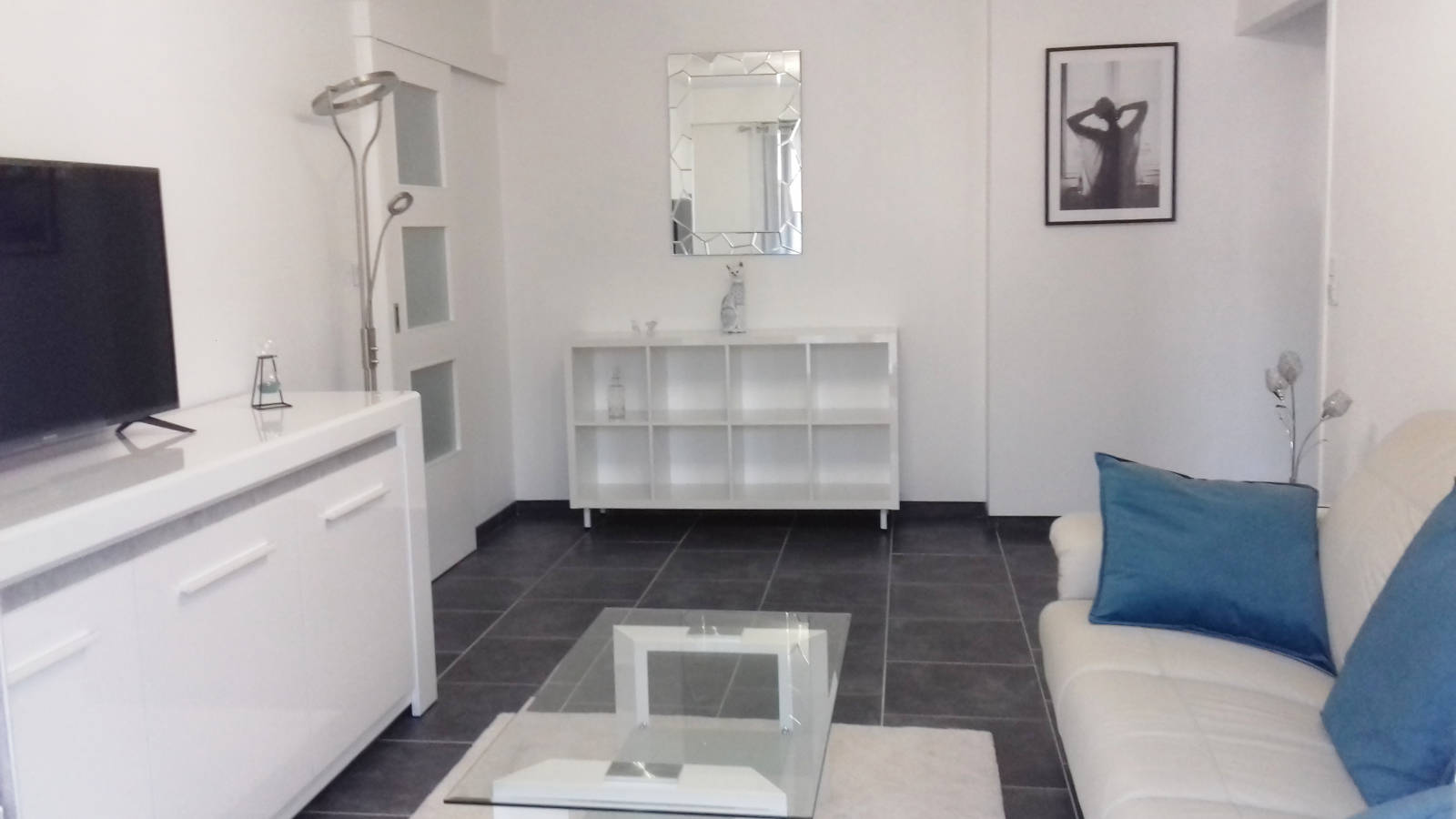 Appartement au 1er étage. Chambre lit 140 avec grand rangement. Salle de bain avec douche à l’italienne. WC séparés – Séjour et cuisine complétement équipés à neuf – Ascenseur, parking, garage. Store pour protéger du soleil sur la totalité du balcon.